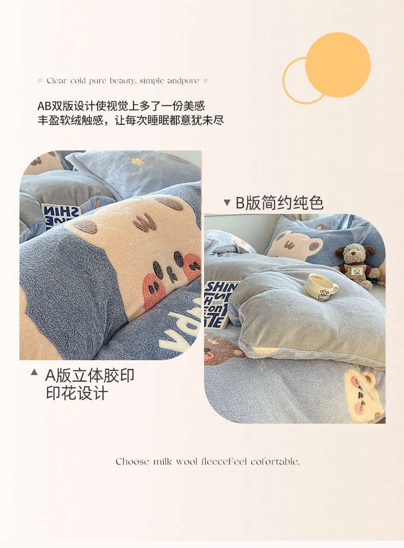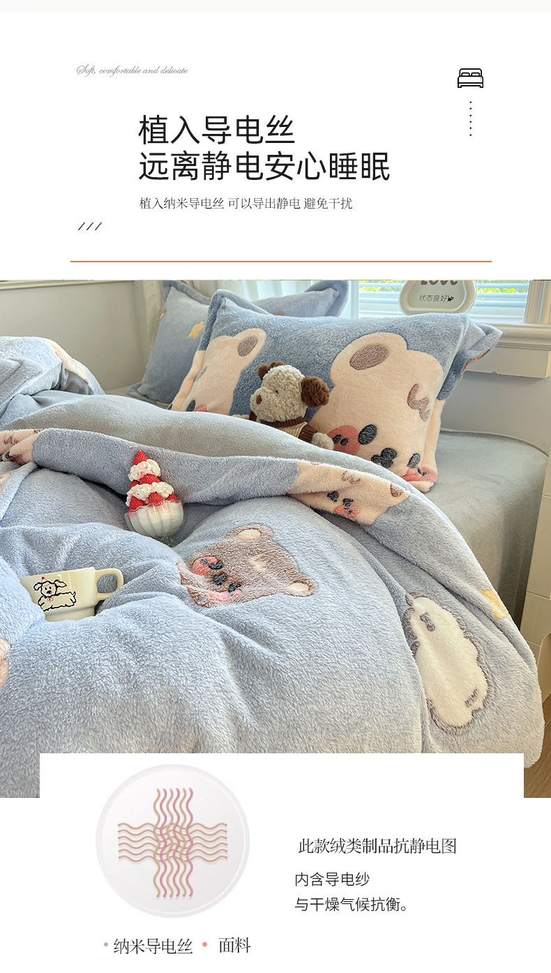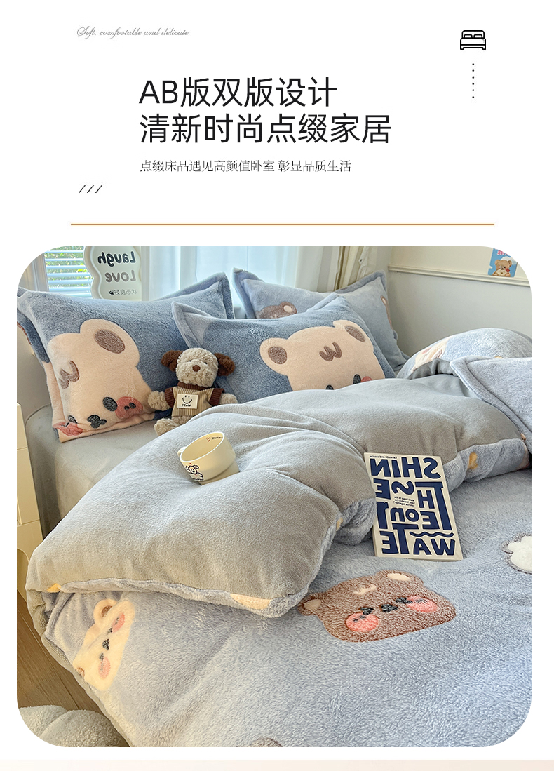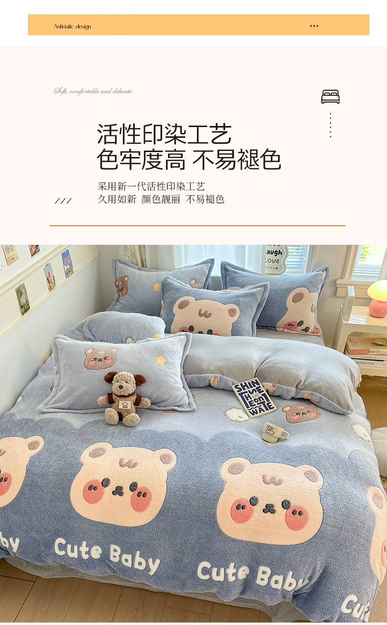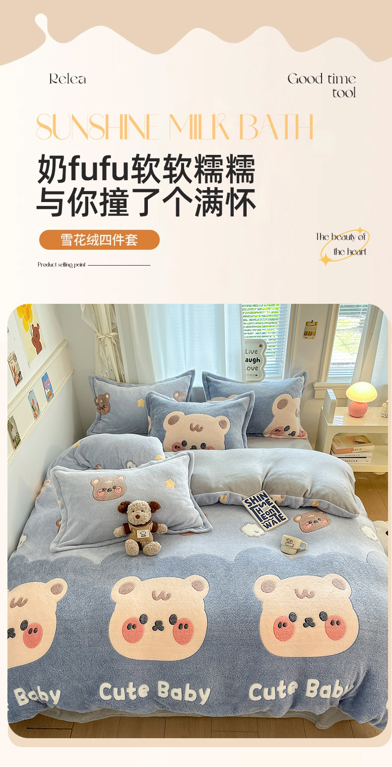 当前位置: 91家纺网 > 商品网购 > 床品套件 > 四件套 > 法莱绒四件套 > 川悦生活 2025新款立体雪花绒印花大床四件套系列一场景二 熊小巴