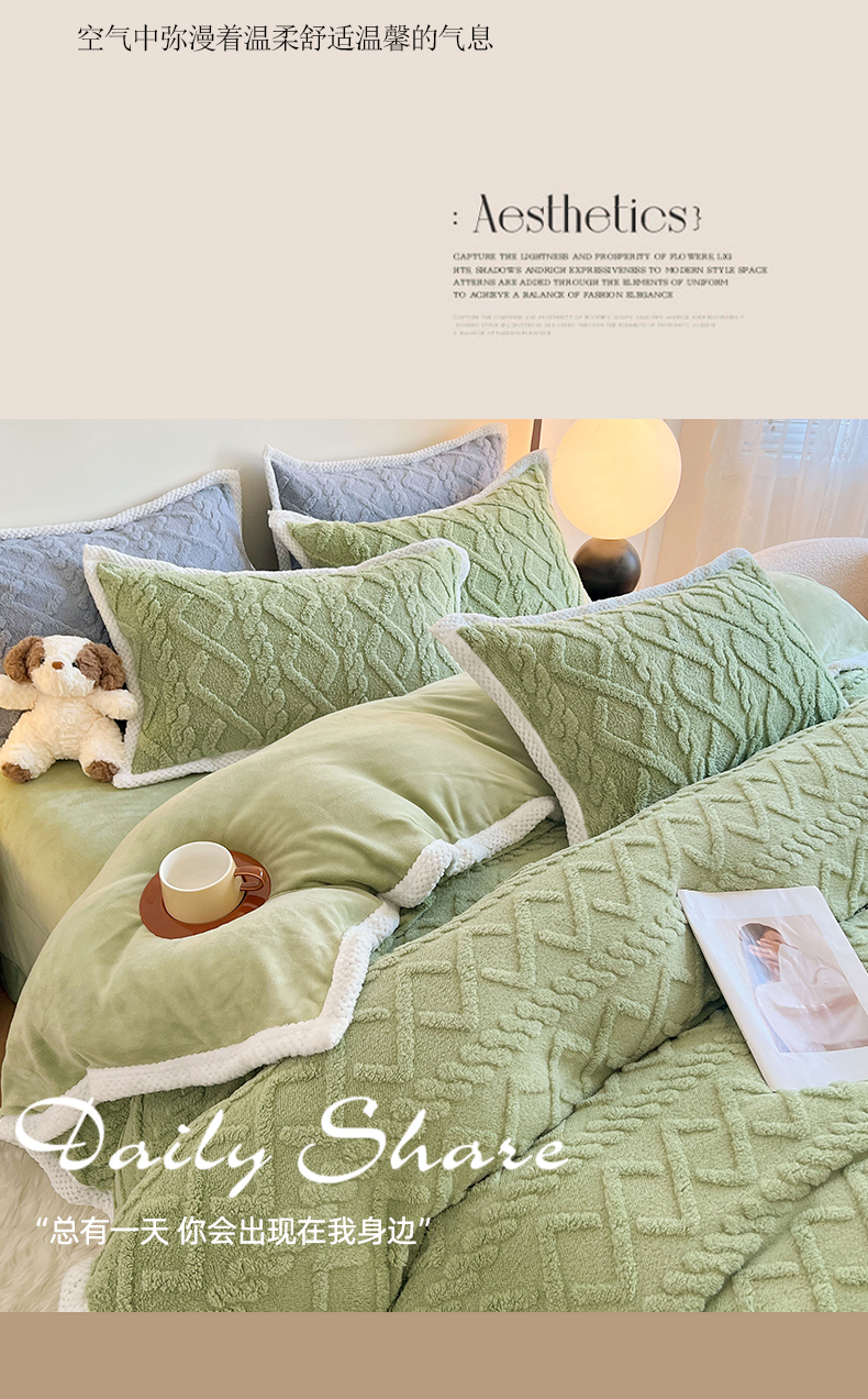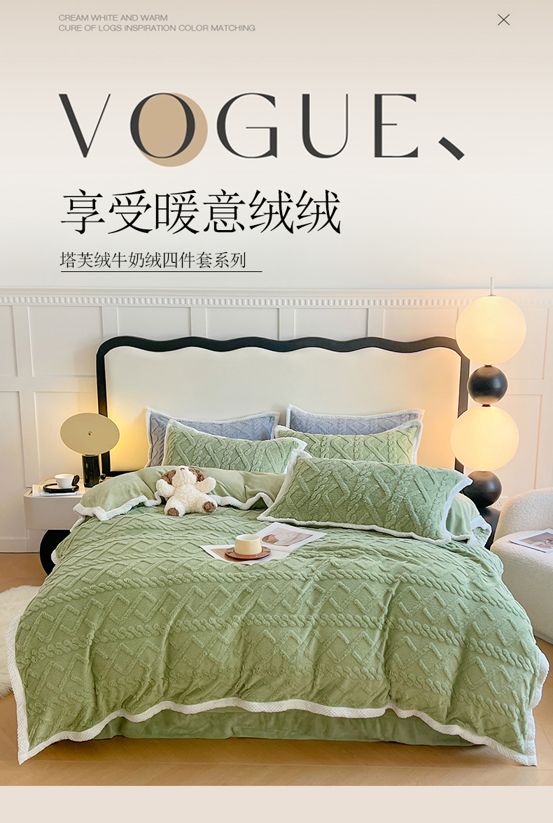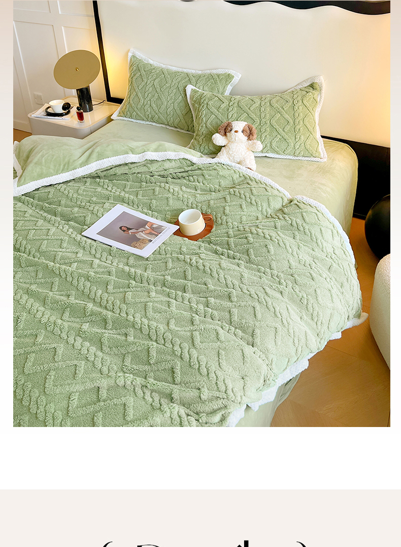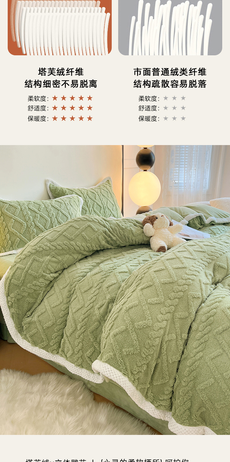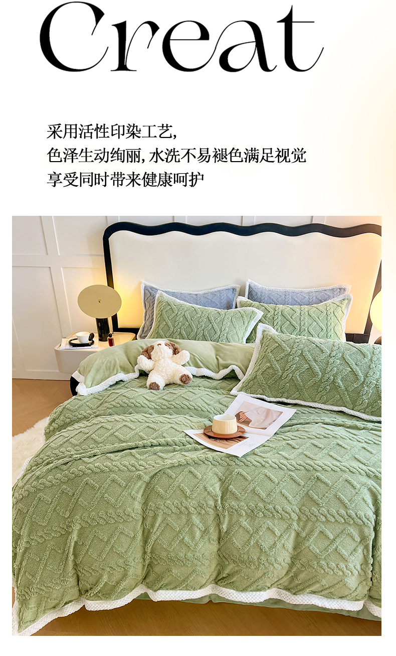商品名称:悦织湾家纺 轻奢塔芙绒菱形格纯色牛奶绒四件套2025新款床上用品加厚保暖4件套 曼巴绿