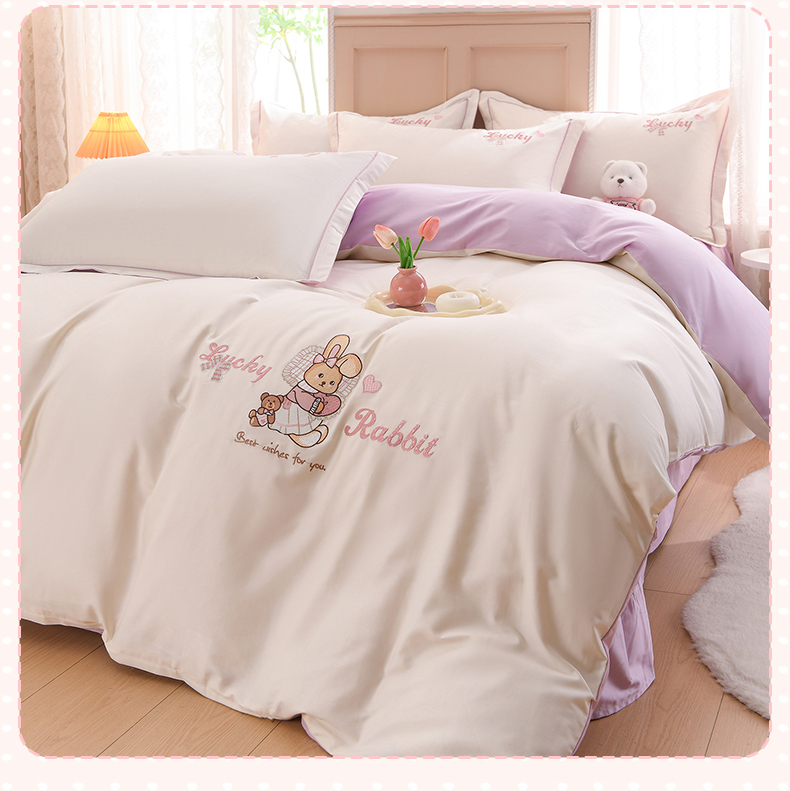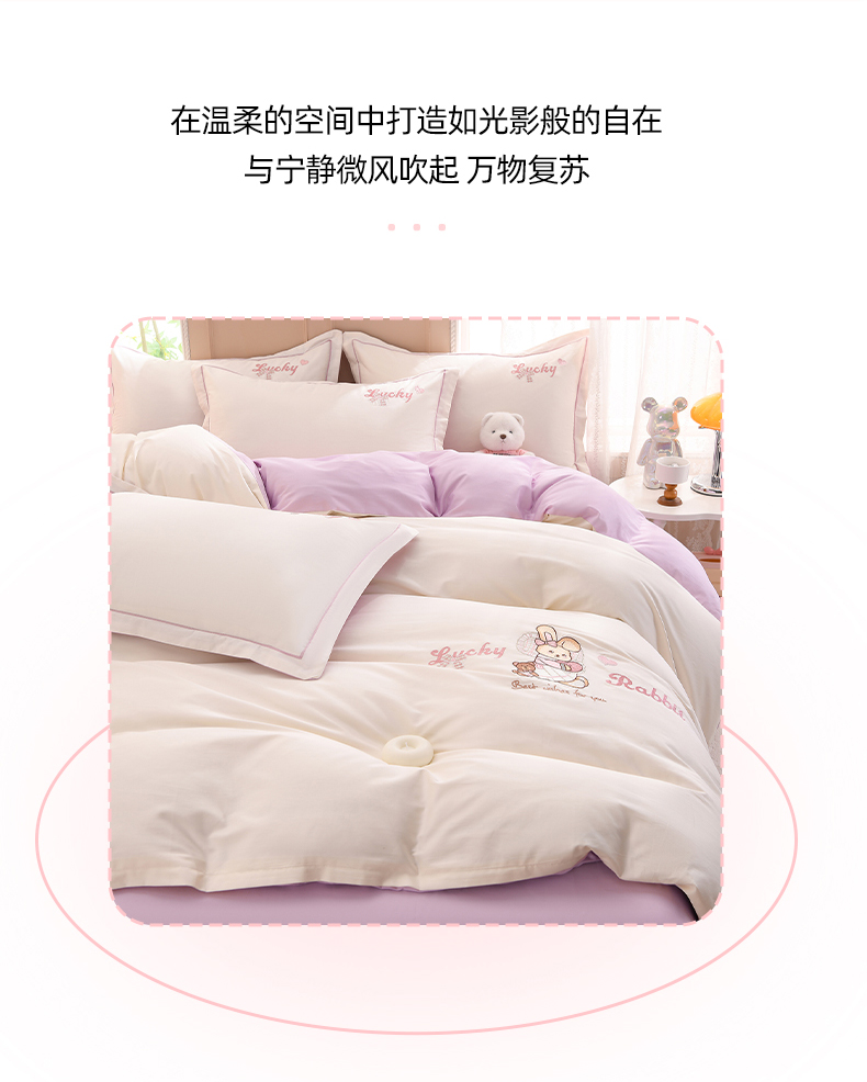 绒小宣 2025新款13372全棉绣花四件套-梦幻兔 兔熊-白紫