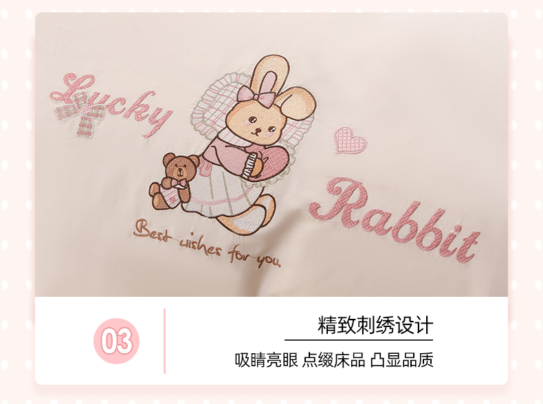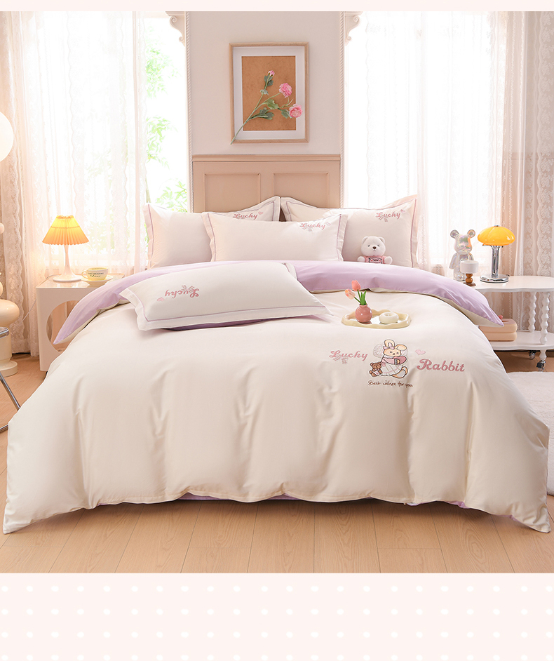 商品名称:绒小宣 2025新款13372全棉绣花四件套-梦幻兔 兔熊-白紫