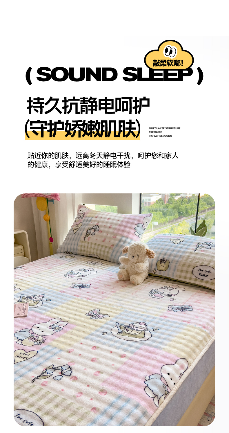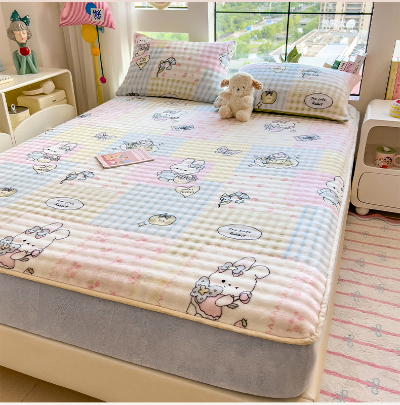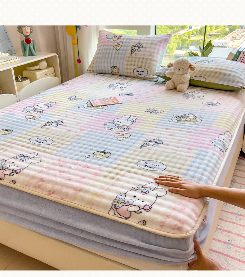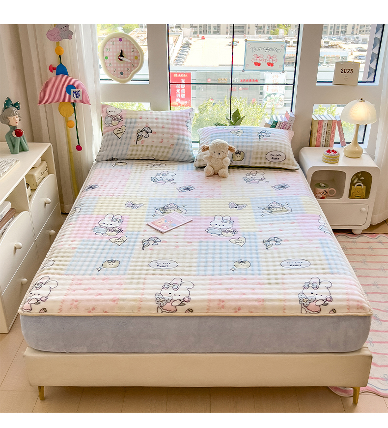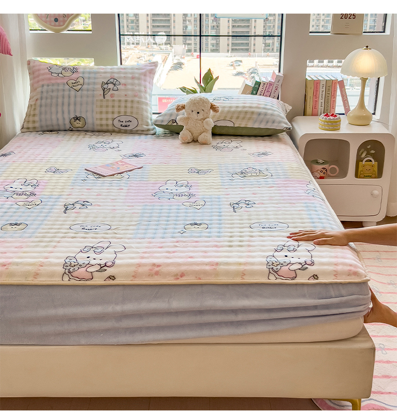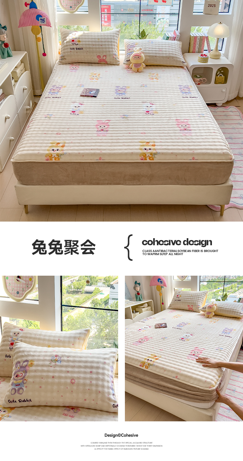 • 91家纺网 家纺一手货源 找家纺 摩妮卡 2025新款加厚牛奶绒泡泡绒床笠三件套 可爱兔兔