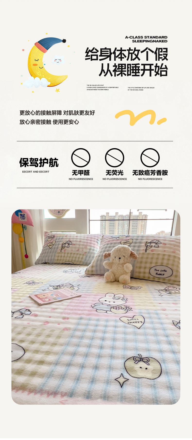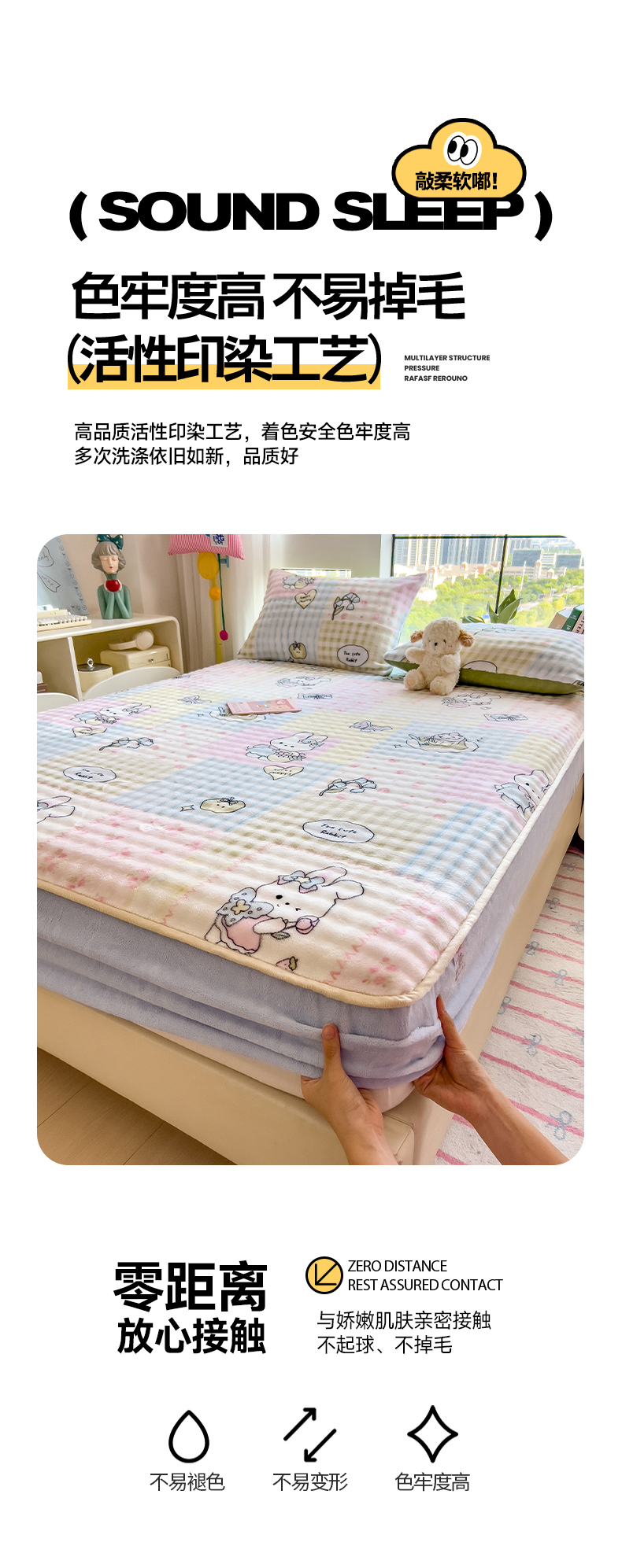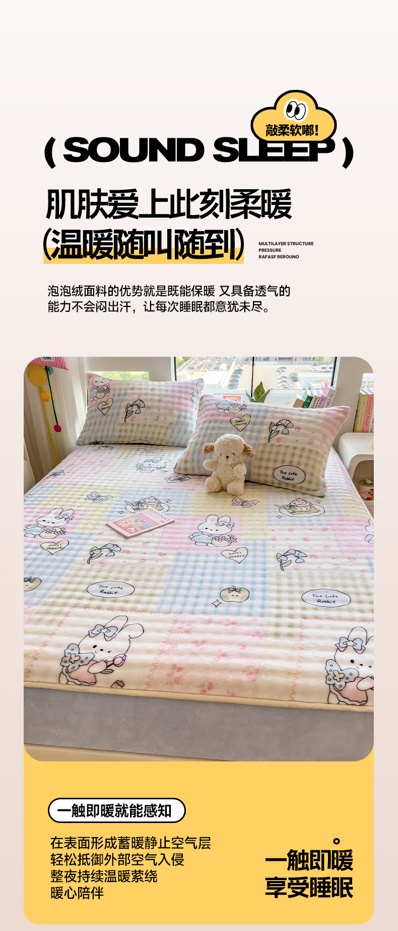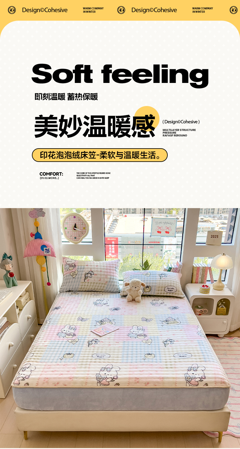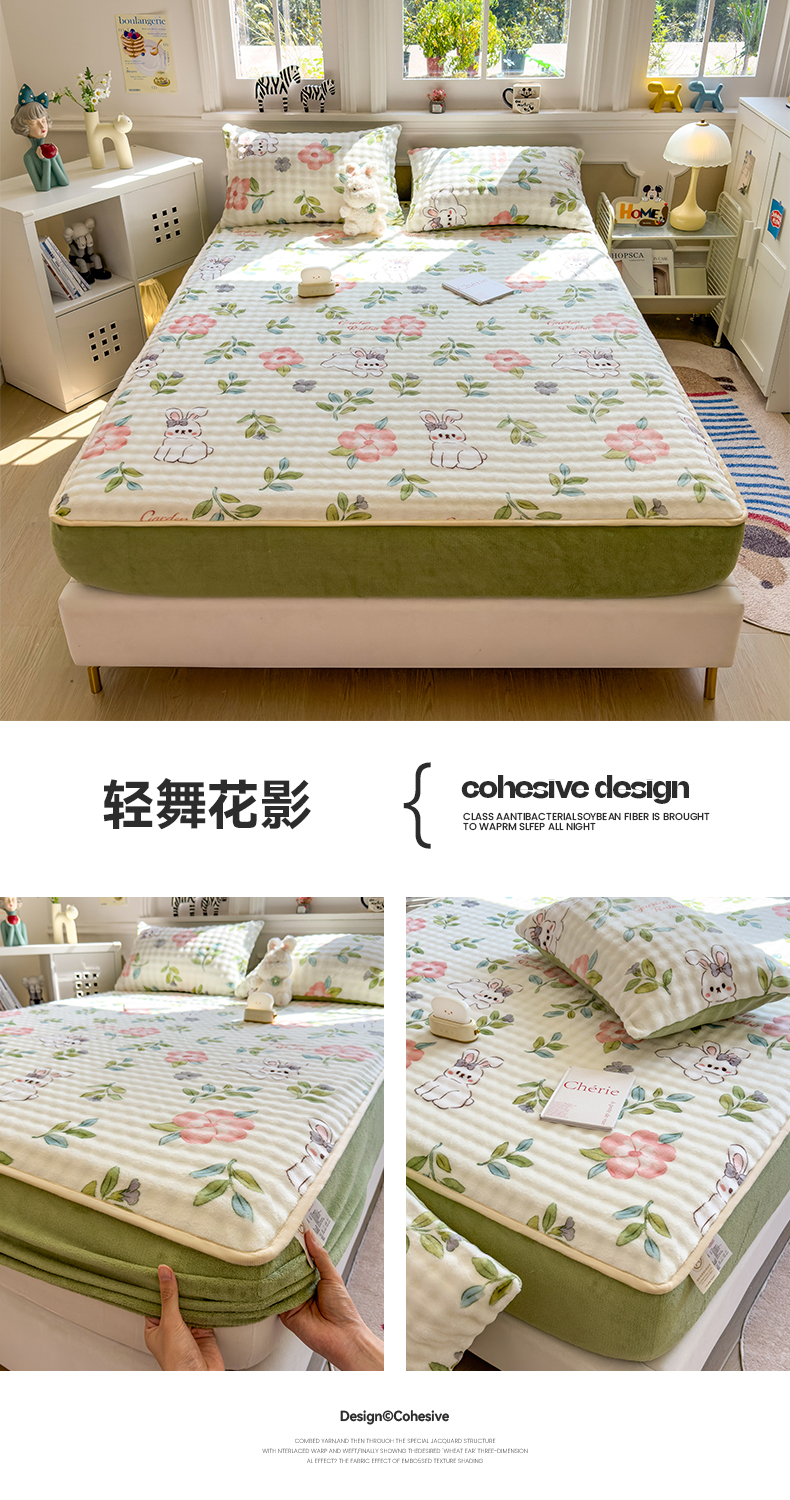 • 91家纺网 家纺一手货源 找家纺 摩妮卡 2025新款加厚牛奶绒泡泡绒床笠三件套 可爱兔兔