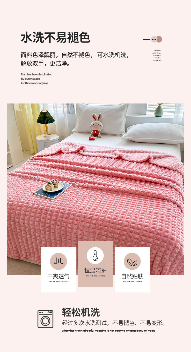 商品名称:栩裕纺织 2025春夏新款仿裘皮格子抽条毛毯-卷边款 玫瑰粉