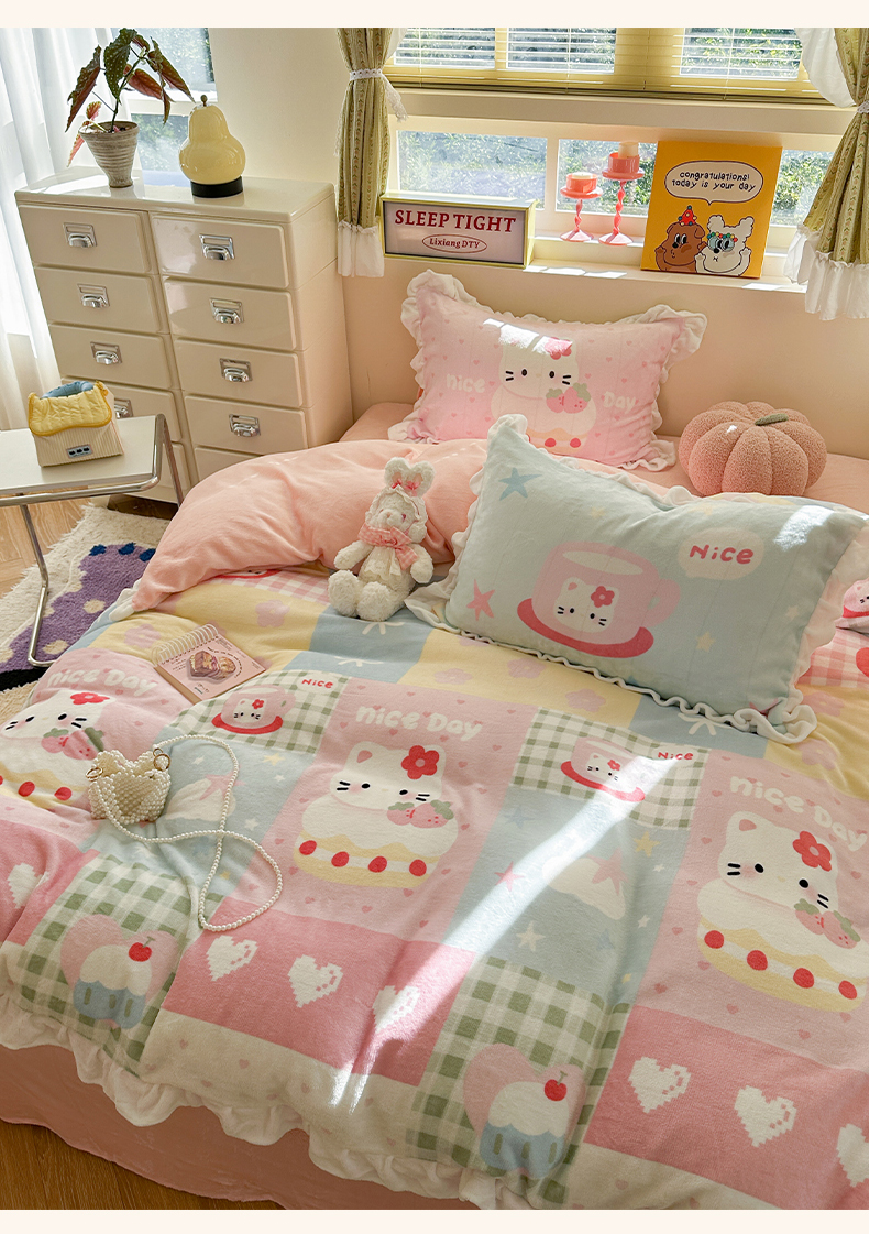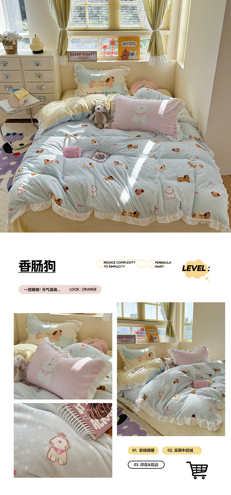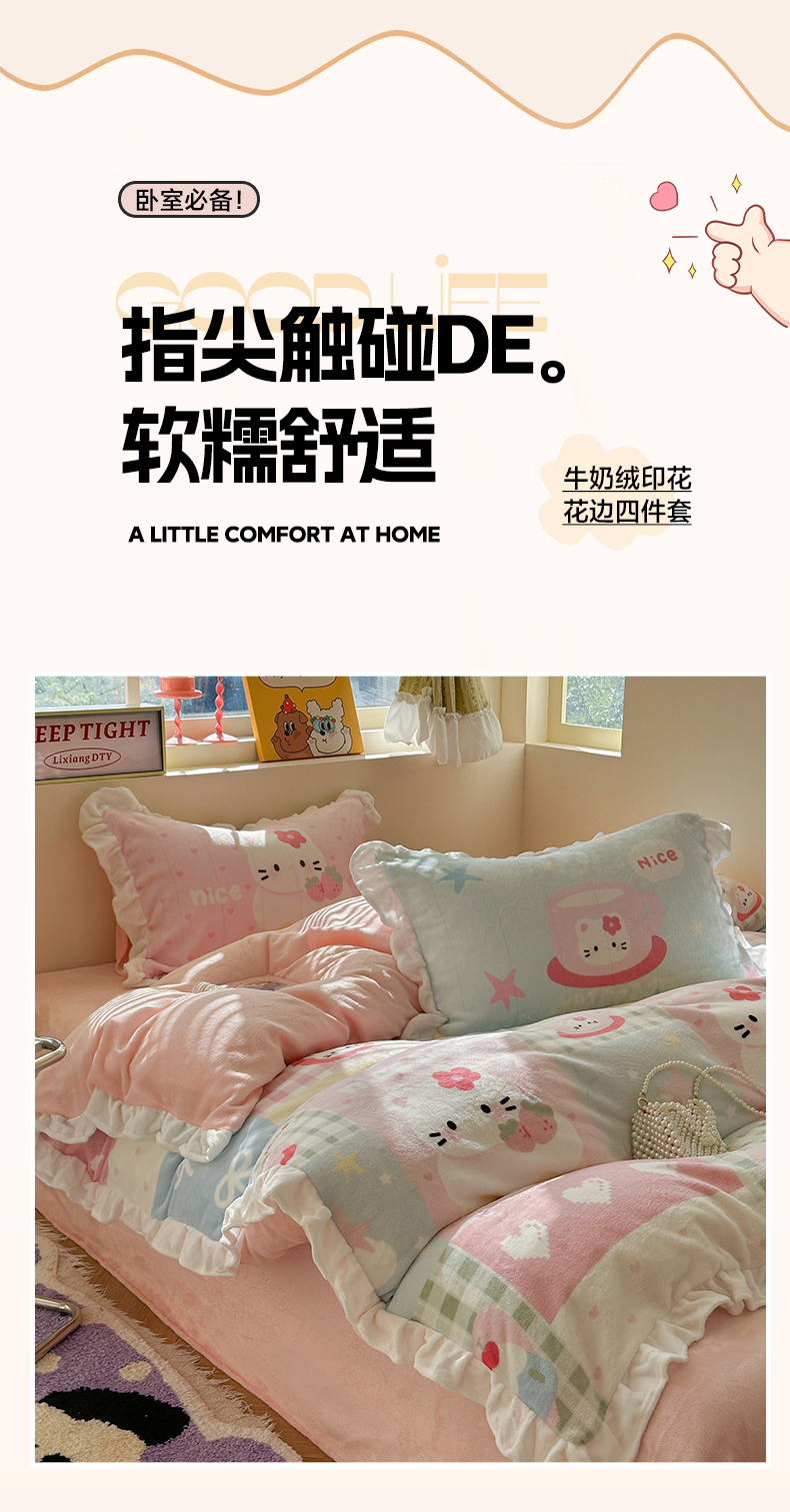 当前位置: 91家纺网 > 商品网购 > 床品套件 > 四件套 > 牛奶绒四件套 > 美乐迪家纺 2025新款加厚牛奶绒花边四件套 甜品小兔