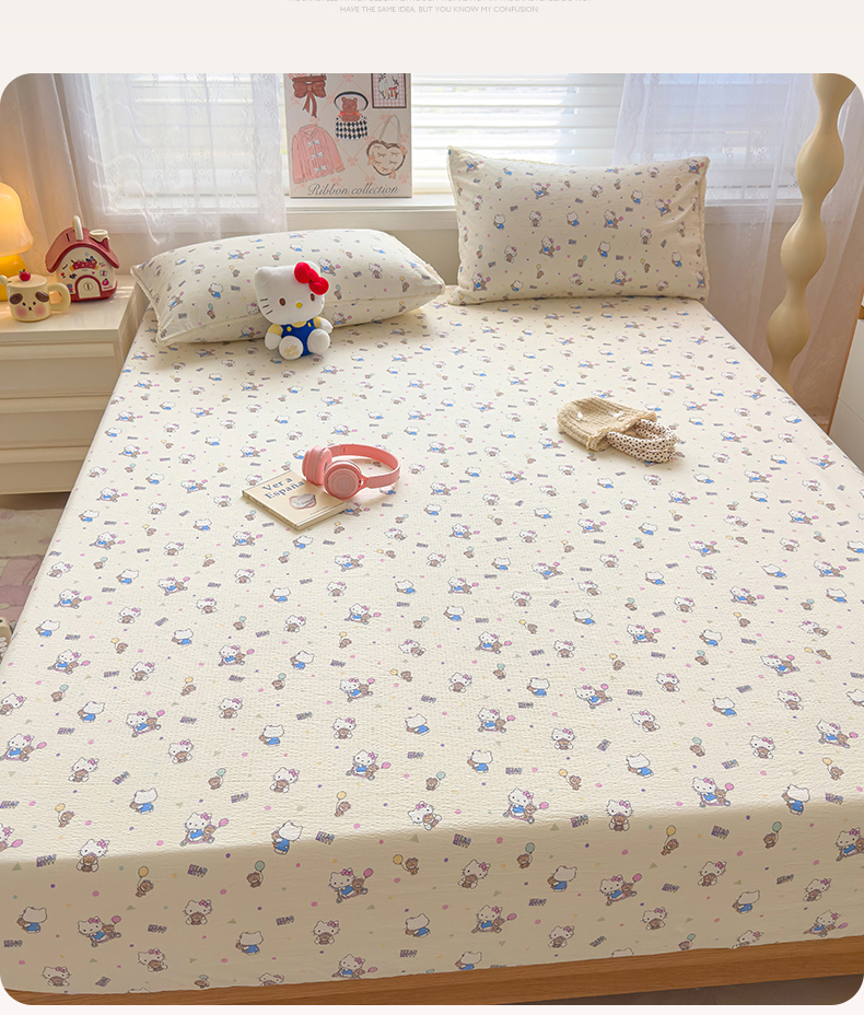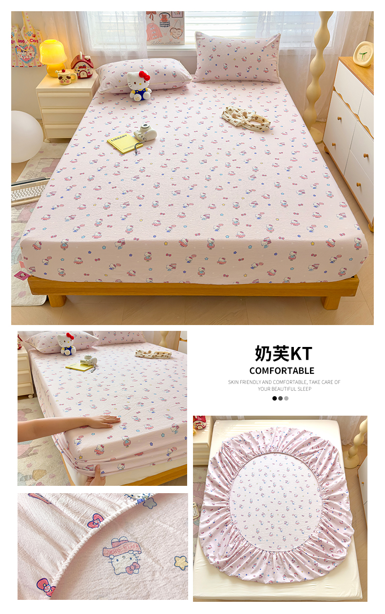 商品名称:梦庭帛美 2025新款高克重110克云感提花皱皱纱正版三丽鸥床笠 奶芙KT