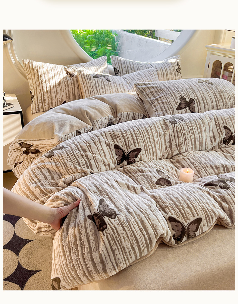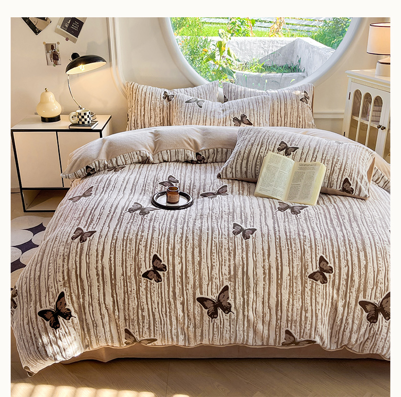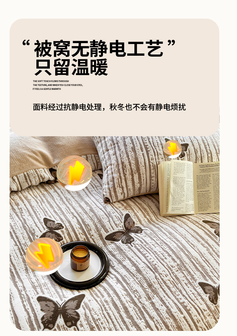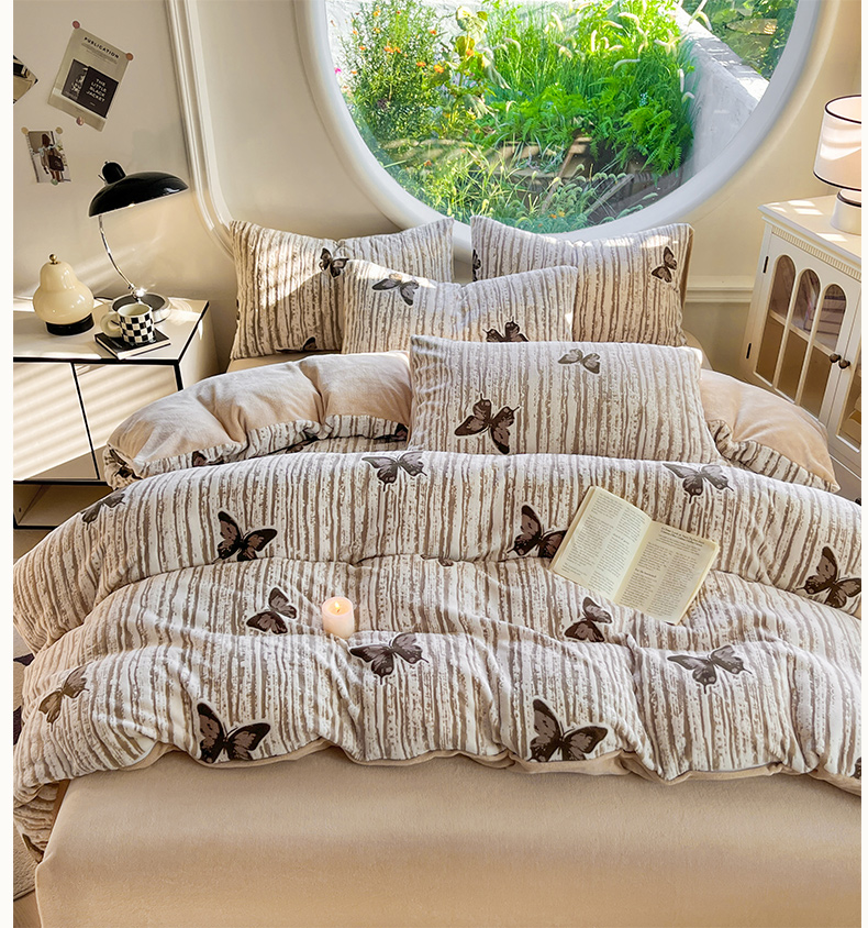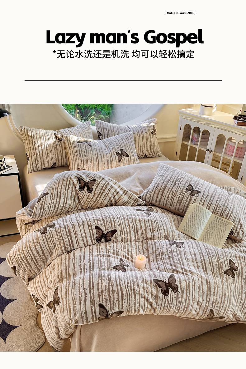 商品名称:大境 2025秋冬新款A类230克牛奶绒雕花烂花绒宝宝绒床笠款床单款四件套 蝶恋花语