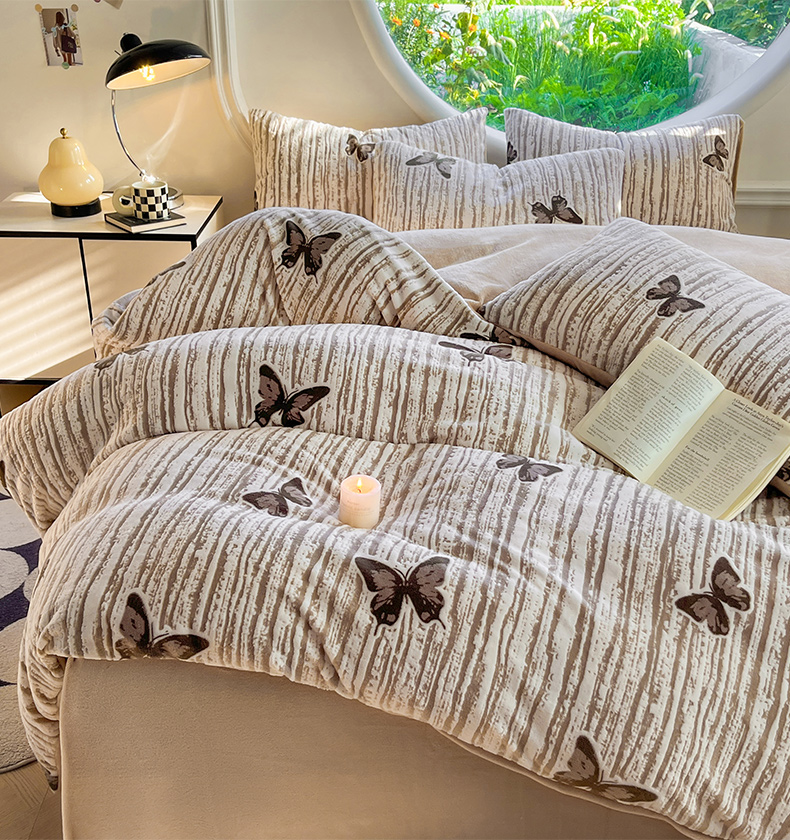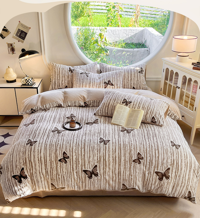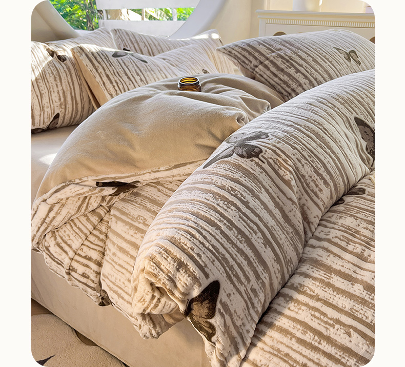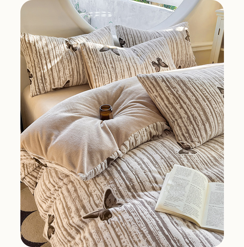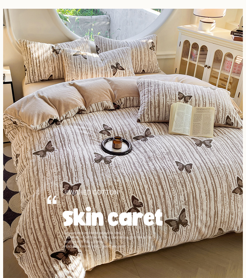 商品名称:大境 2025秋冬新款A类230克牛奶绒雕花烂花绒宝宝绒床笠款床单款四件套 蝶恋花语