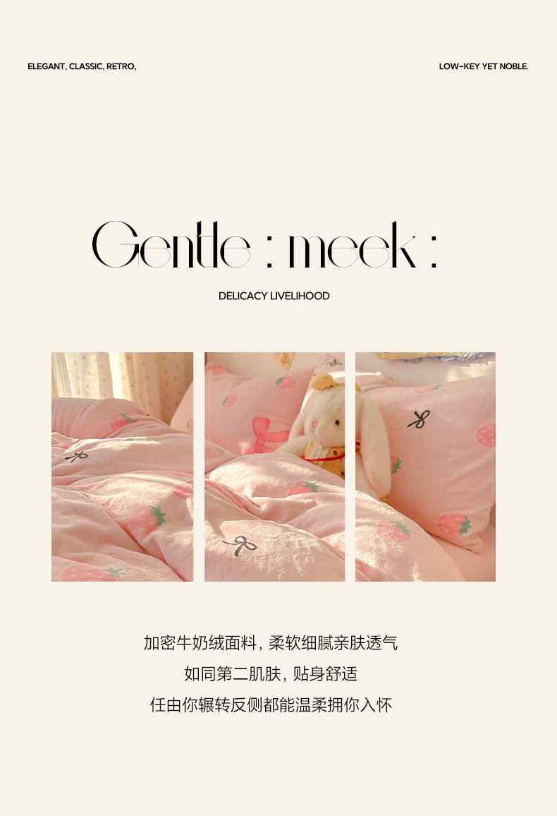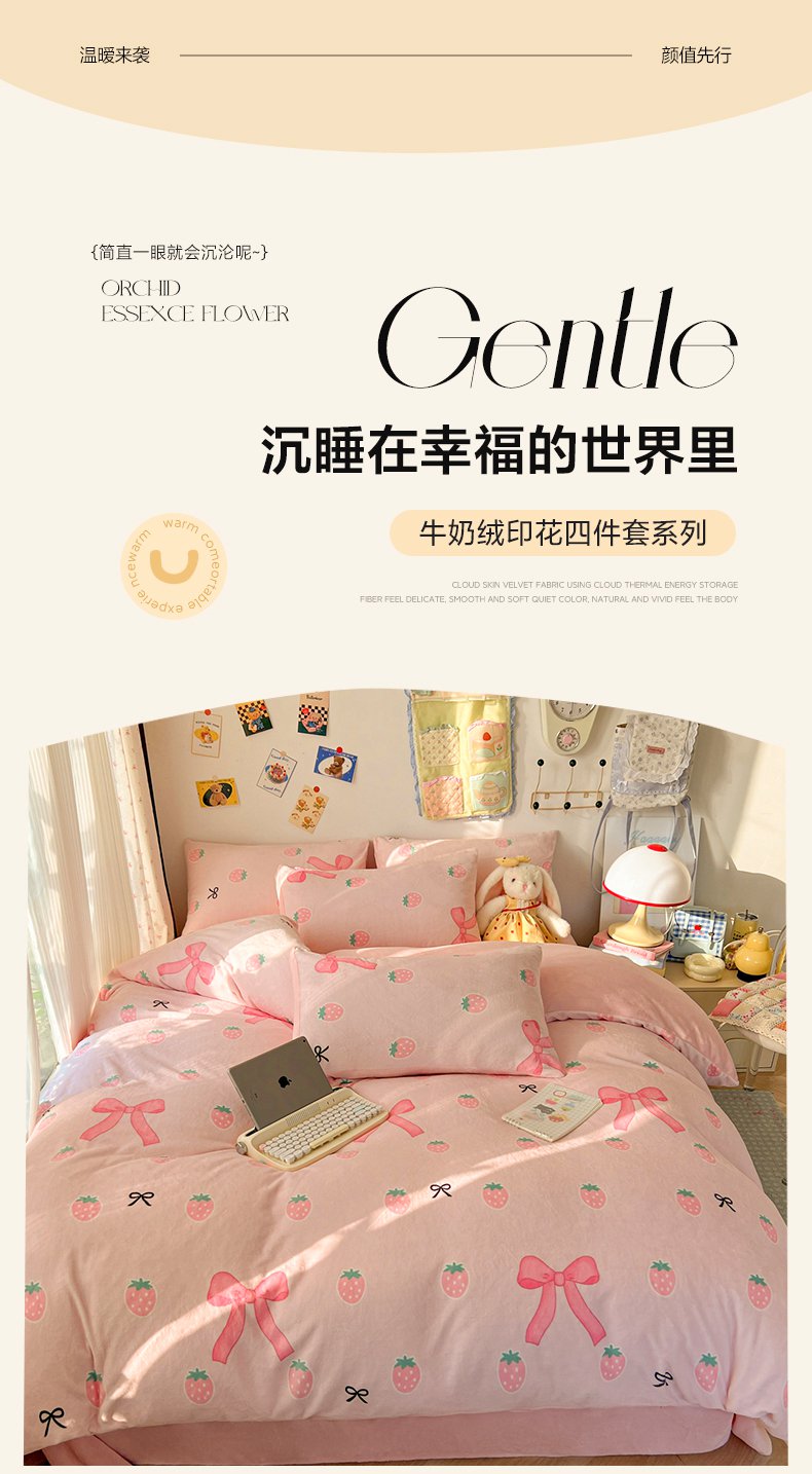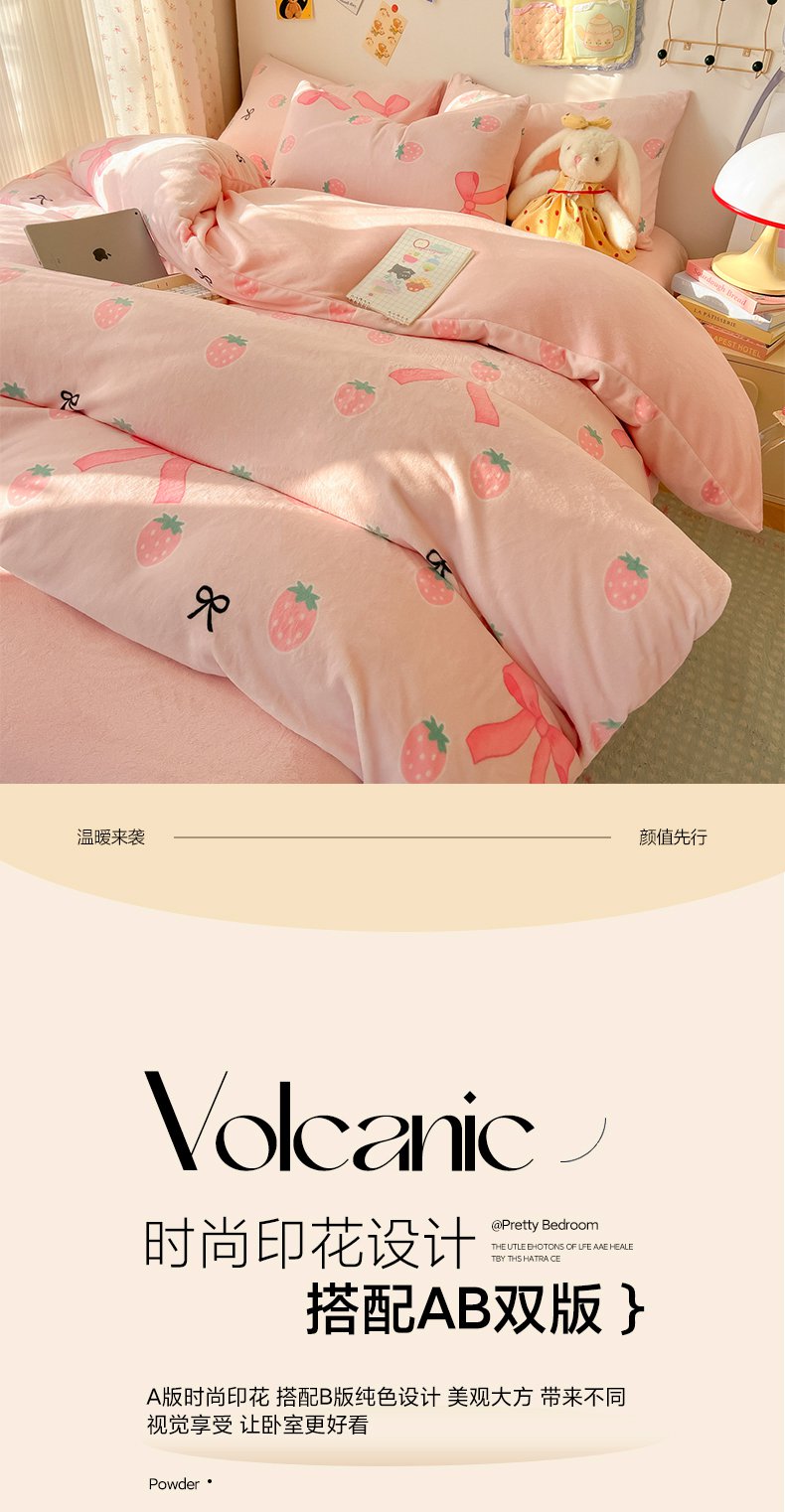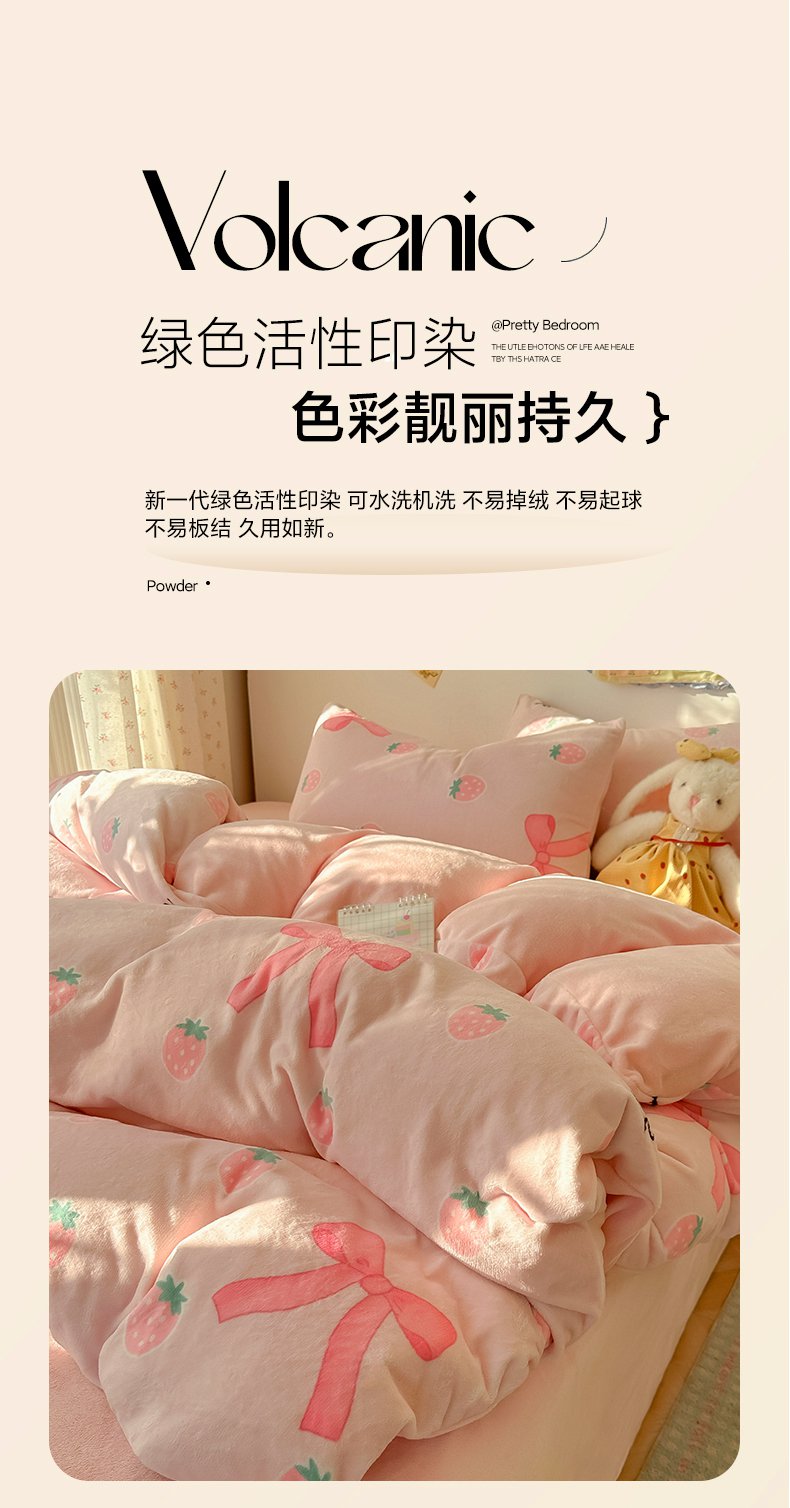 商品名称:韩巢家纺 2025新款双面高克重牛奶绒被套单件被罩 草莓牛奶