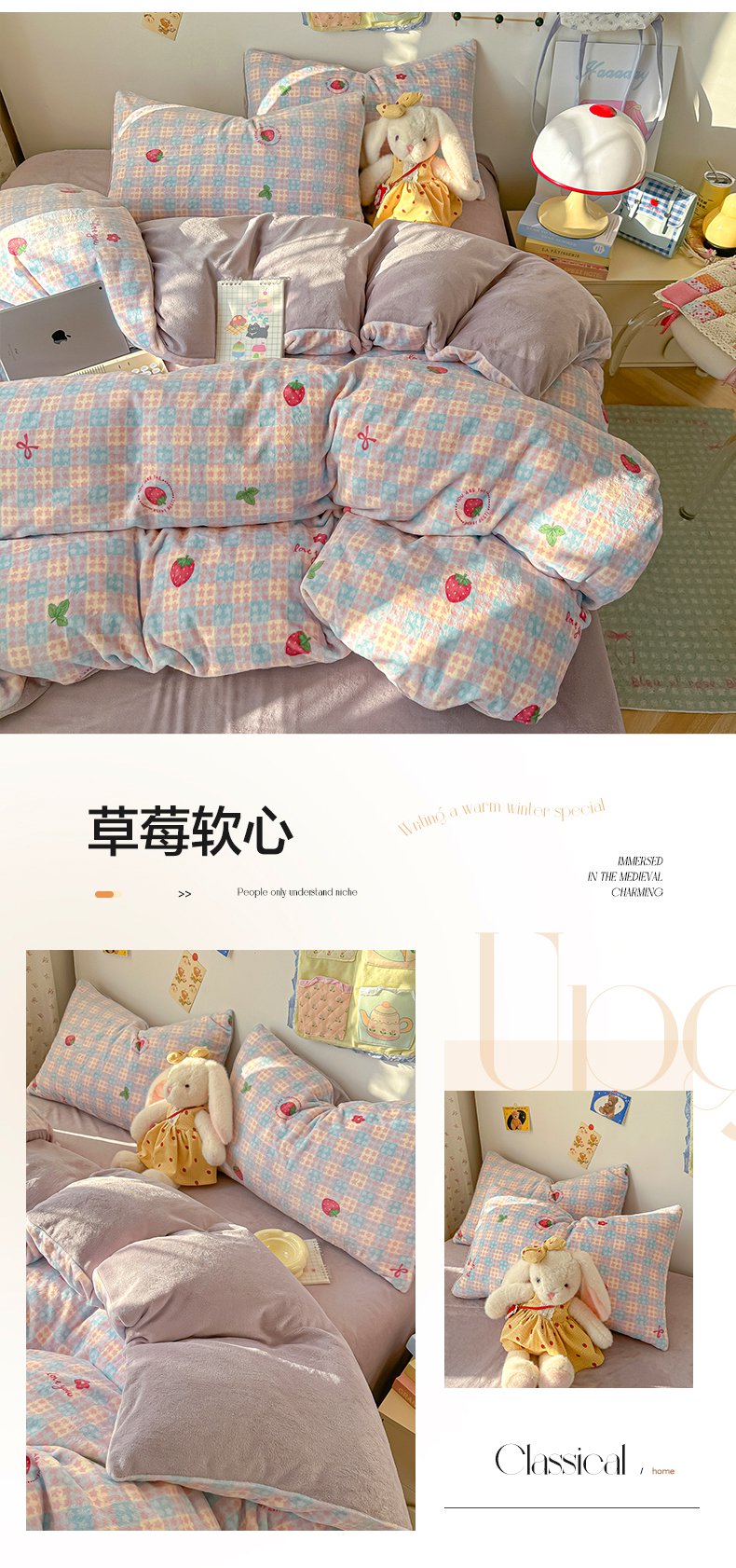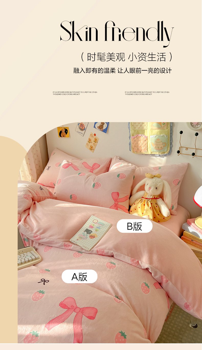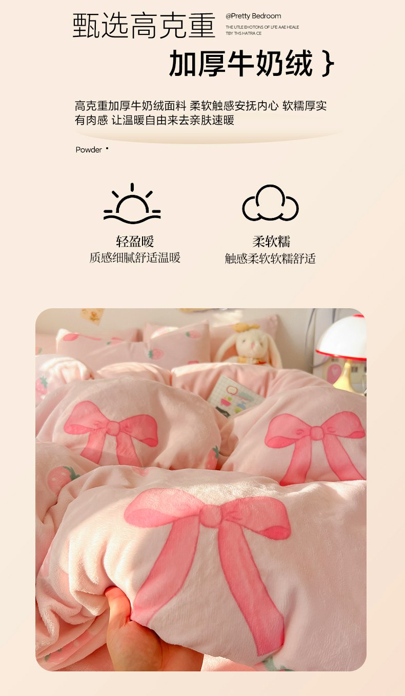 商品名称:韩巢家纺 2025新款双面高克重牛奶绒被套单件被罩 草莓牛奶