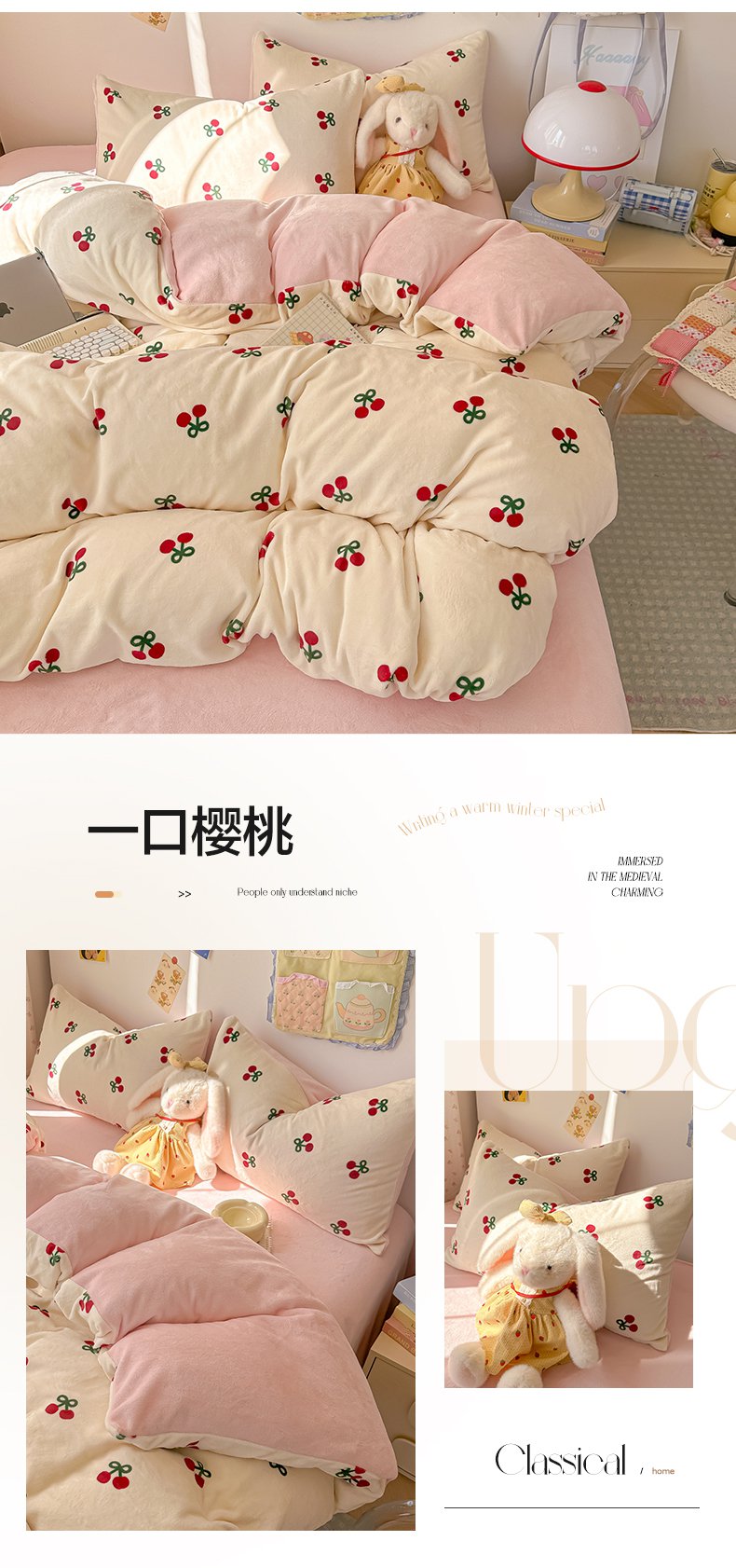 韩巢家纺 2025新款高克重印花牛奶绒床品四件套 爱心小樱桃,爱心小樱桃