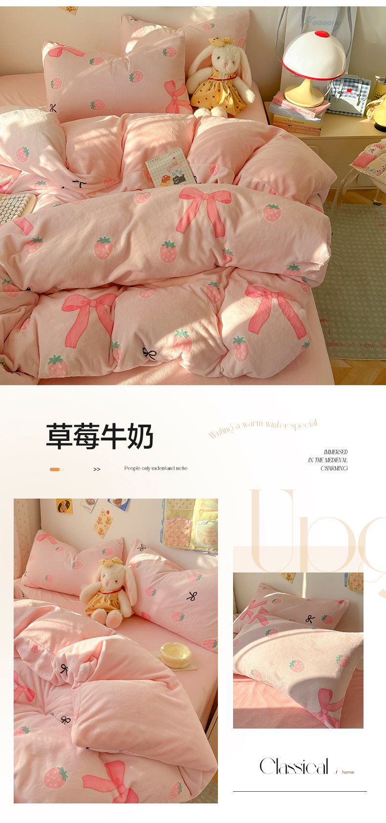 韩巢家纺 2025新款高克重印花牛奶绒床品四件套 爱心小樱桃,爱心小樱桃