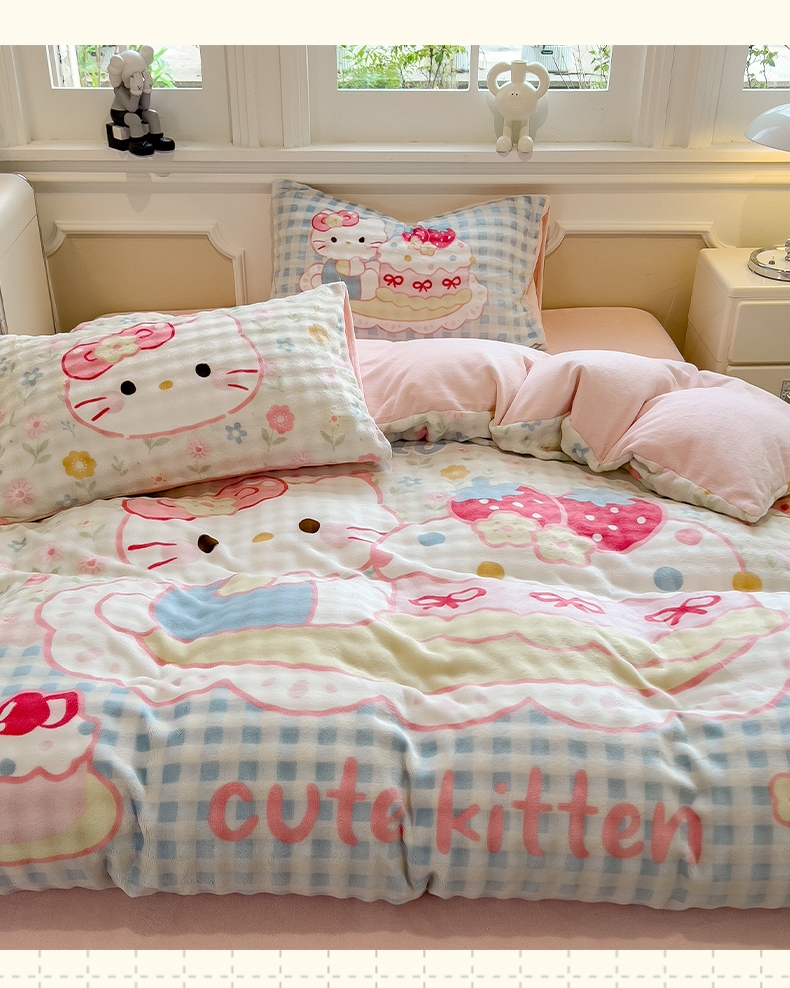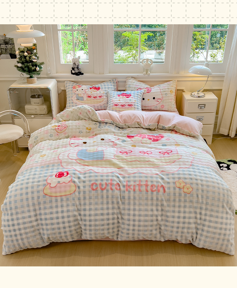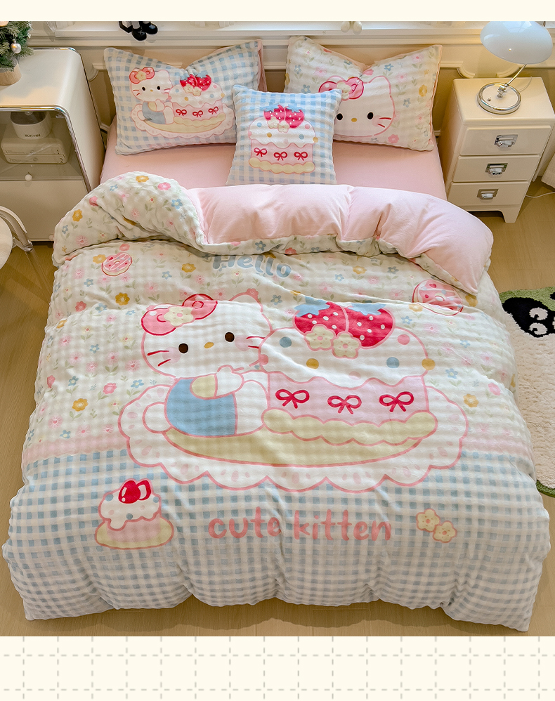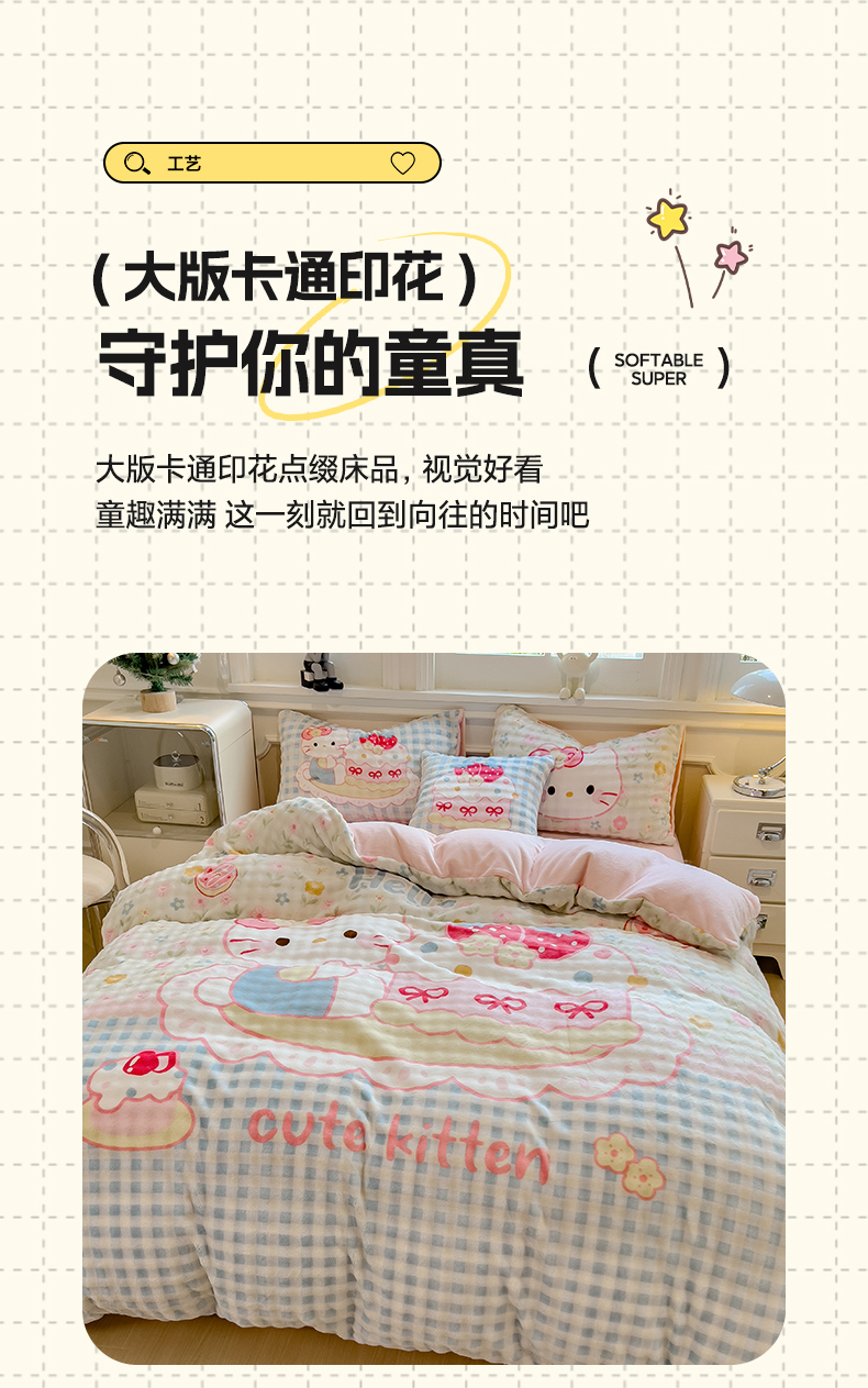 商品名称:摩妮卡 2025新款亲肤舒适泡泡绒大版卡通印花五件套 大版蛋糕凯蒂