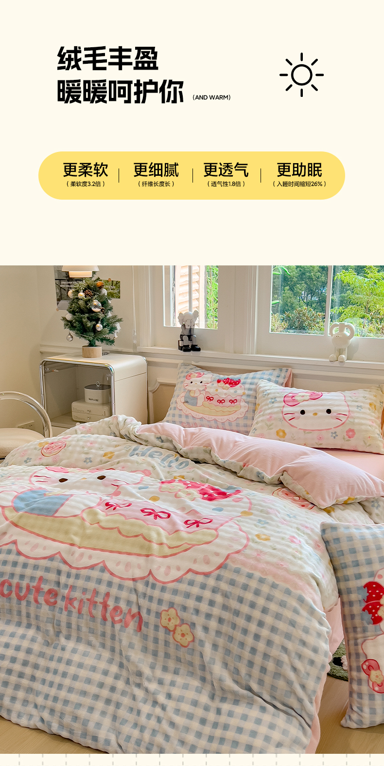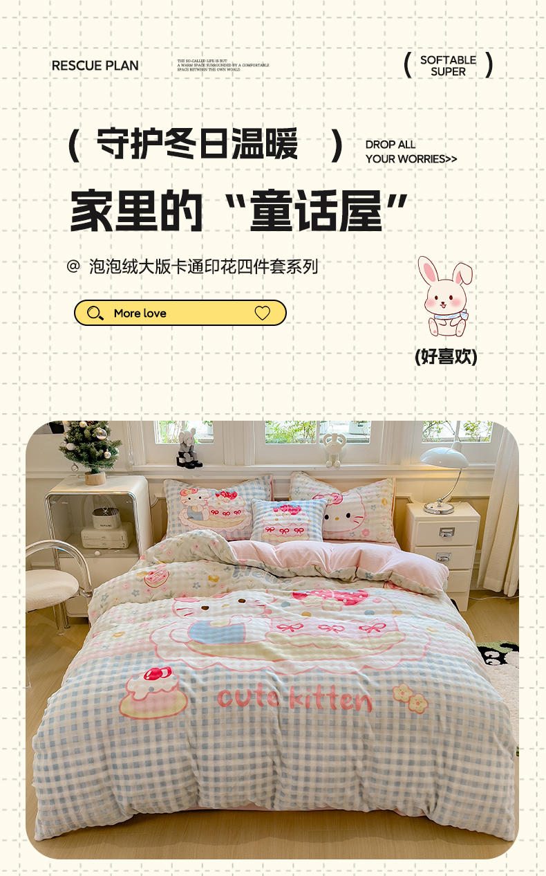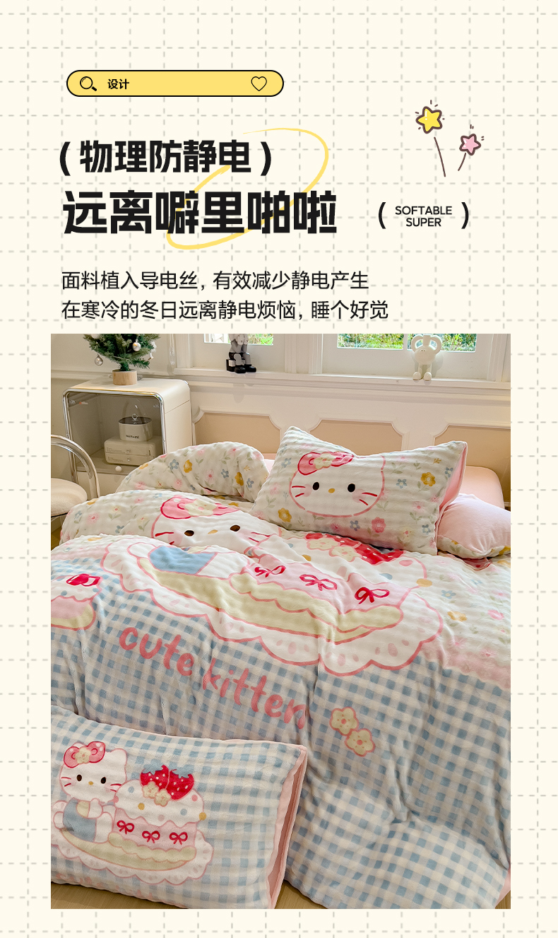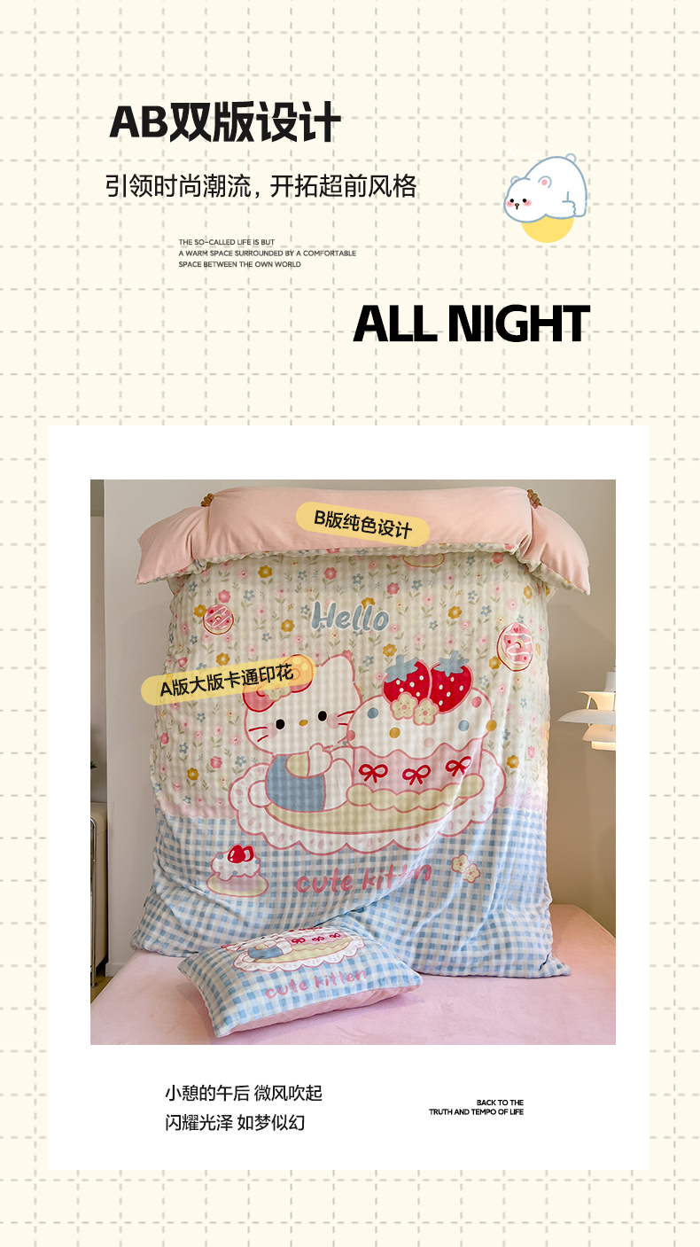 商品名称:摩妮卡 2025新款亲肤舒适泡泡绒大版卡通印花五件套 大版蛋糕凯蒂