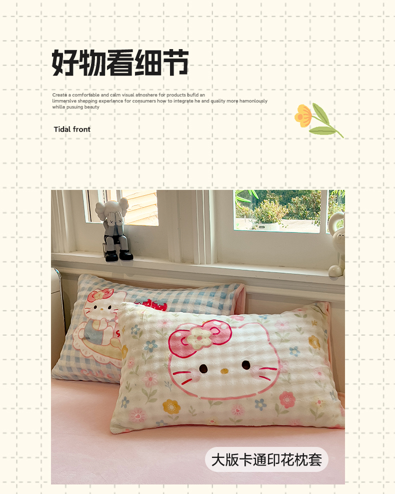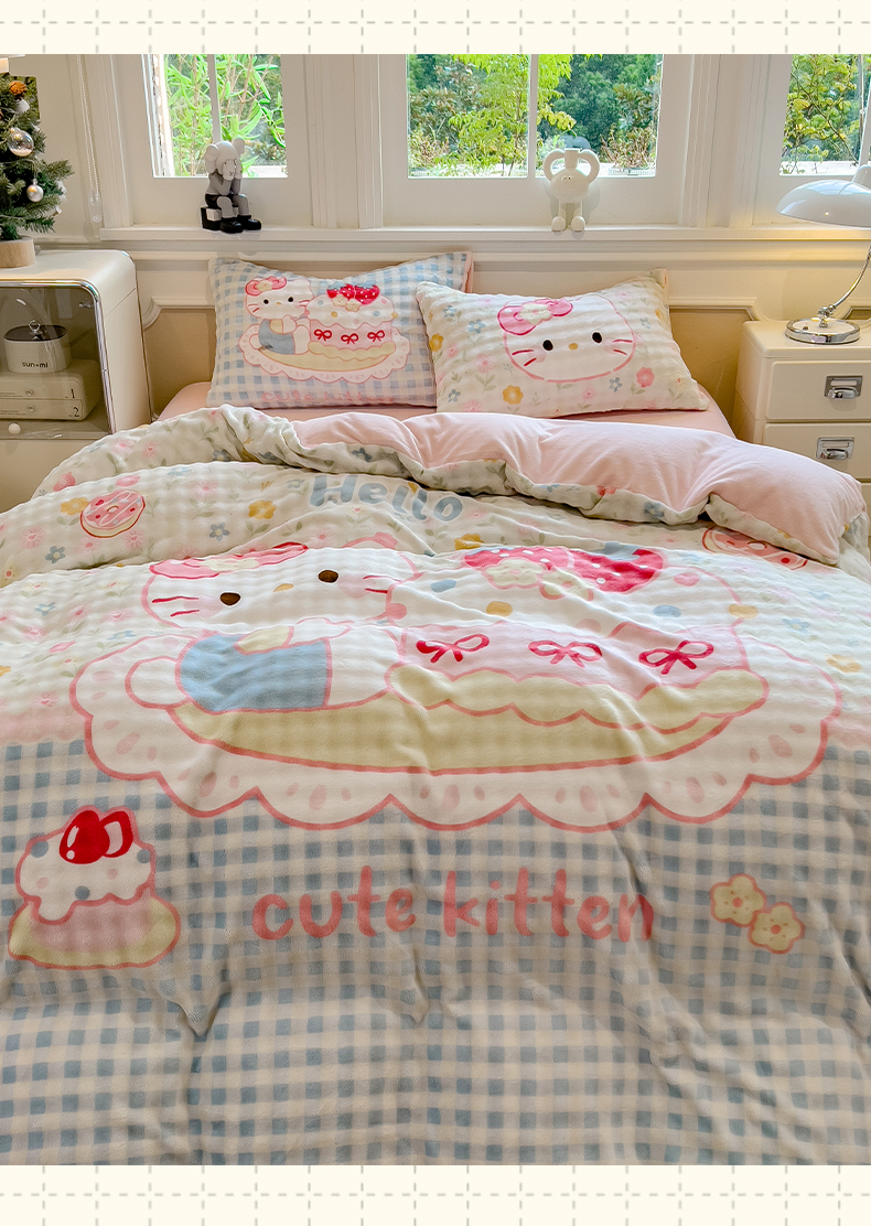 (总)摩妮卡 2025新款牛奶绒枕套混搭卡通复古床盖四件套,甜点凯蒂猫,傍晚凯蒂猫,幸运小猫,线条腊肠狗,生日小猫,粉帽小狗,豹纹小猫,庆祝凯蒂猫