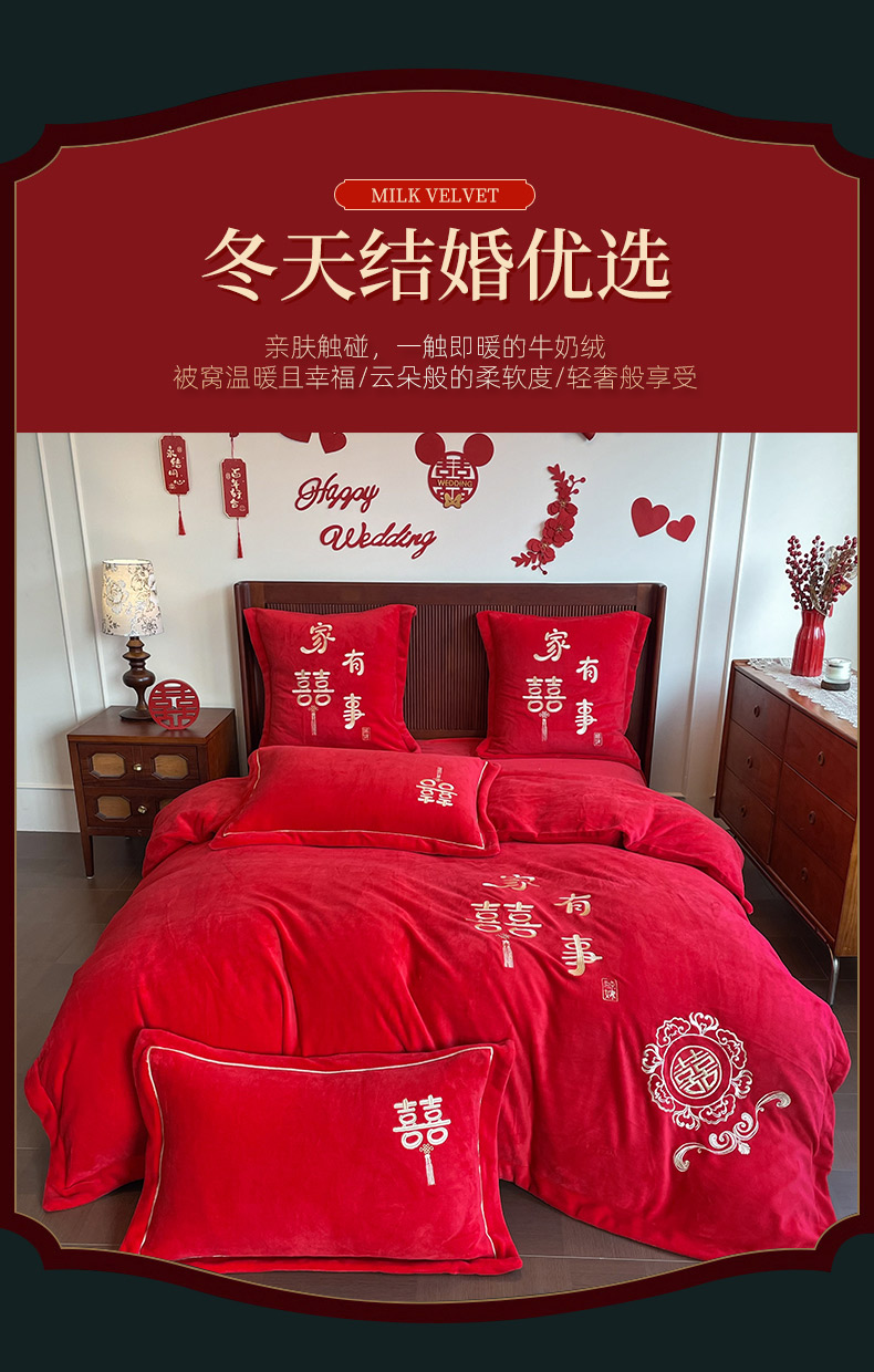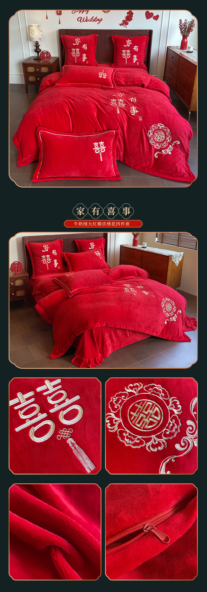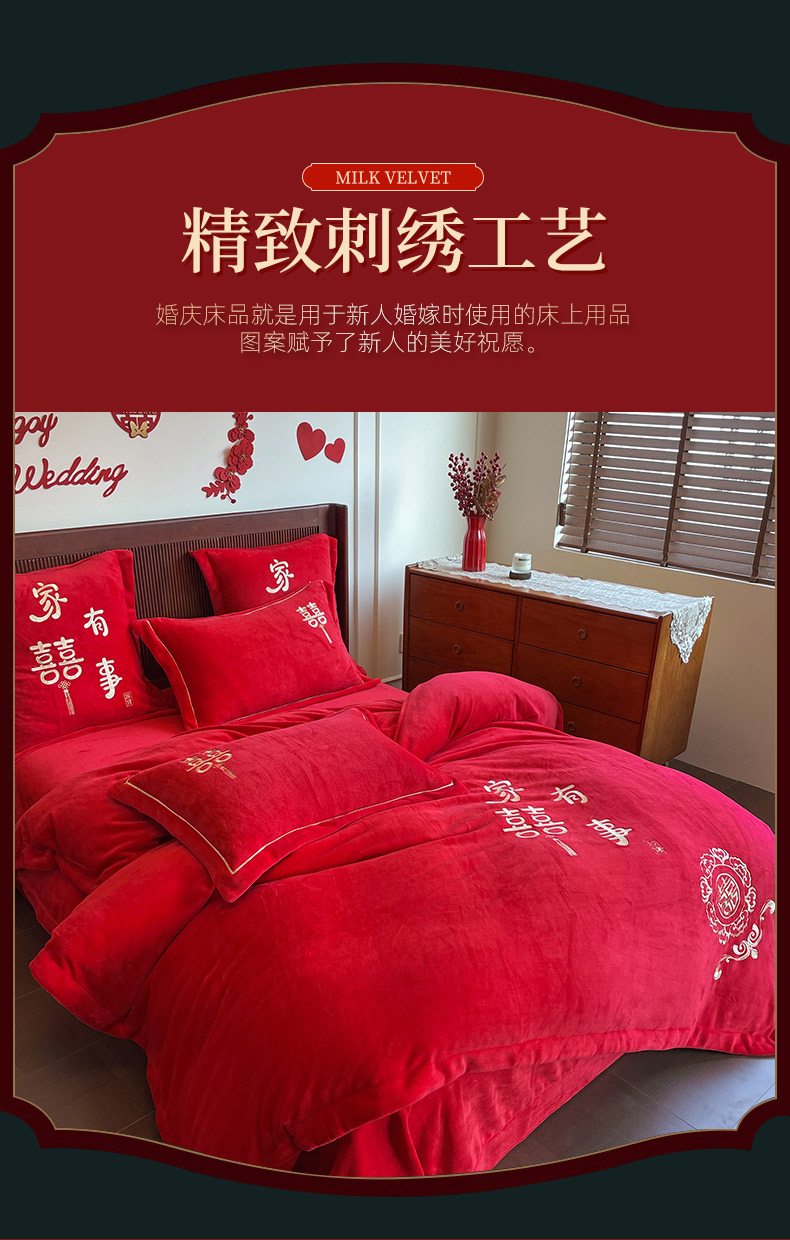 商品名称:(总)紫乐家纺 2025新款全消光牛奶绒大红婚庆绣花四件套床单款床笠款六件套