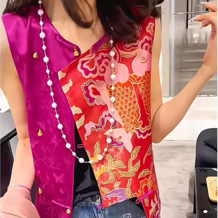 洛兰沙家居馆【只代发】【只代发】 2025新款复古织锦缎细纱棉麻拼接马甲背心刺绣中式盘扣上衣 39