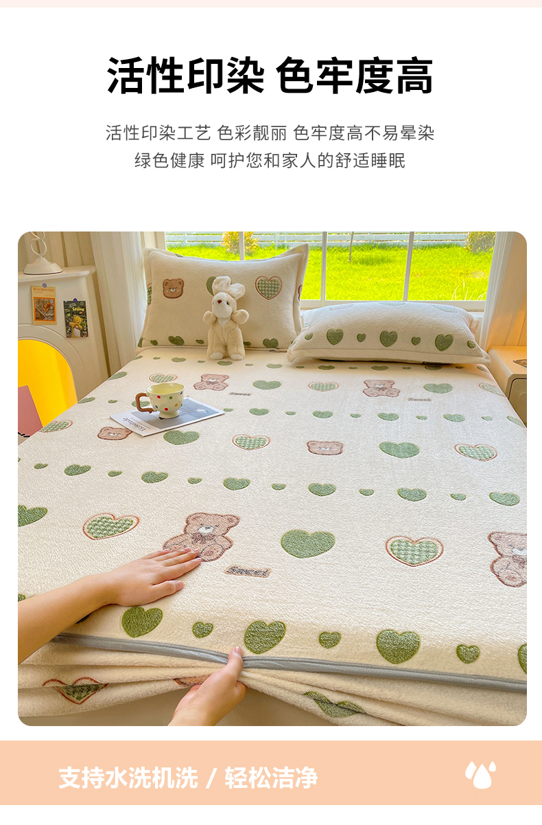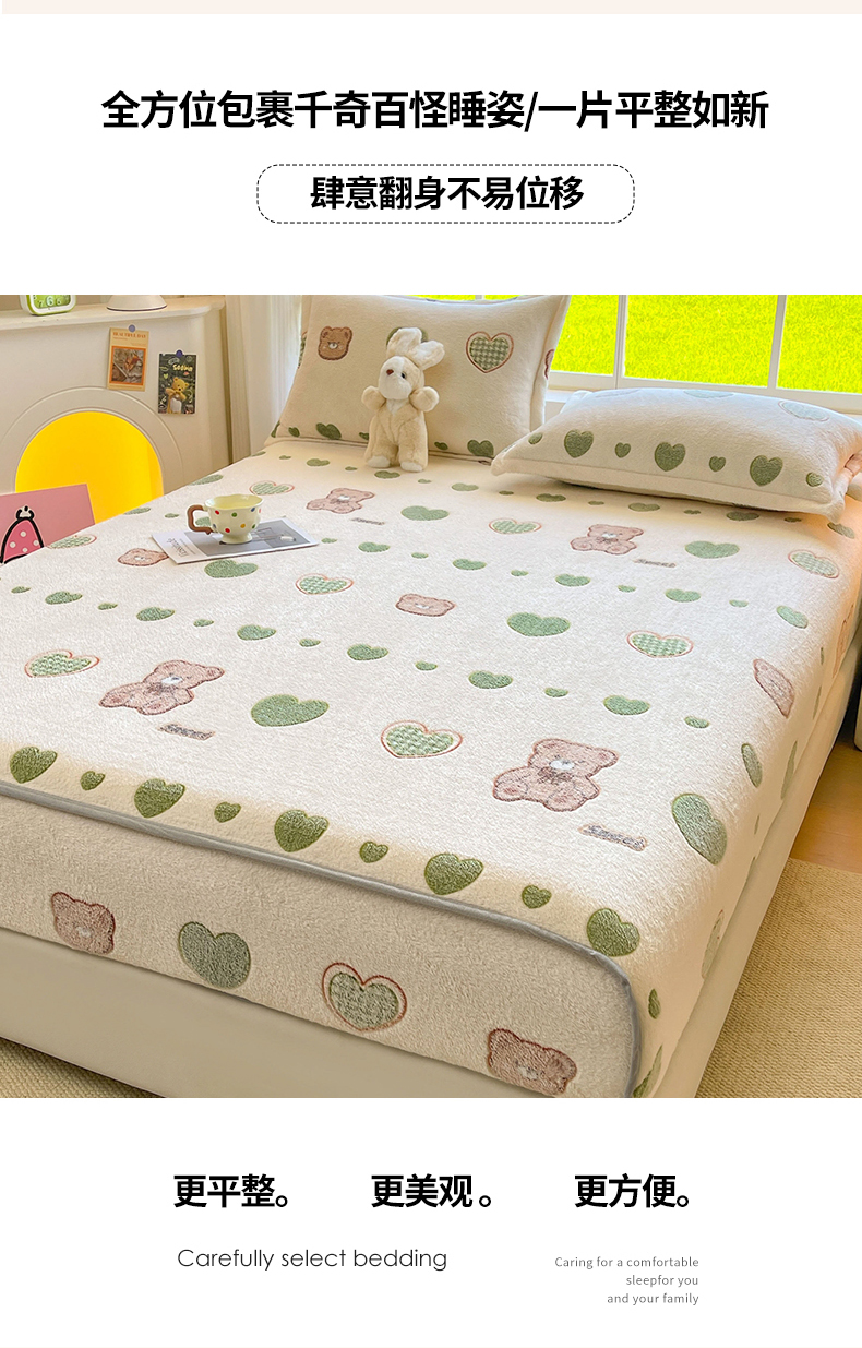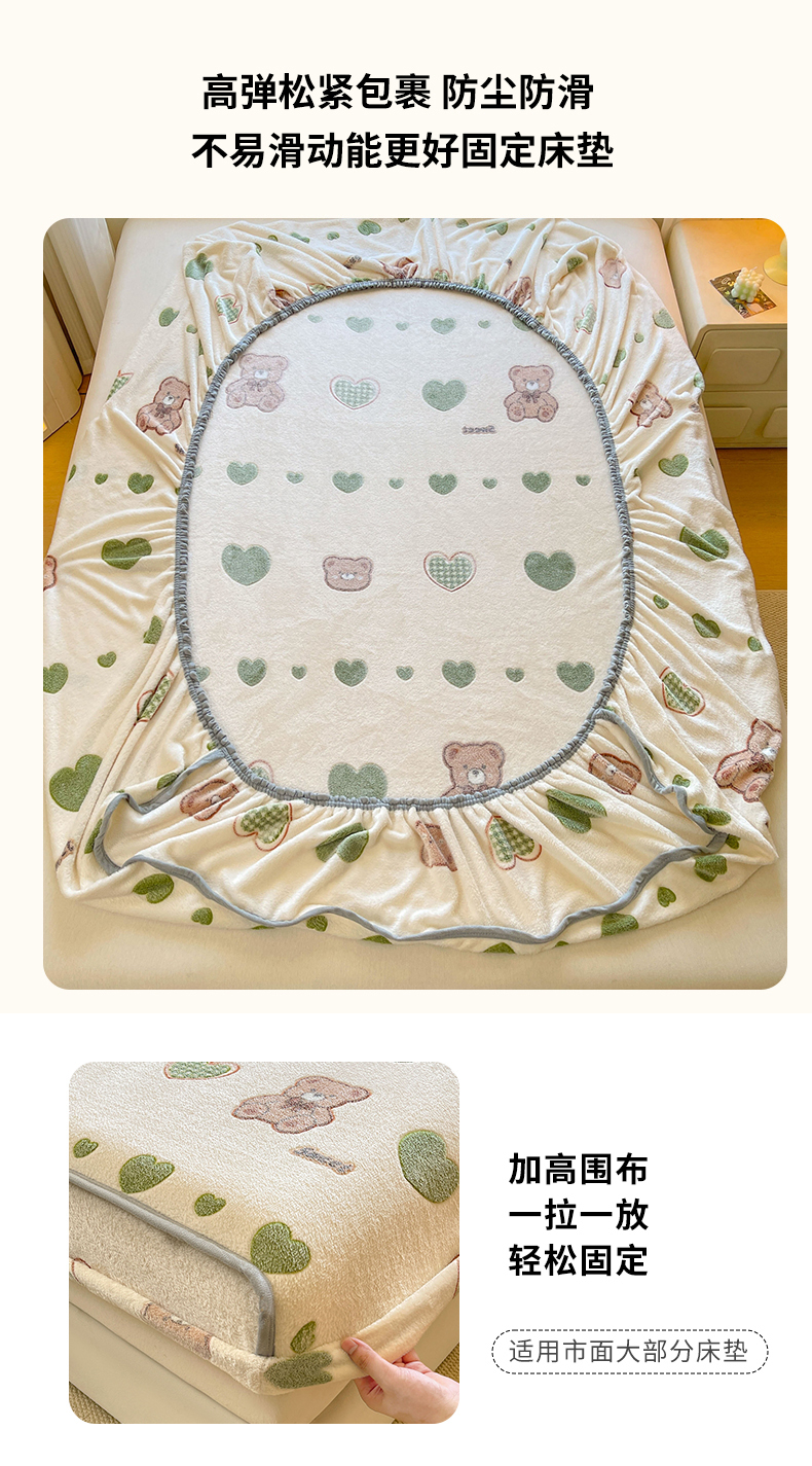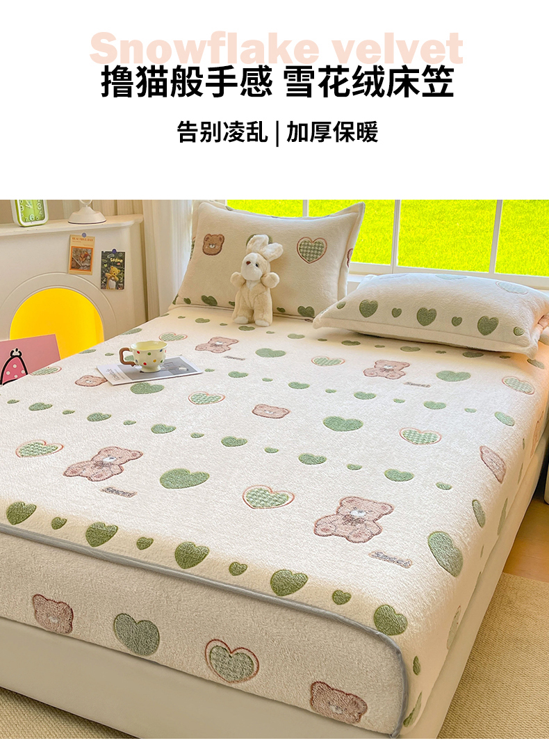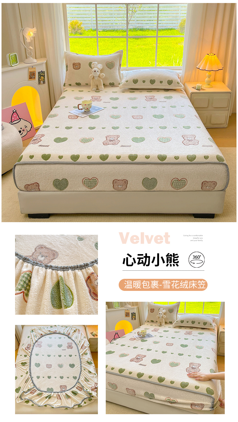 牵梦萦家纺 2025新款雪花绒立体包边床笠 心动小熊