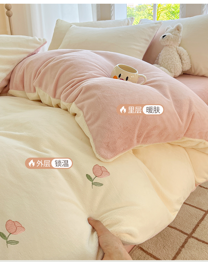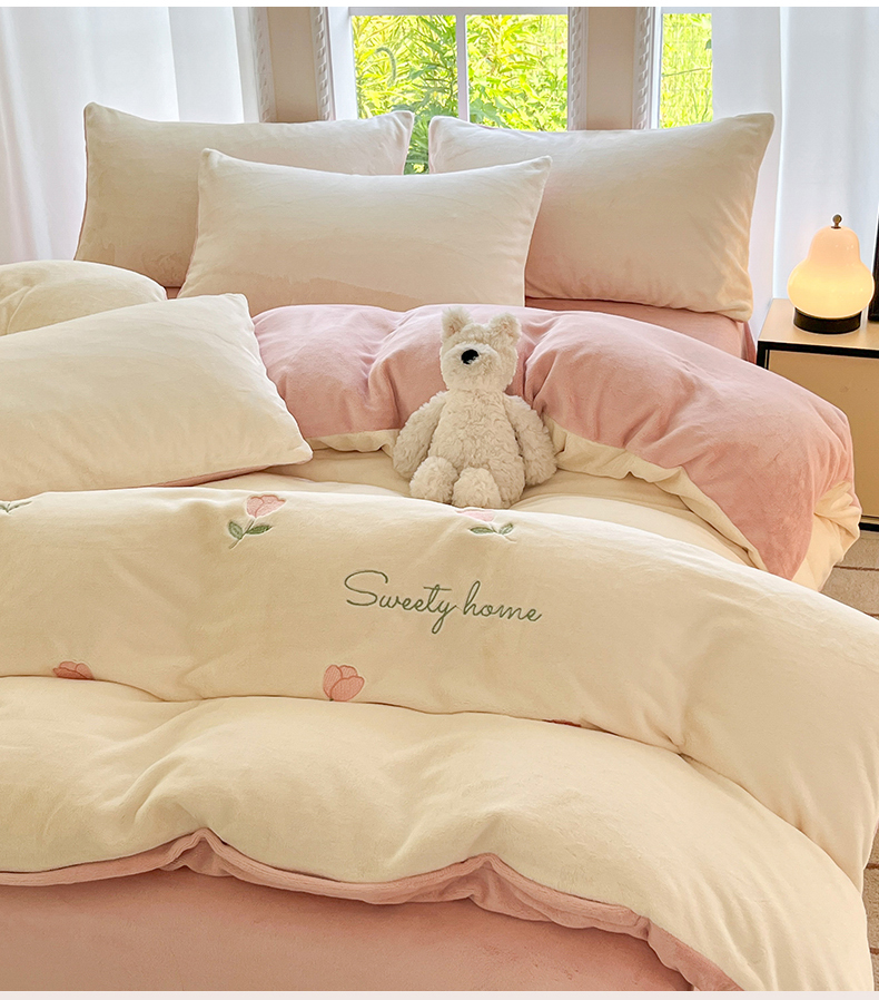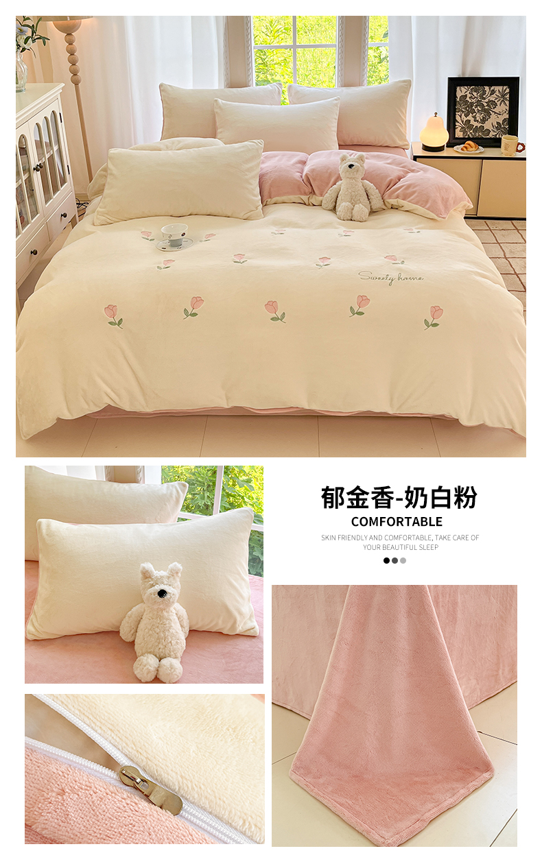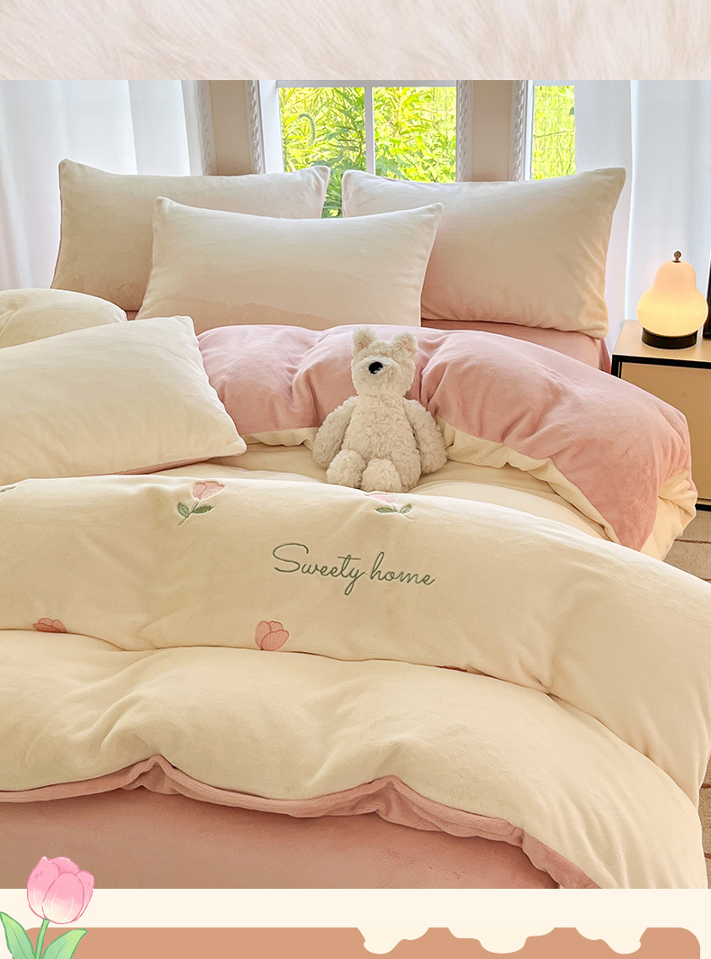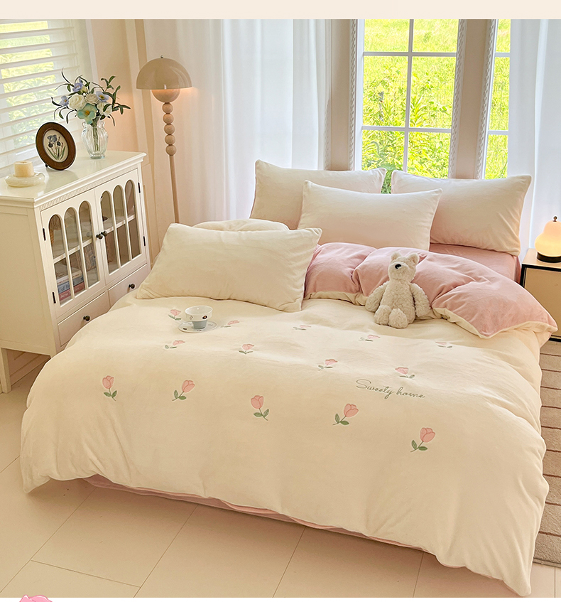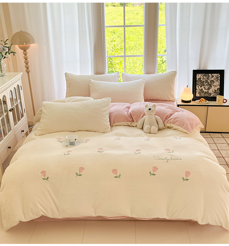 云棉坊 2025新款高克重牛奶绒四件套-满绣系列 郁金香-奶白粉