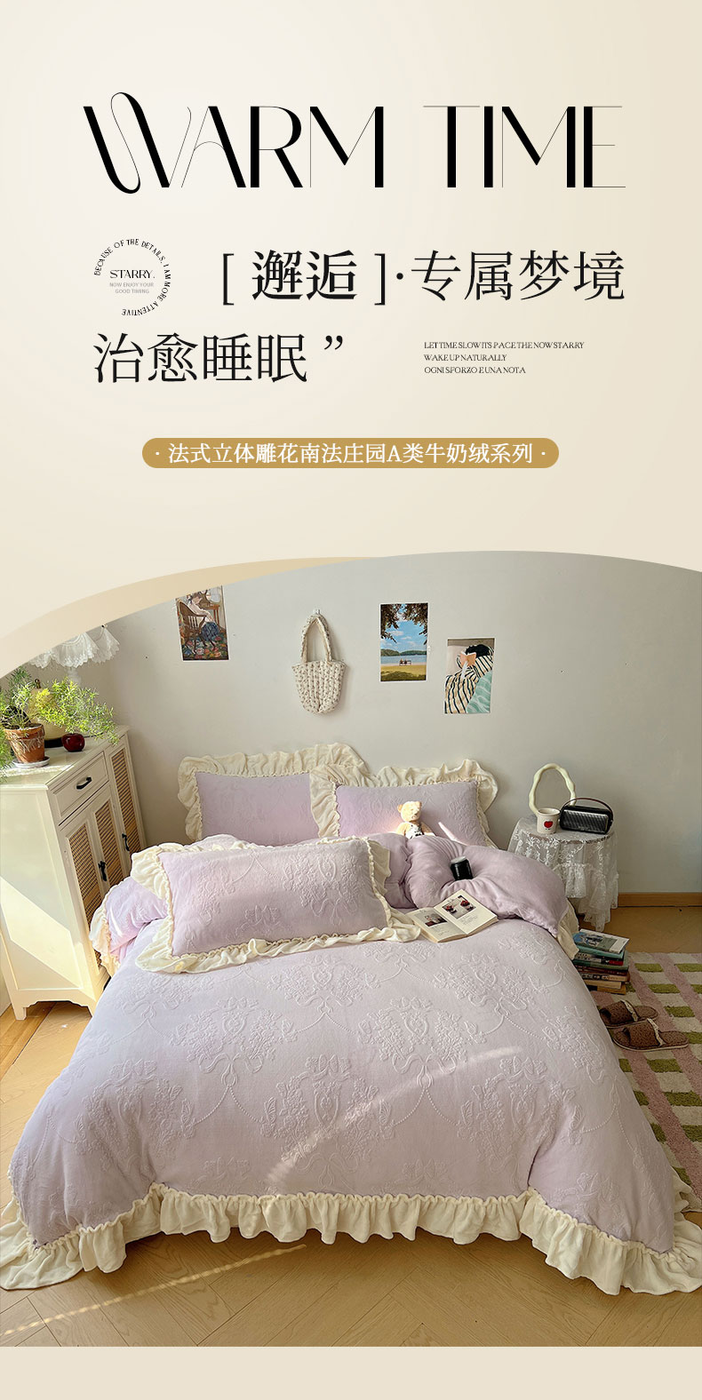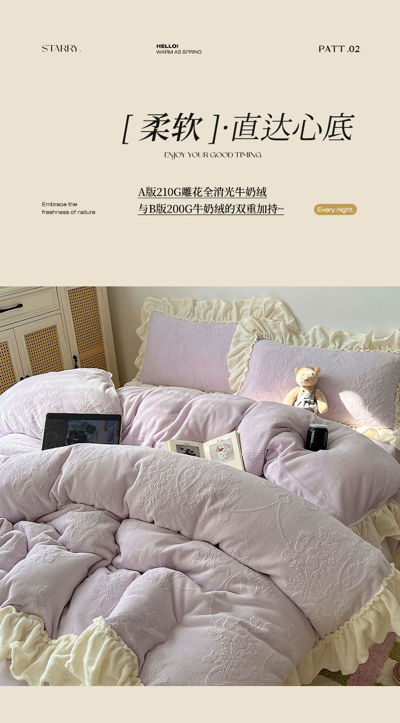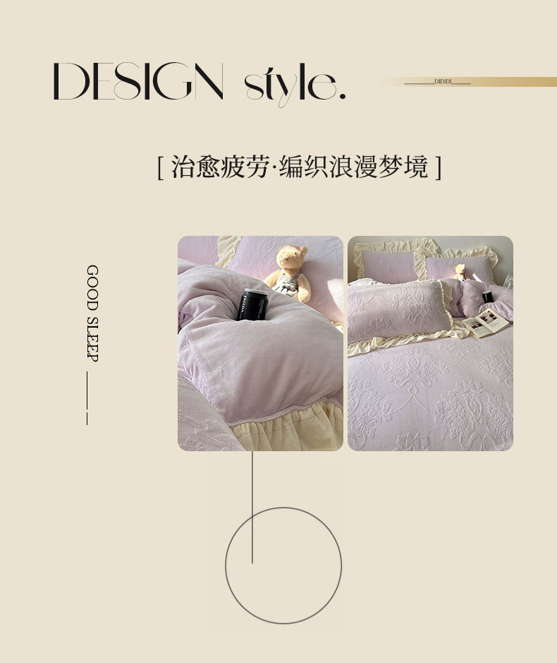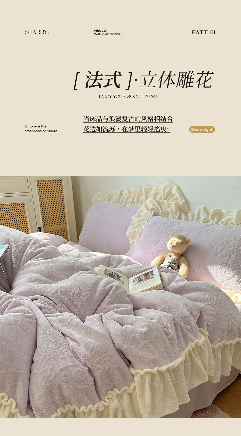 当前位置: 91家纺网 > 商品网购 > 床品套件 > 四件套 > 牛奶绒四件套 > 六巷胡同 2025新款法式立体雕花南法庄园A类210g全消光牛奶绒四件套 南法庄园-紫