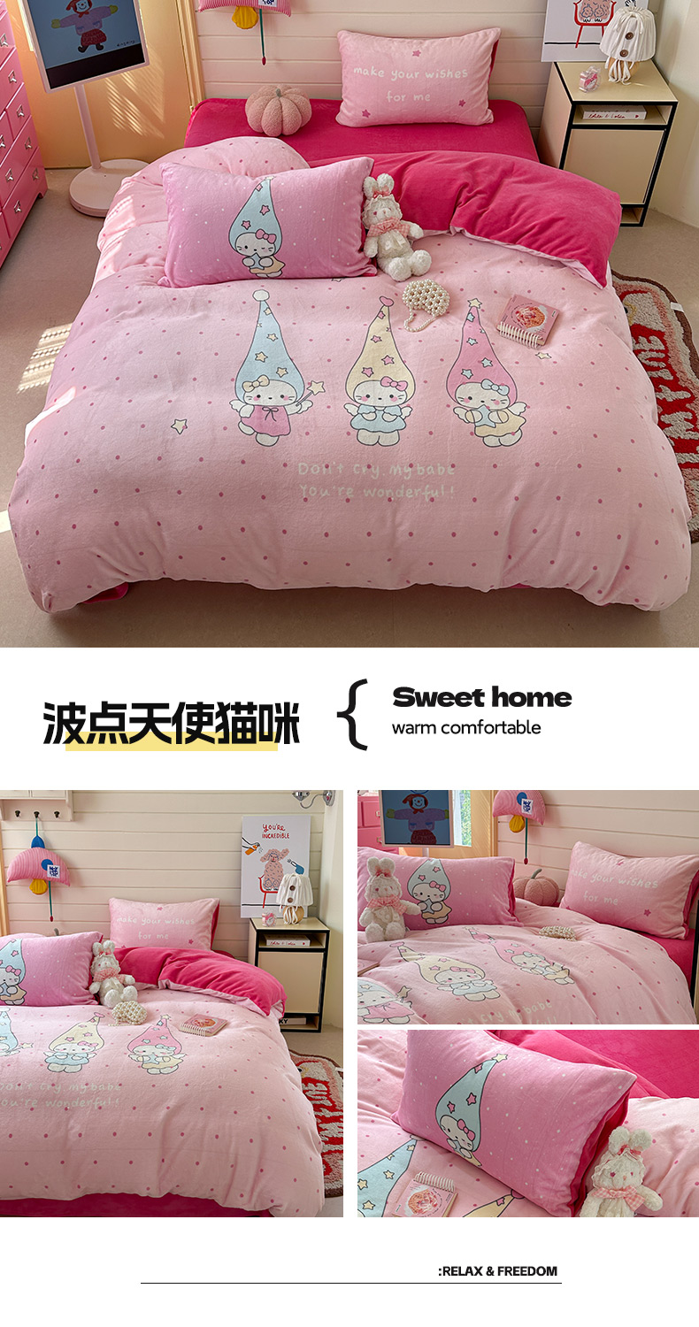 美乐迪家纺 2025新款大版牛奶绒四件套 波点天使猫咪