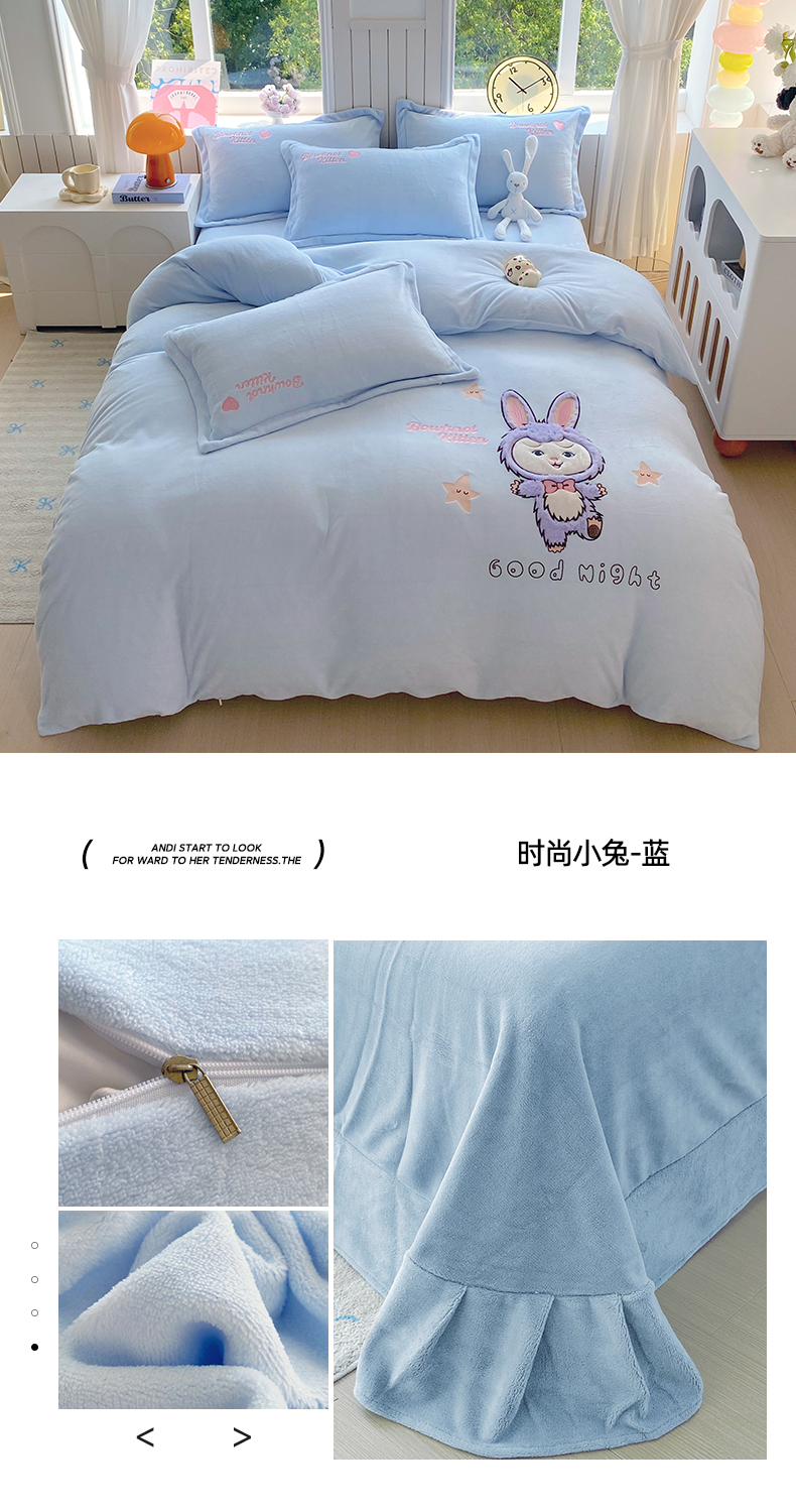当前位置: 91家纺网 > 商品网购 > 床品套件 > 四件套 > 牛奶绒四件套 > 悦织湾家纺 2025新款牛奶绒四件套纯色贴布绣床单款床盖款床上用品四件套时尚小兔2025新款加厚 床单款时尚小兔-蓝