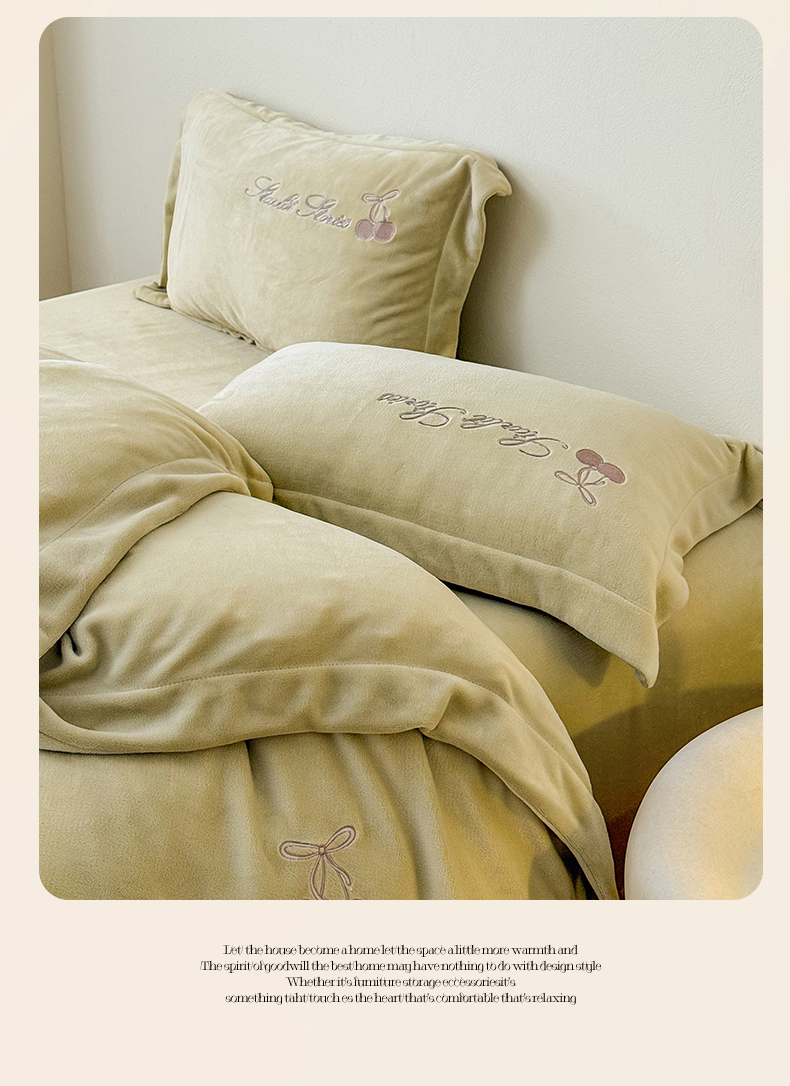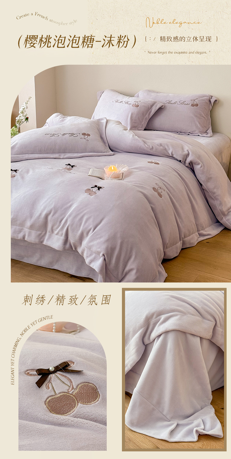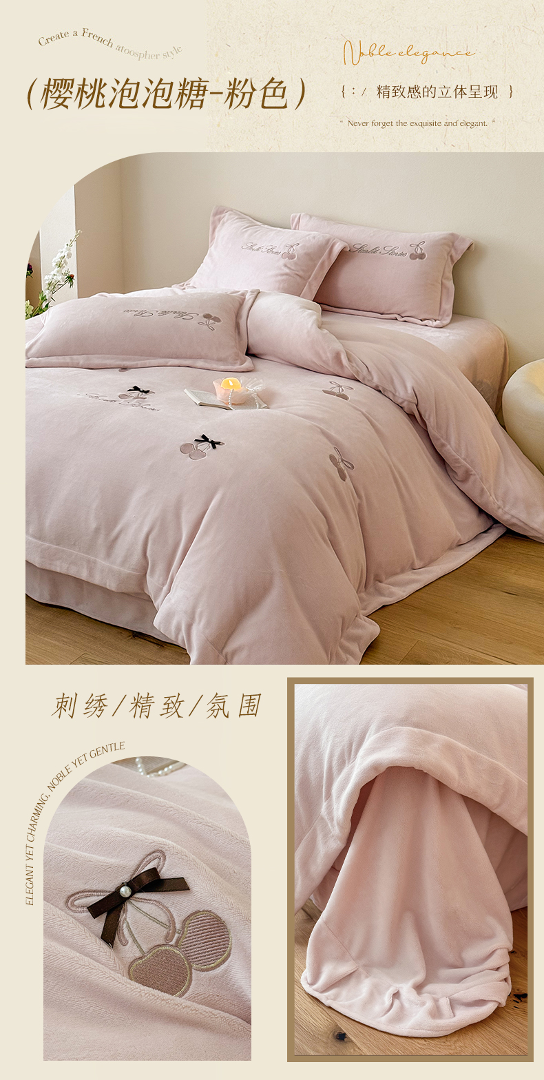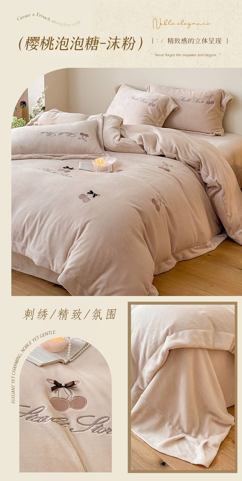 泽西家纺+V17798841158发大图 2025新品秋冬加厚保暖220克9斤刺绣牛奶绒四件套-樱桃泡泡糖 樱桃泡泡糖-姜黄