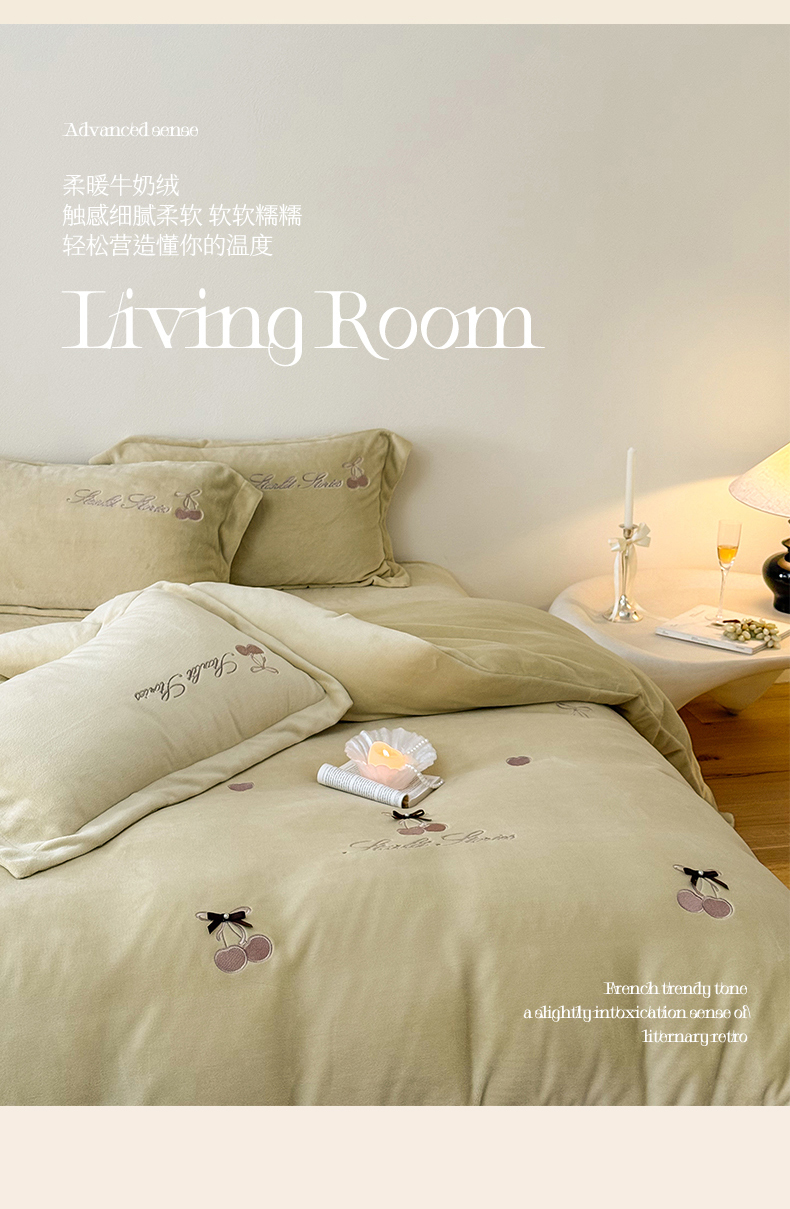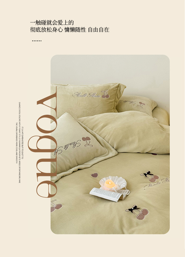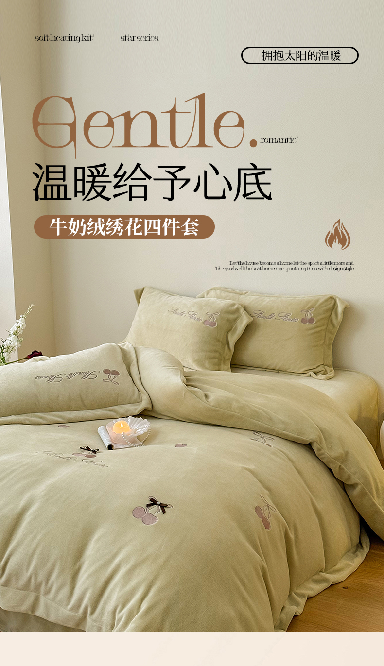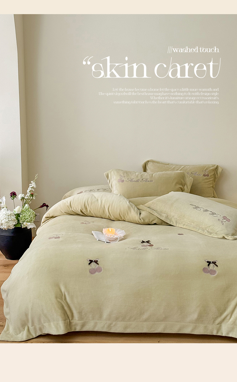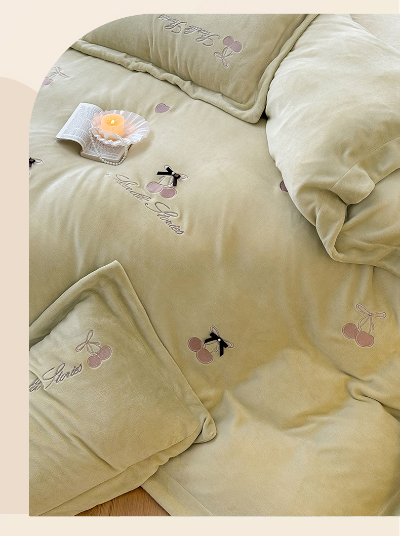 泽西家纺+V17798841158发大图 2025新品秋冬加厚保暖220克9斤刺绣牛奶绒四件套-樱桃泡泡糖 樱桃泡泡糖-姜黄