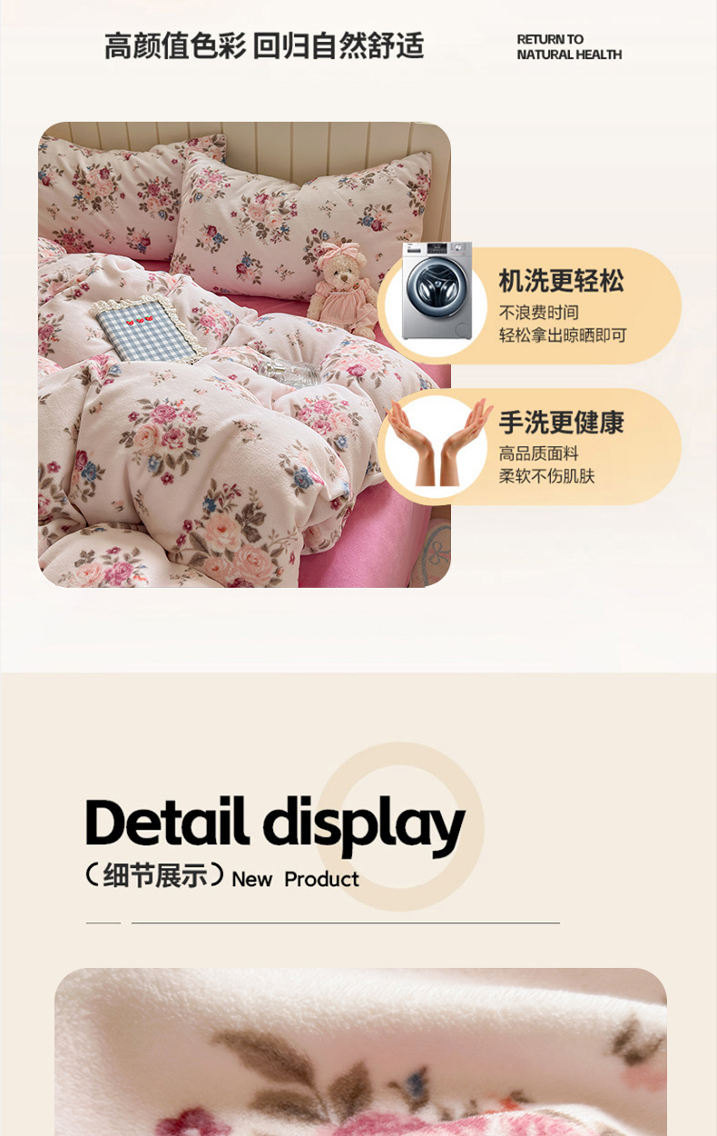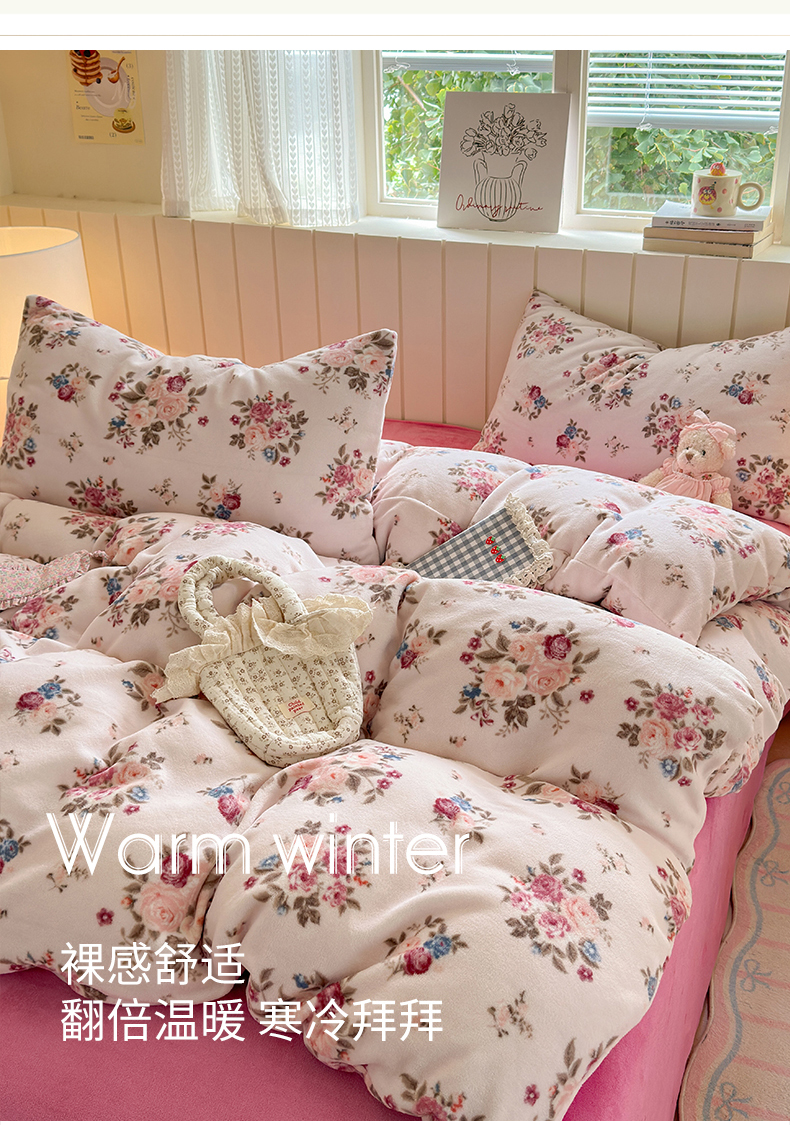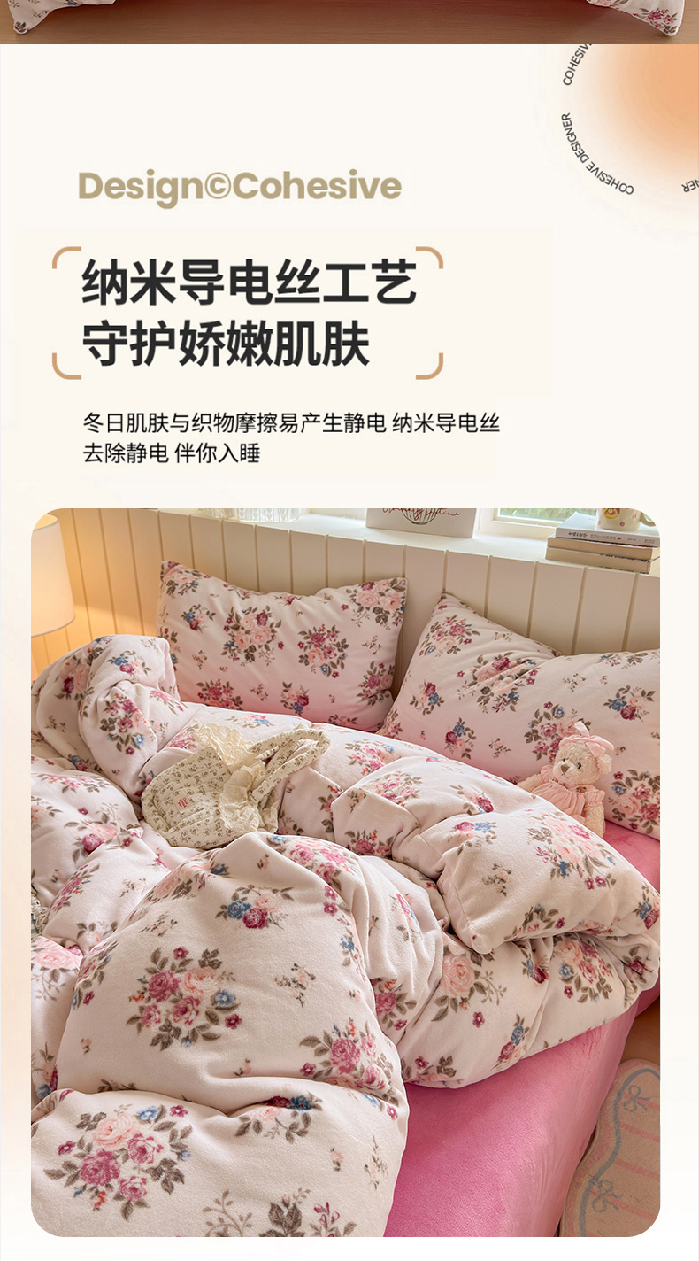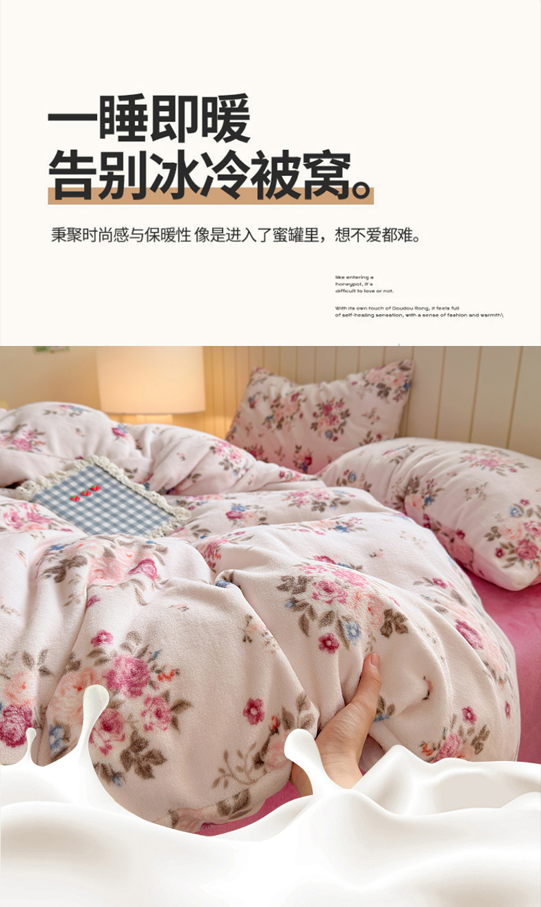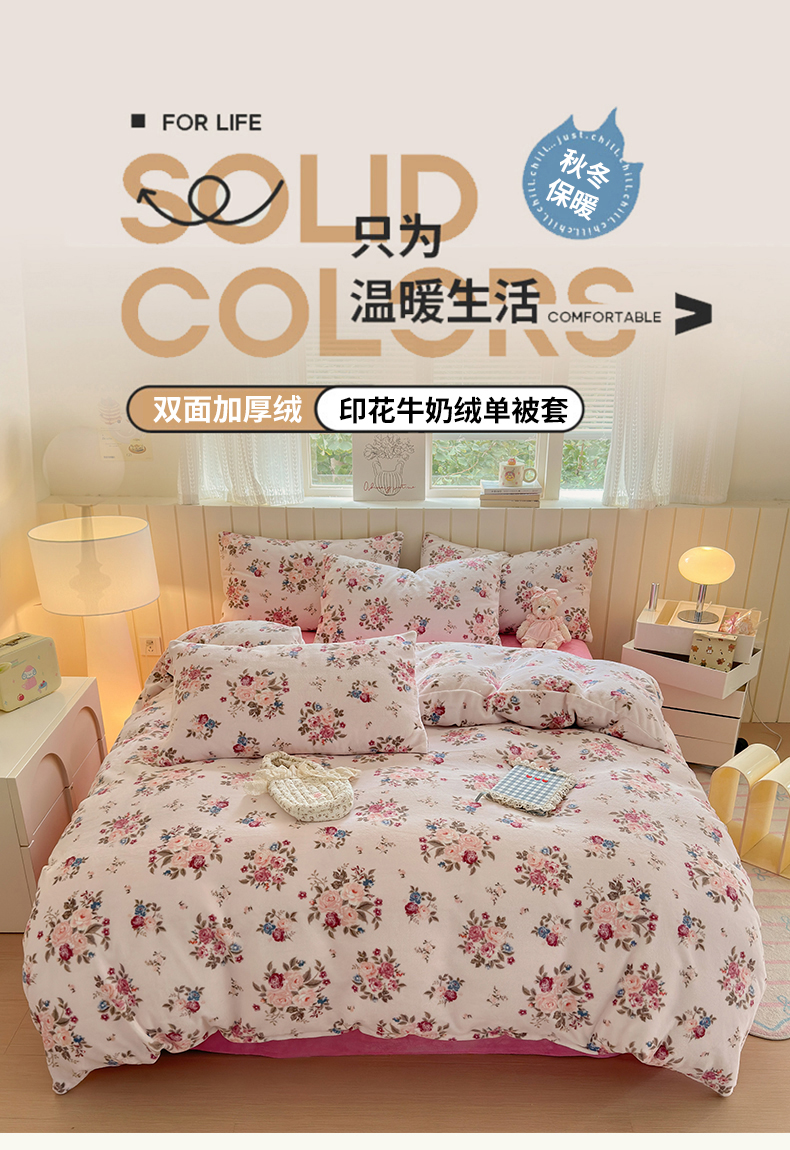 • 91家纺网 家纺一手货源 找家纺 丽美人家纺 2025新款印花双面加厚绒高克重牛奶绒被罩单品被套单件被套 山茶花语-粉
