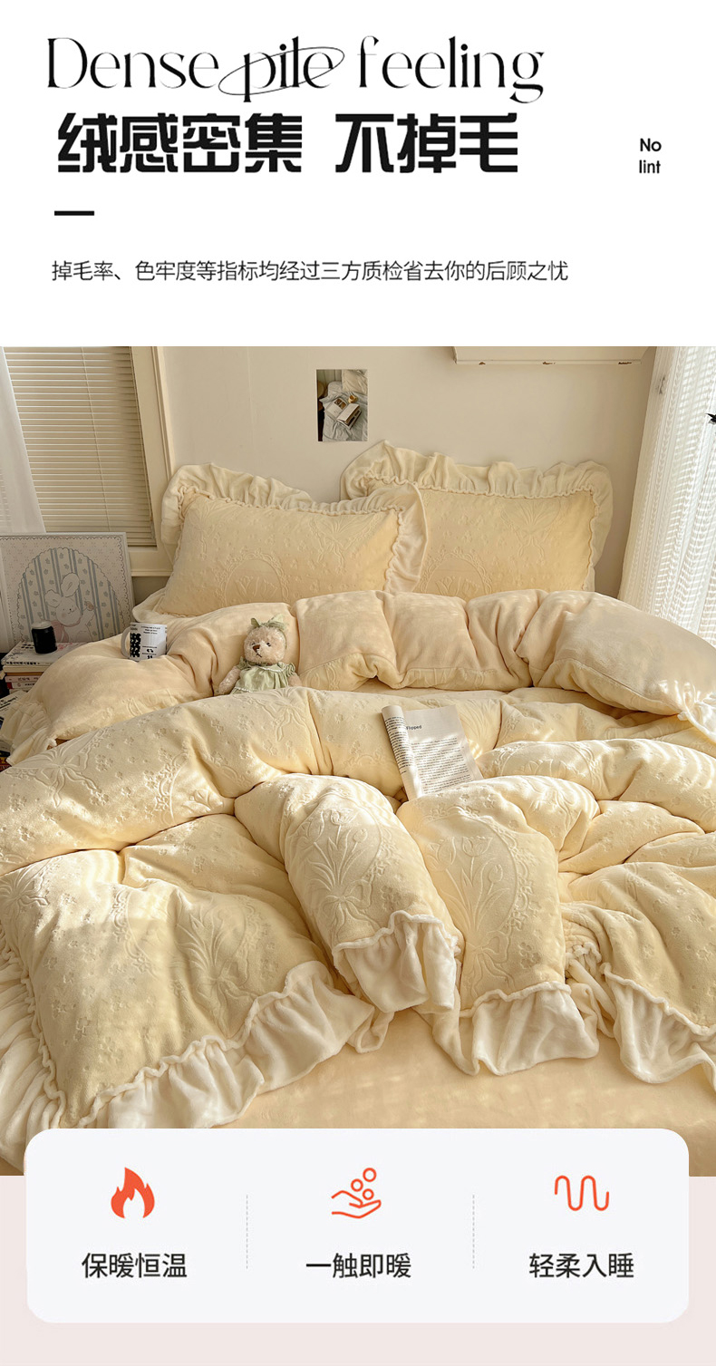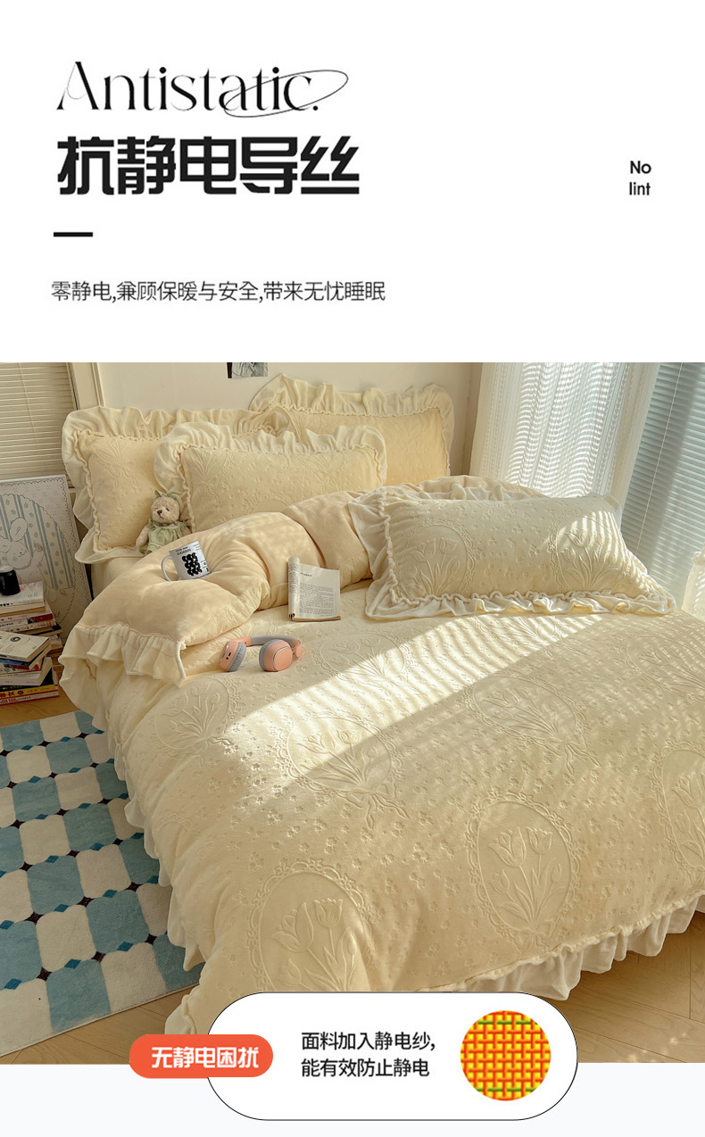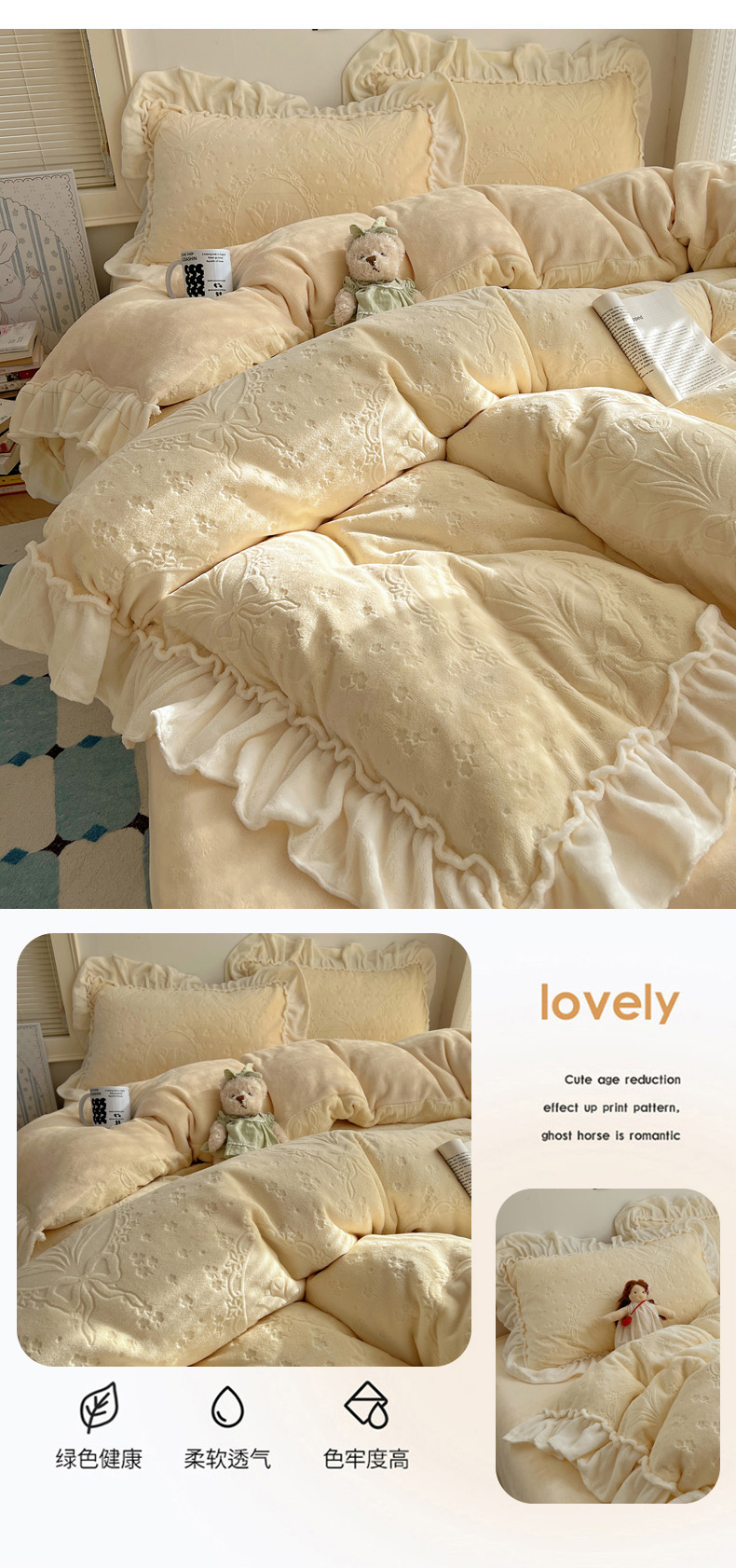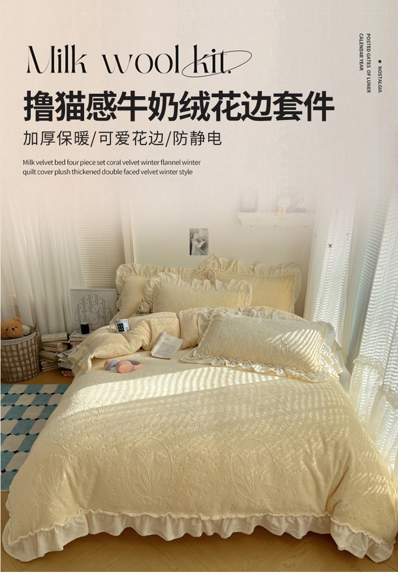 当前位置: 91家纺网 > 商品网购 > 床品套件 > 四件套 > 牛奶绒四件套 > 丽涵家纺 2025新款雕花牛奶绒公主风花边四件套郁香漫境 郁香漫境-奶油
