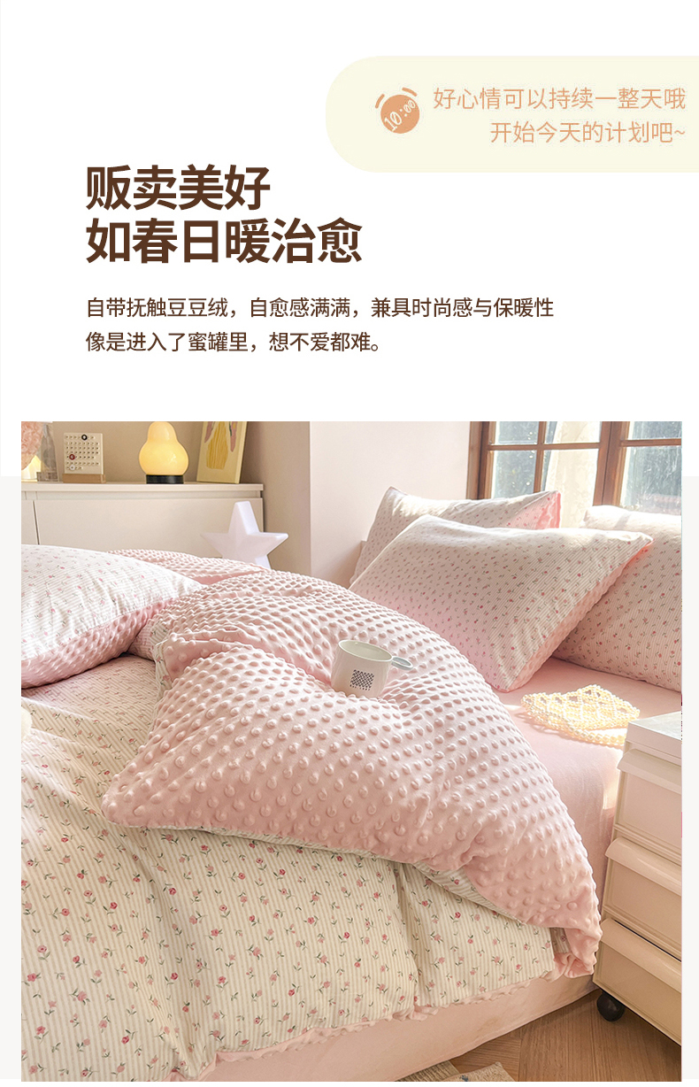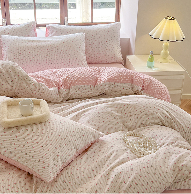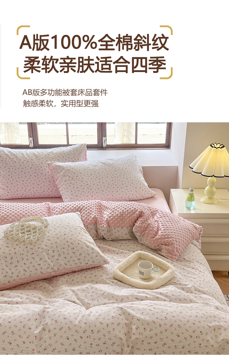 当前位置: 91家纺网 > 商品网购 > 床品套件 > 四件套 > 全棉普通四件套 > 麦伦家居 2025秋冬新品多功能床品全棉+豆豆绒四件套卡通小清新系列 粉色玫瑰