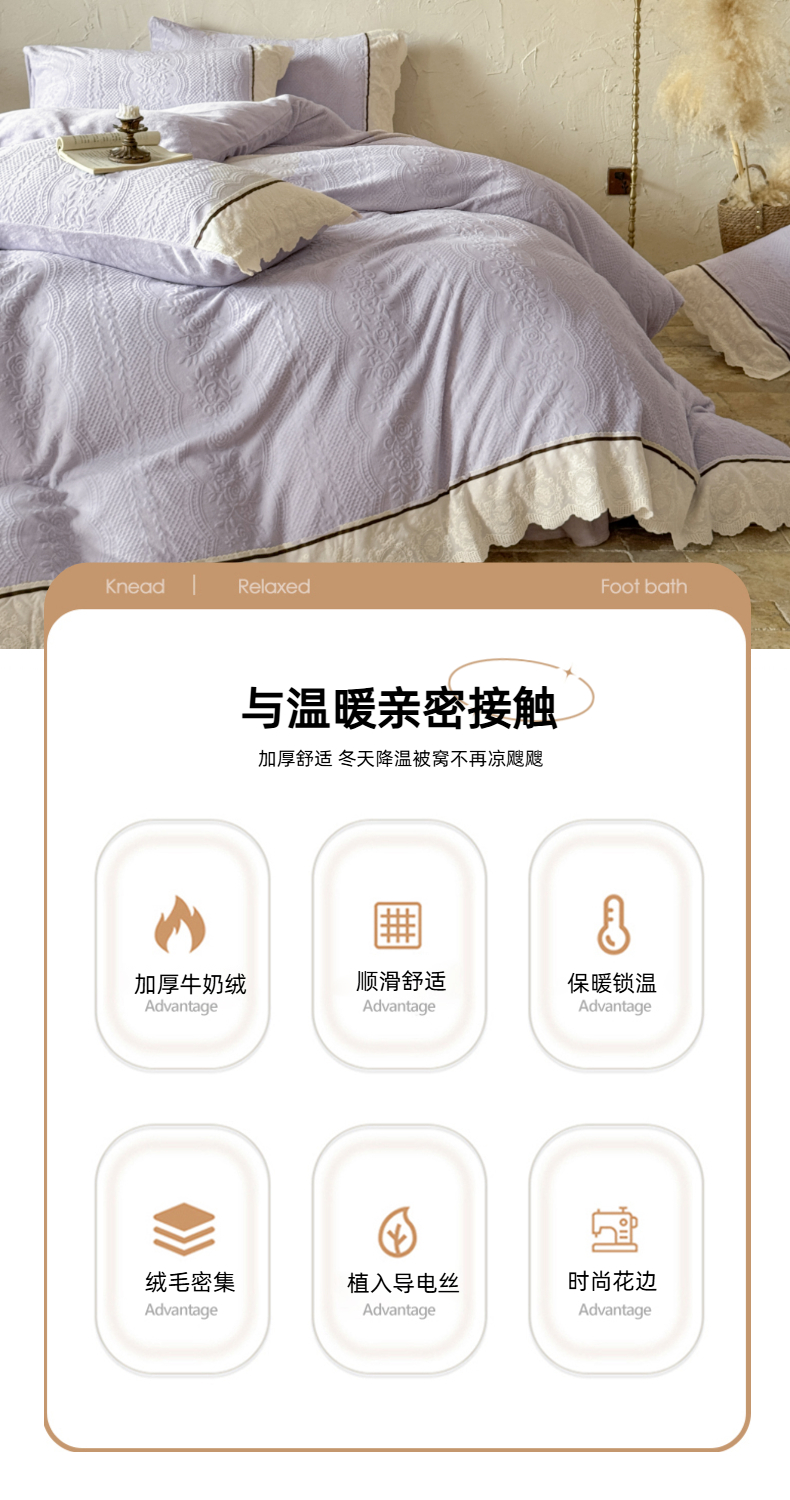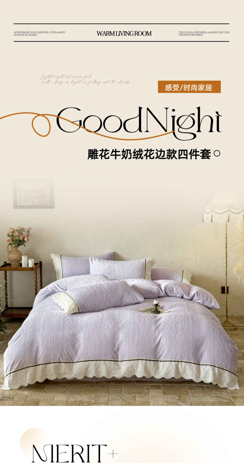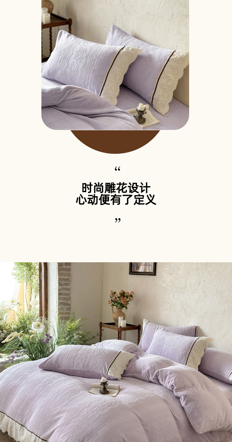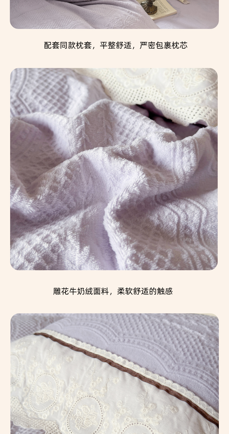 纯优家纺 2025新款秋冬轻法式花边款雕花牛奶绒四件套-绮梦 绮梦-芋泥紫