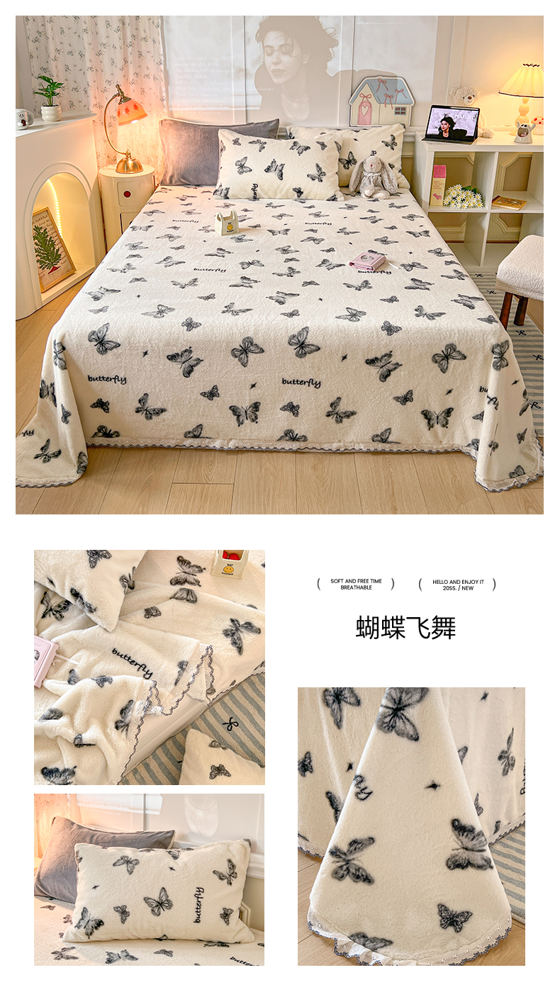 (总)妖妖家纺 2025新款高克重兔毛花边印花单床单 床单单件,爱心,斑点狗,斑点蝴蝶,豹纹,博士狗,蝴蝶飞舞,蝴蝶结,开心熊,狸猫纹,墨痕,木星纹,淘气猫,甜甜兔,枝繁叶茂