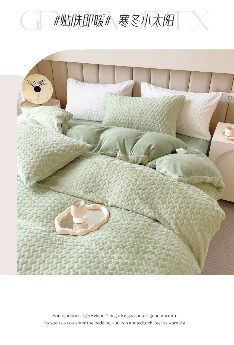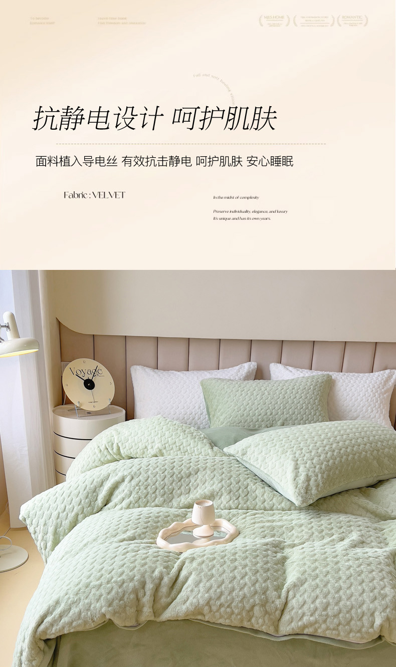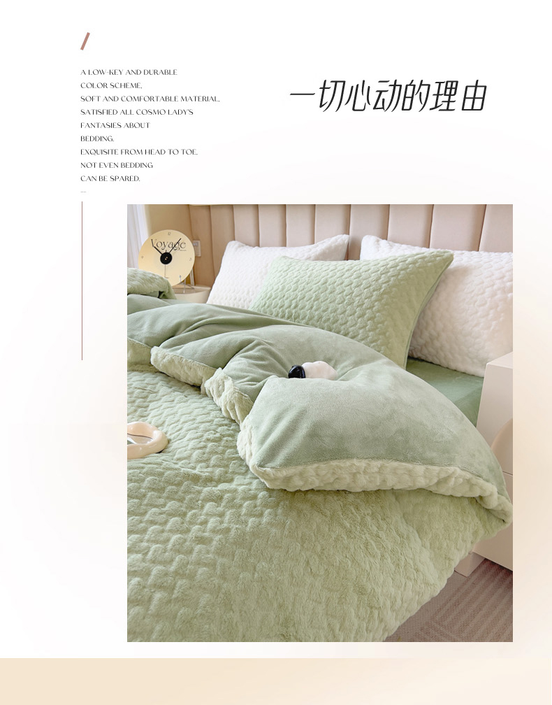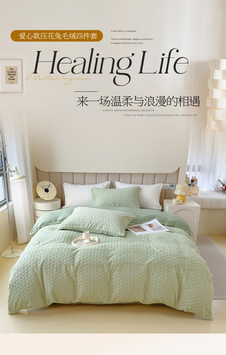 当前位置: 91家纺网 > 商品网购 > 床品套件 > 四件套 > 兔毛绒四件套 > 印季家纺 2025新款爱心款压花兔毛绒四件套 水绿
