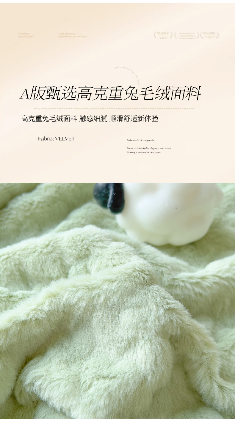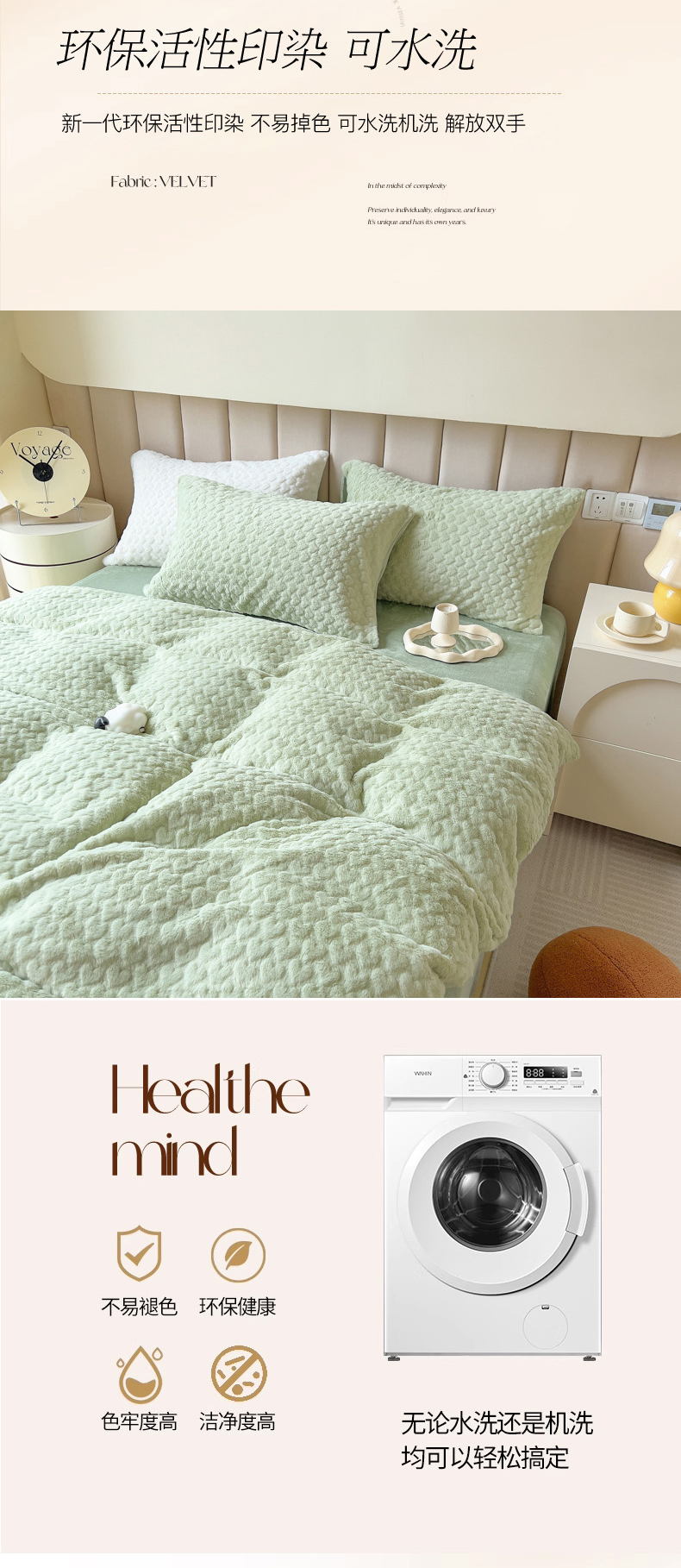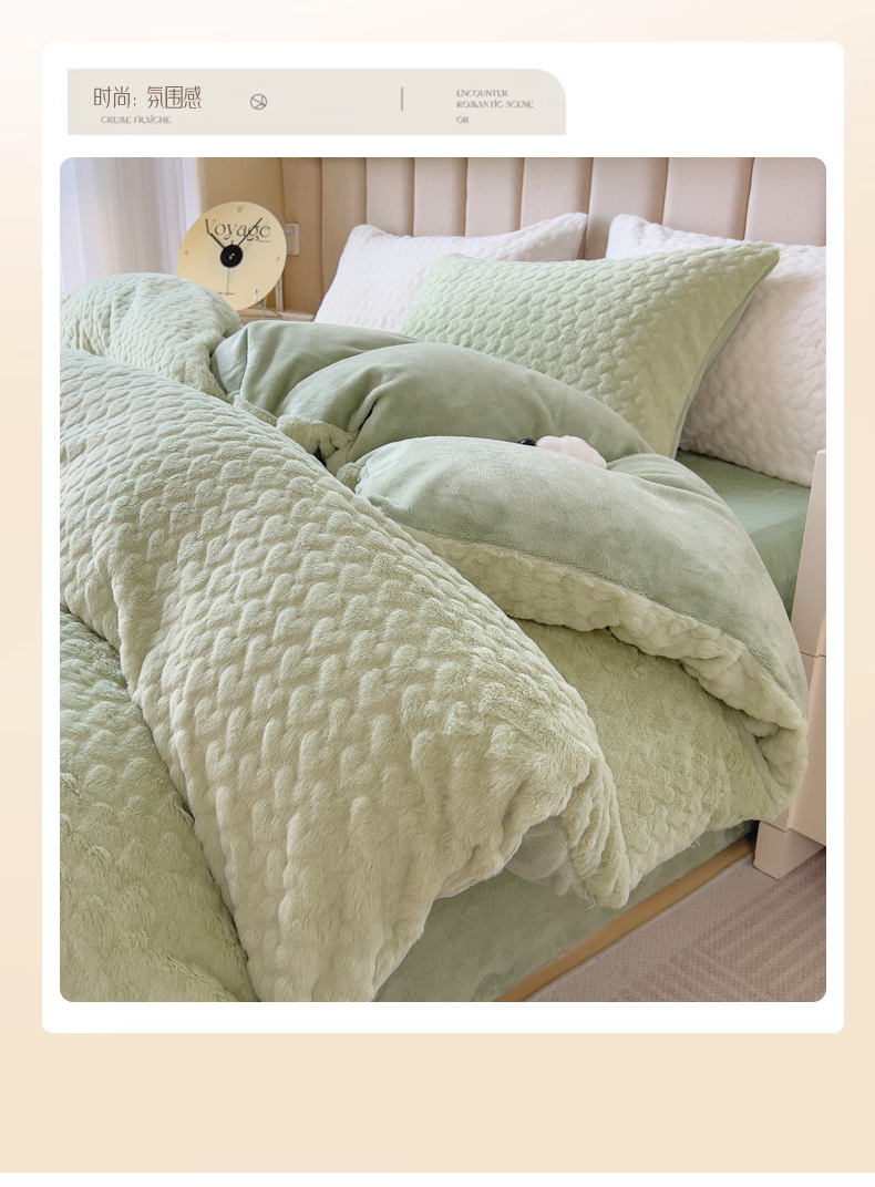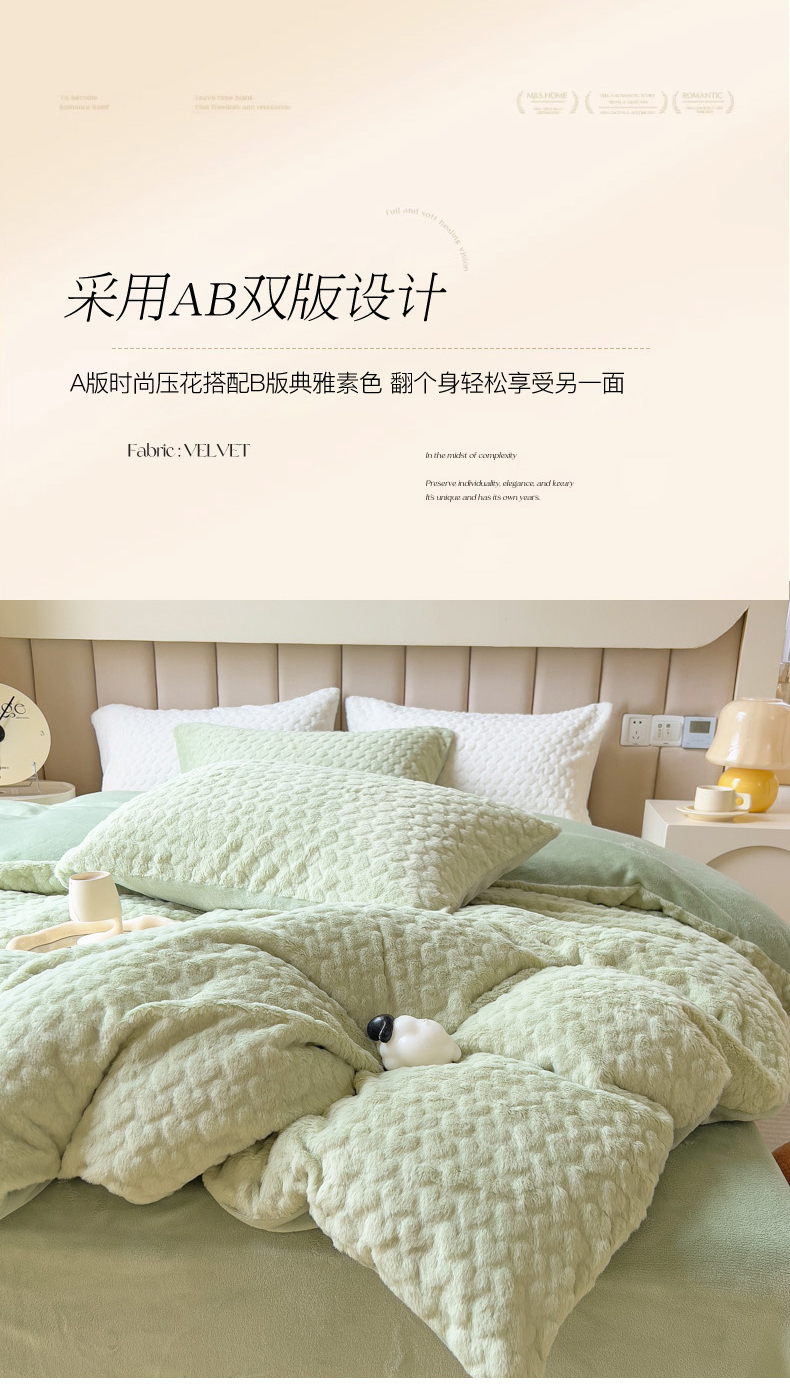 当前位置: 91家纺网 > 商品网购 > 床品套件 > 四件套 > 兔毛绒四件套 > 印季家纺 2025新款爱心款压花兔毛绒四件套 水绿