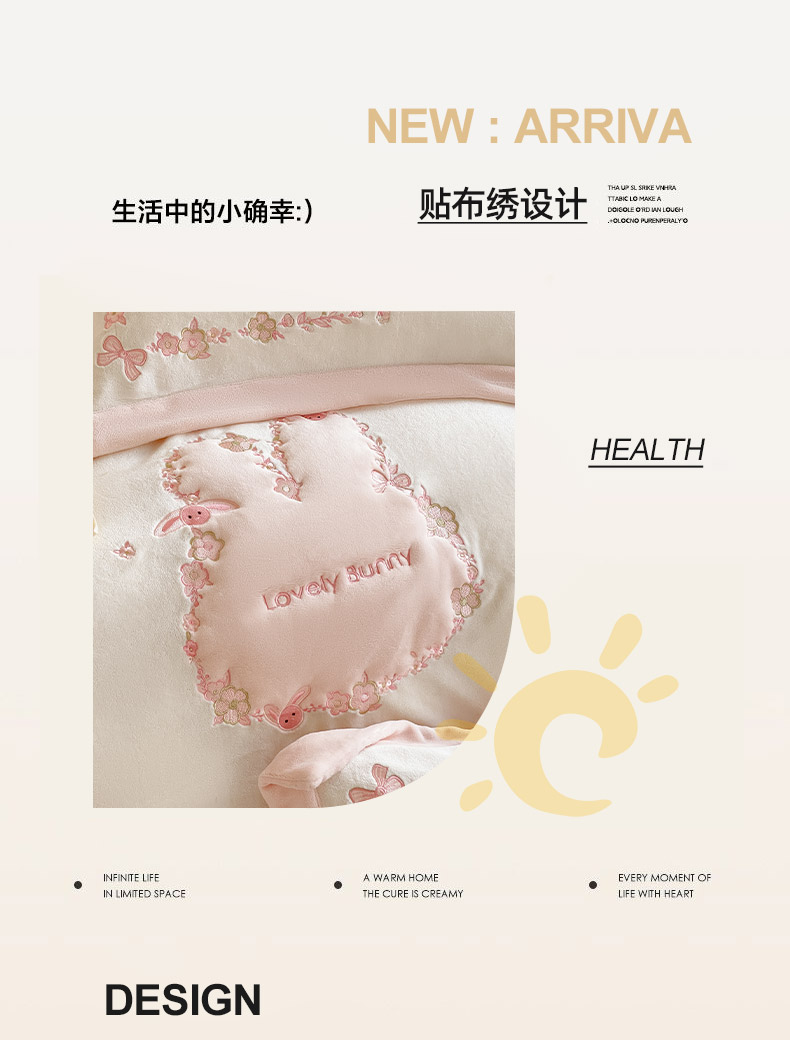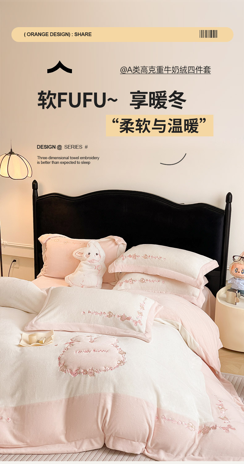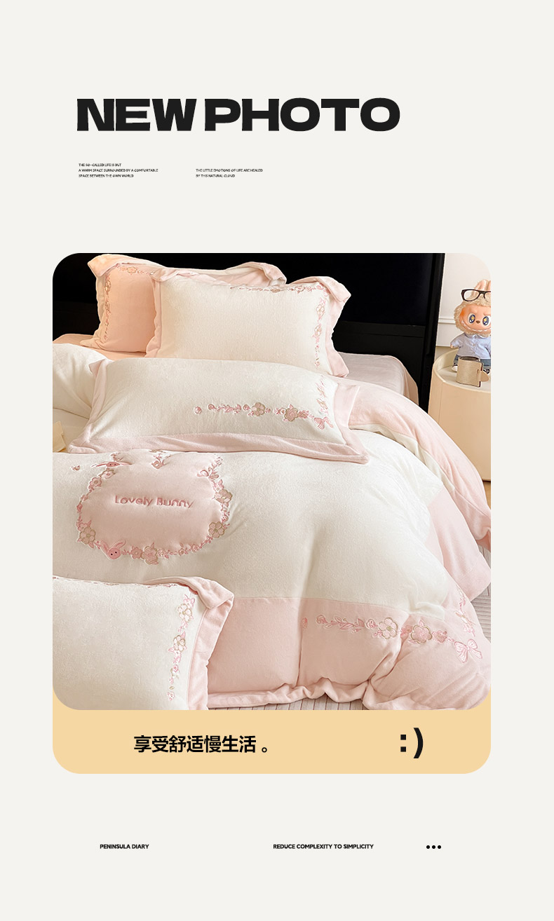 商品名称:2025直播热款A类加厚牛奶绒四件套保暖双面加绒珊瑚绒重工刺绣被套床单冬季床上用品-妮可兔 妮可兔-白粉