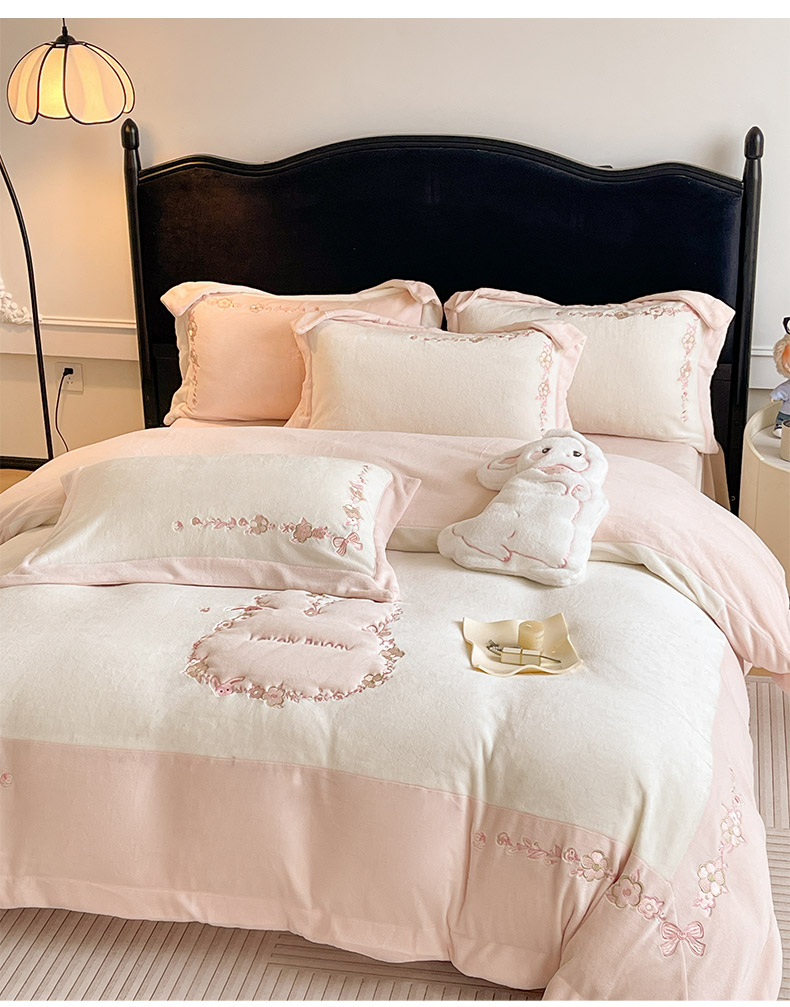 2025直播热款A类加厚牛奶绒四件套保暖双面加绒珊瑚绒重工刺绣被套床单冬季床上用品-妮可兔 妮可兔-白粉
