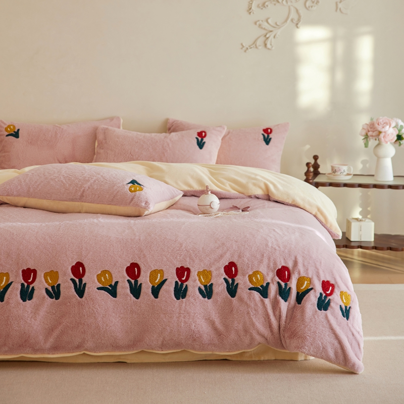 初拾 2025新款亲肤舒适兔毛牛奶绒毛巾绣四件套-郁金香花海(会员减20 控价:淘宝券后不低于298元 直播不低于298元) 郁金香花海- 粉