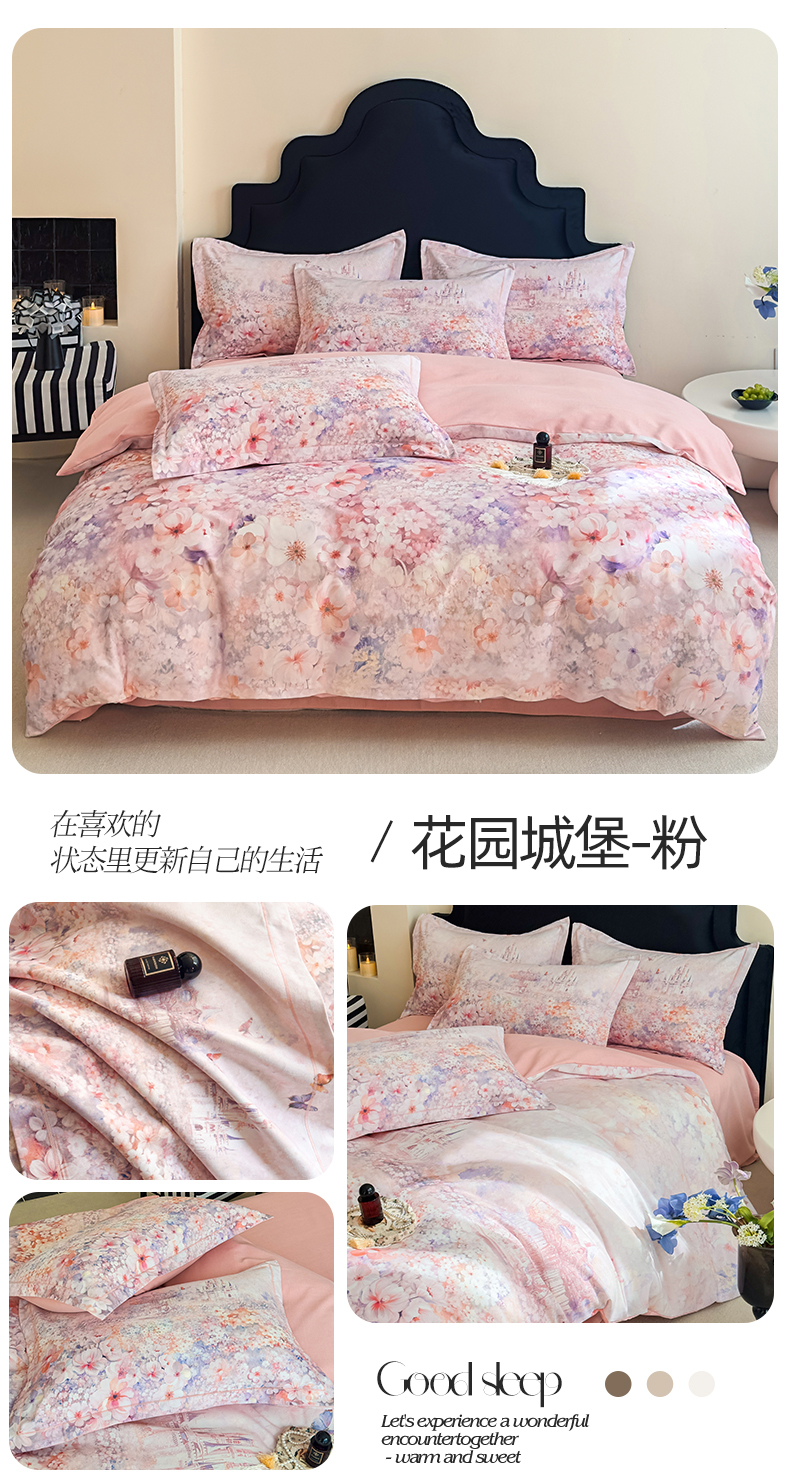 喜四方 2025新款加厚全棉大版印花四件套 花园城堡-粉