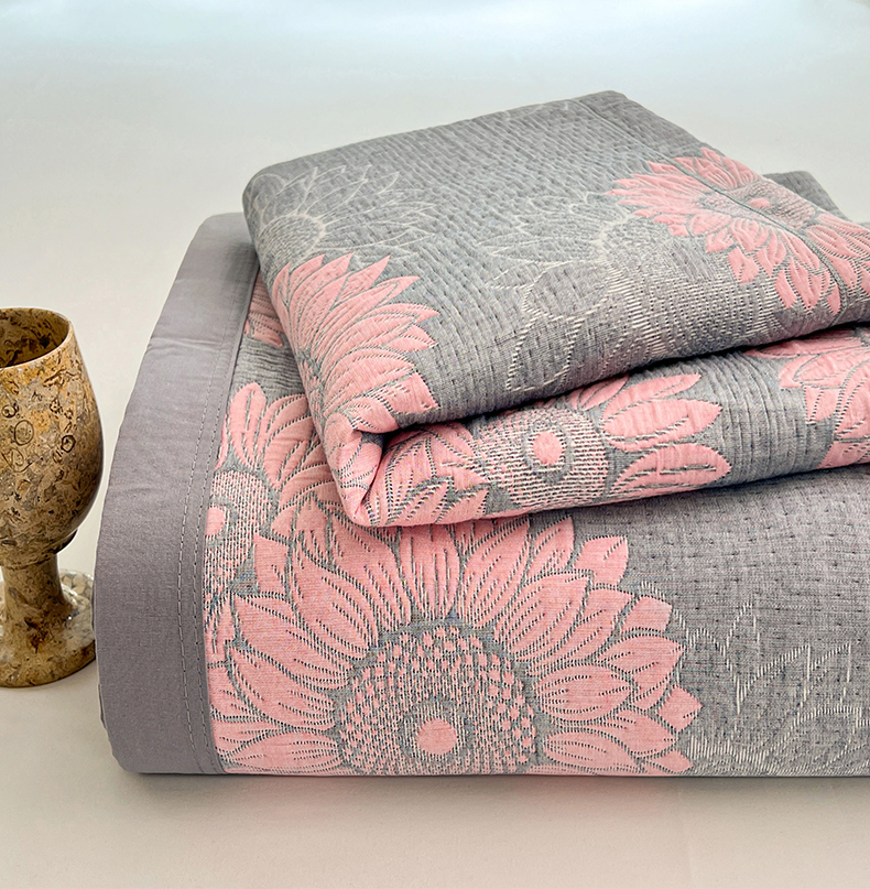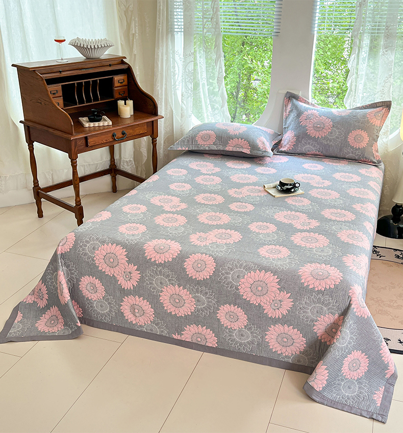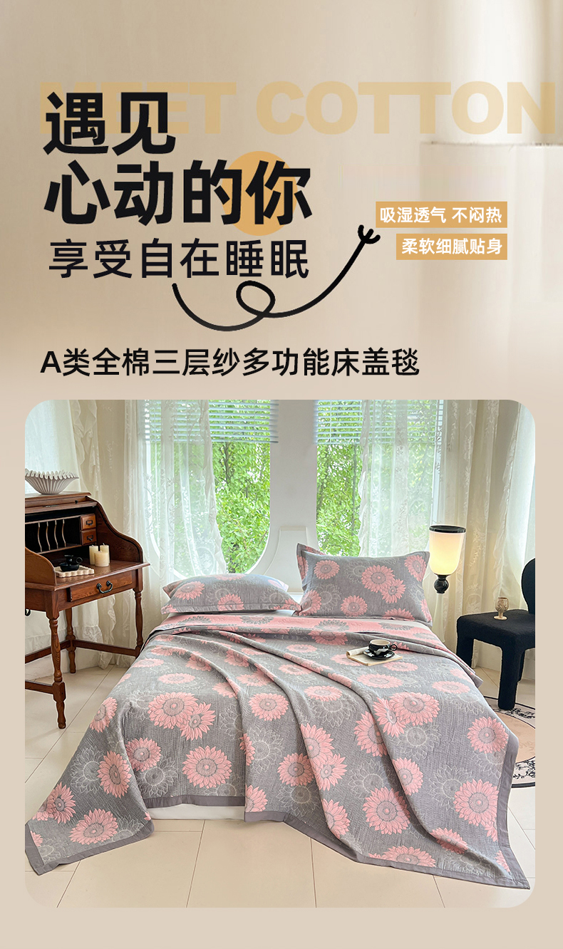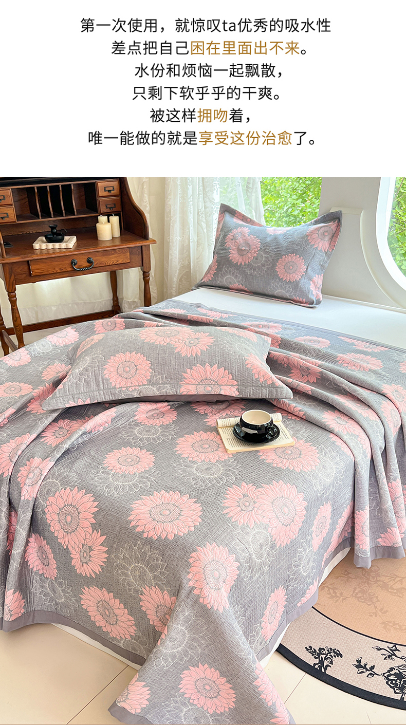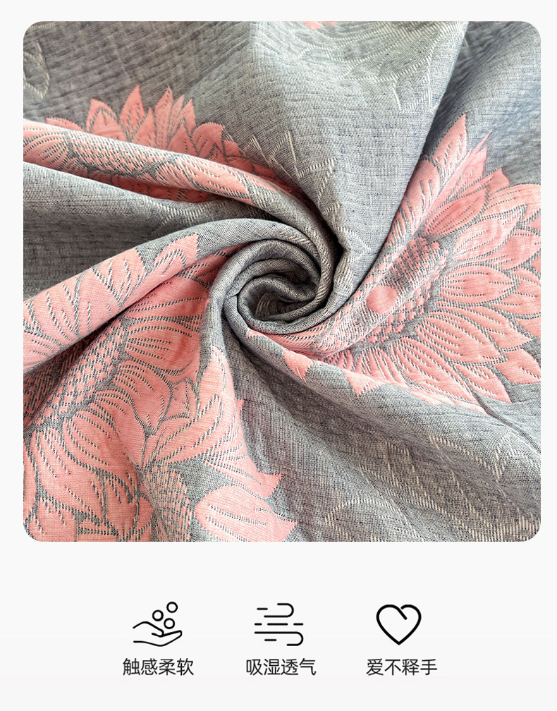 商品名称:yyds网供 2025新款A类色织全棉三层纱布床盖三件套喷气夹棉盖毯夏被厚床单多功能榻榻米风格二 暖阳灰粉