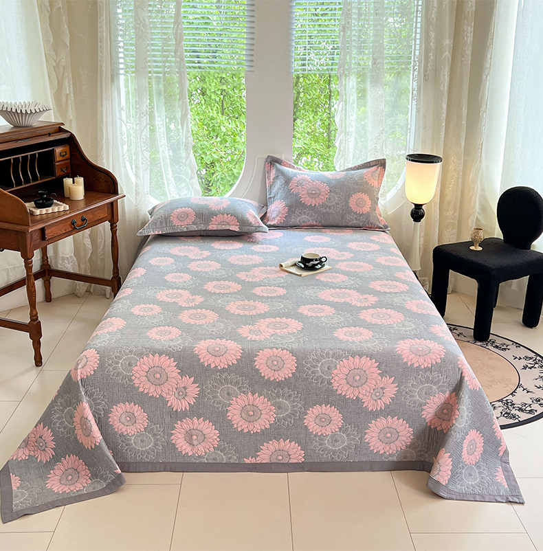 yyds网供 2025新款A类色织全棉三层纱布床盖三件套喷气夹棉盖毯夏被厚床单多功能榻榻米风格二 暖阳灰粉