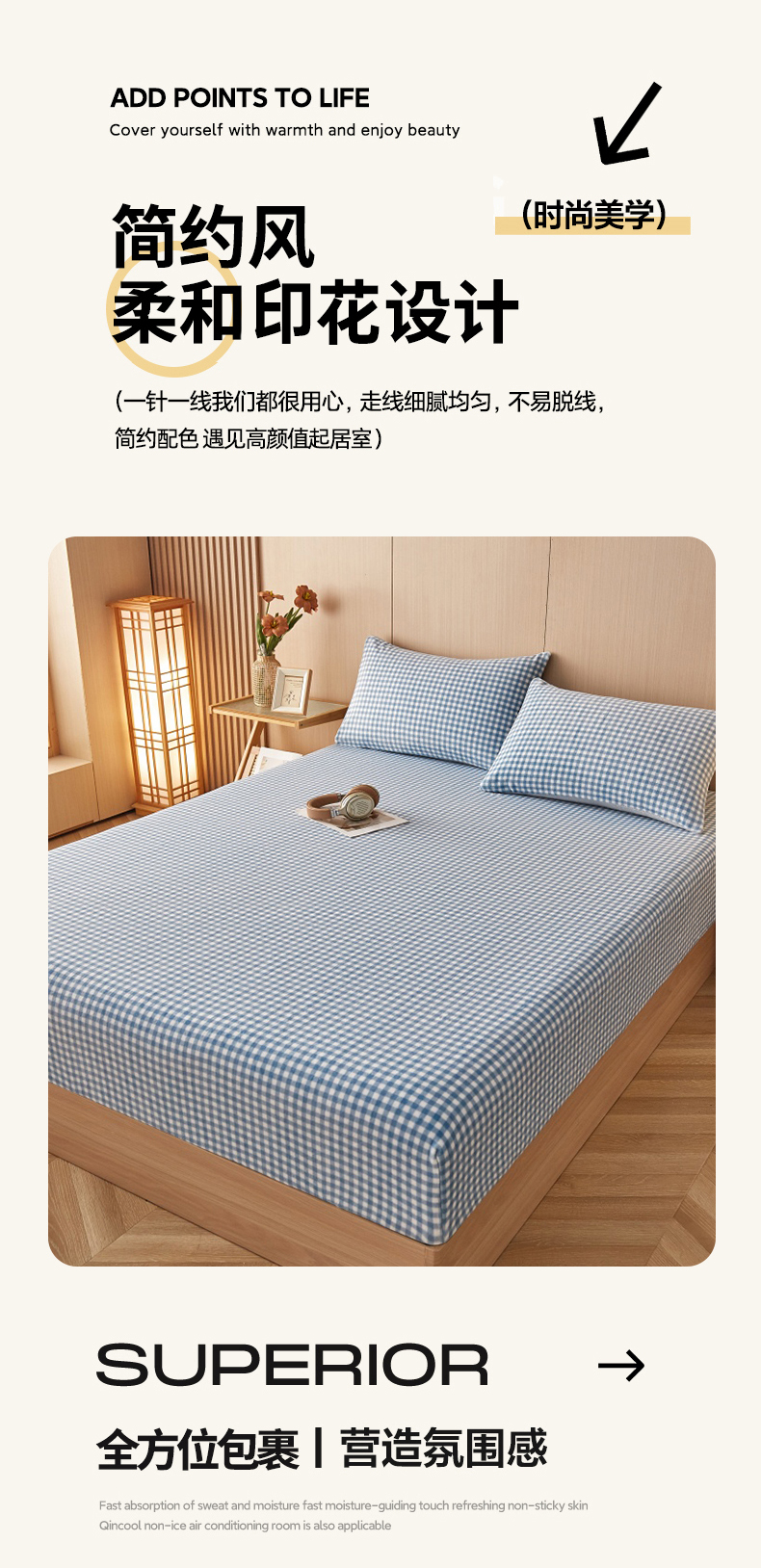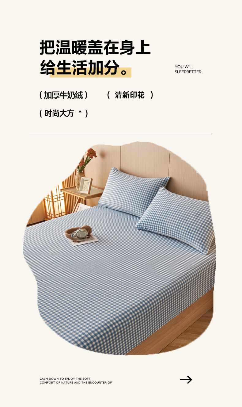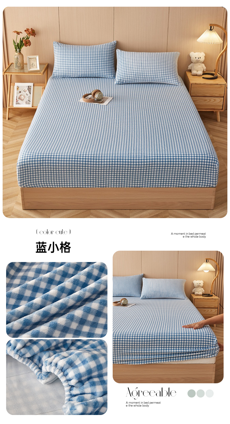 (总)一禾 2025新款简约印花高克重牛奶绒床笠,彩波点,简兮粉,简兮蓝,简兮绿,蓝大格,蓝小格,维卡蓝
