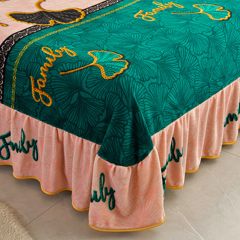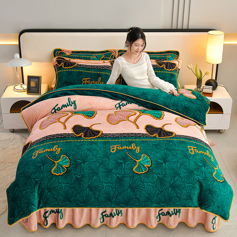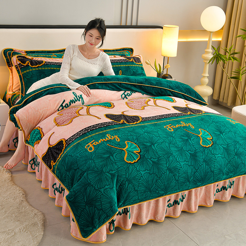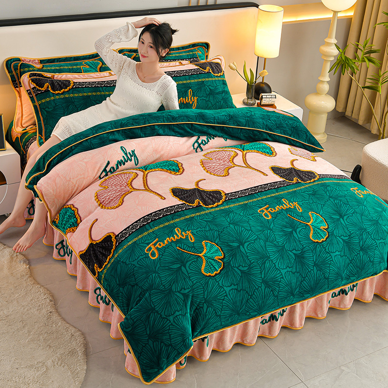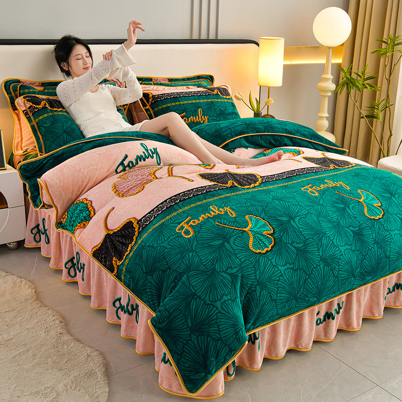 妮恒美 2025新款牛奶绒印花床裙款四件套法莱绒四件套珊瑚金貂绒四件套 三生有杏