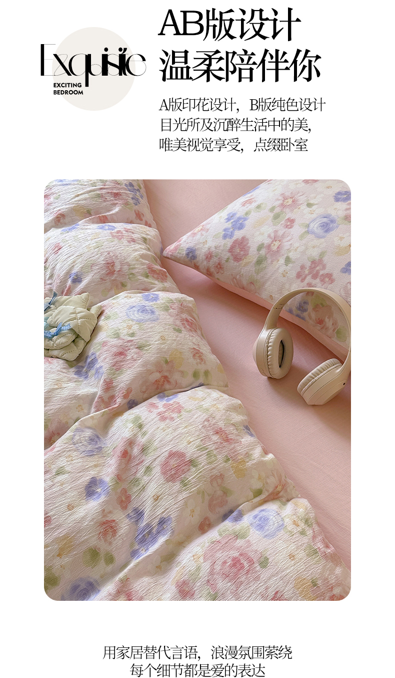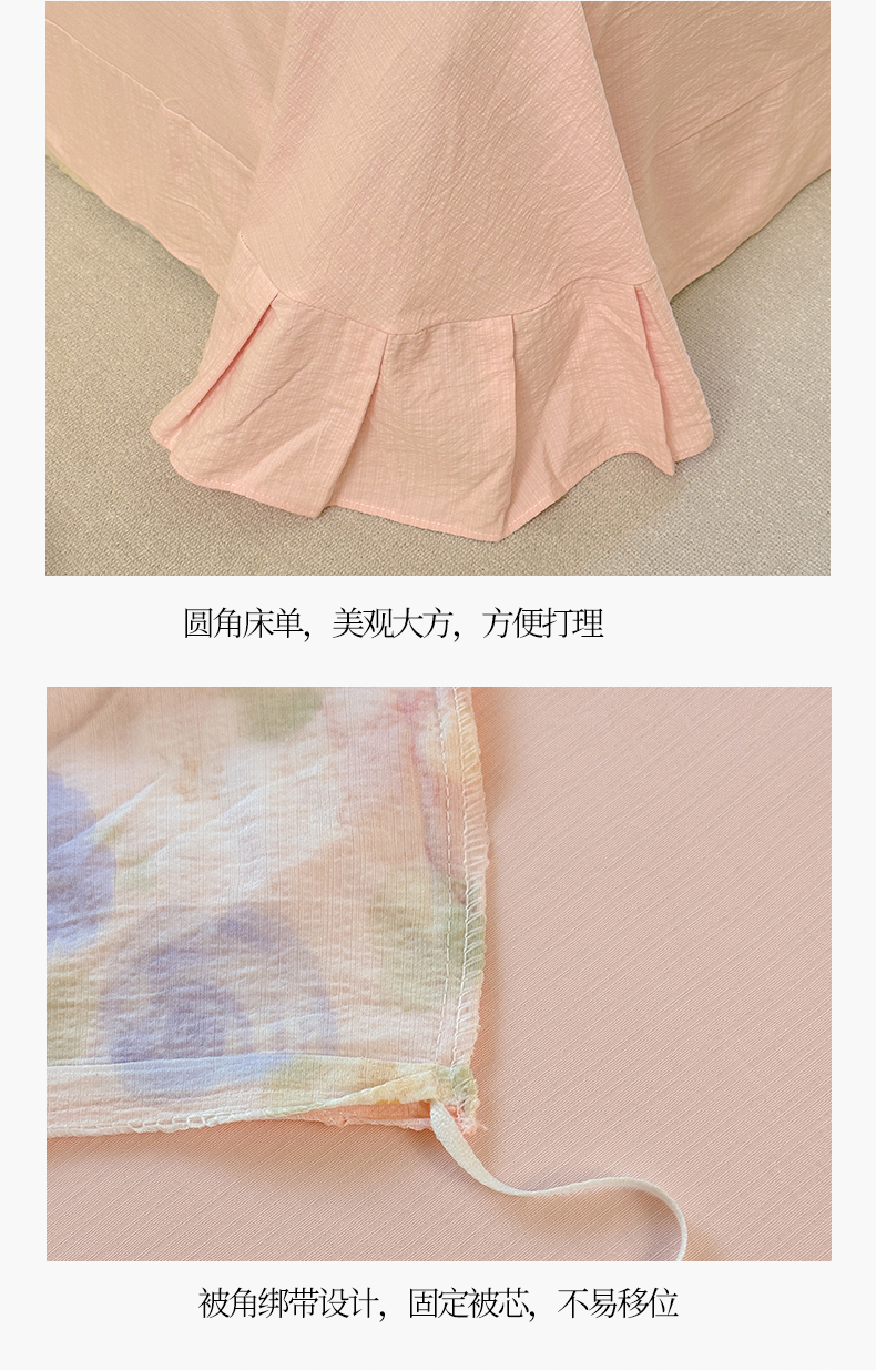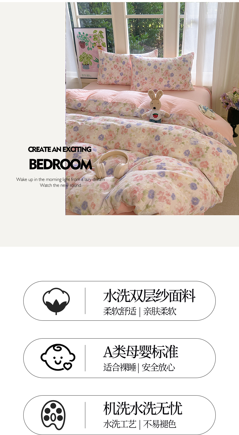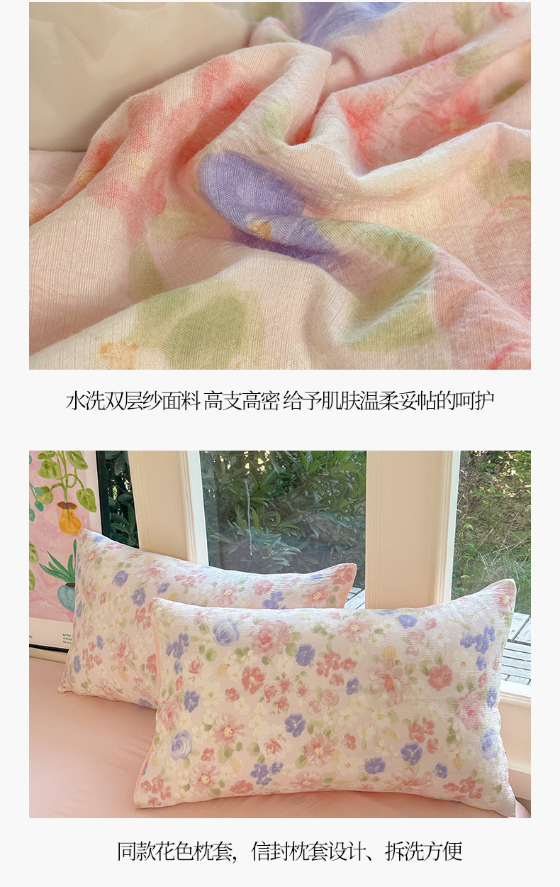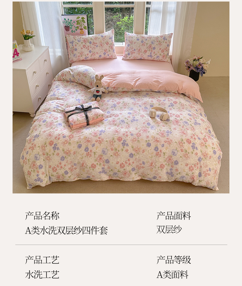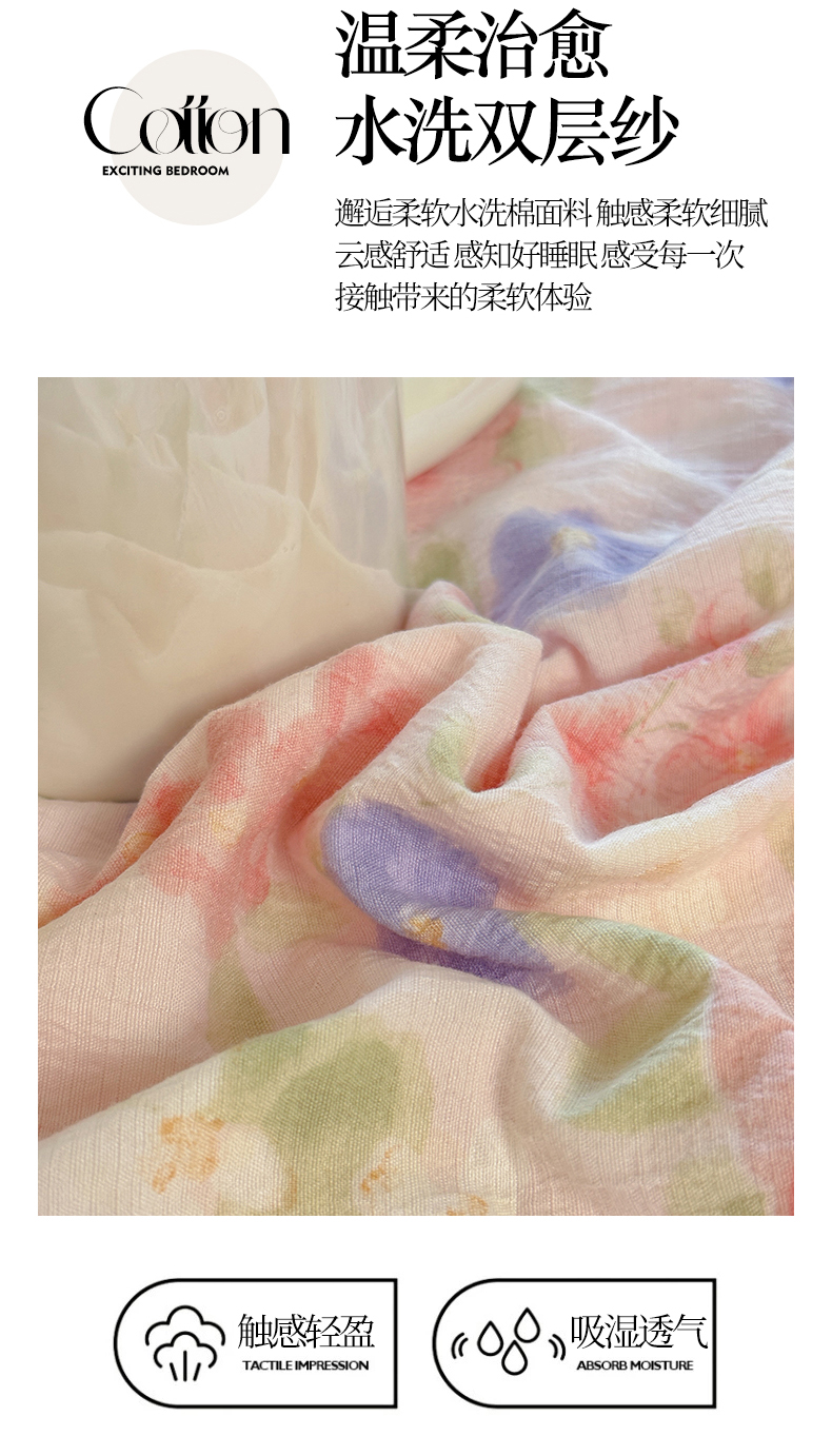商品名称:(总)桔禾家纺 2025新款小清新水洗棉有氧双层纱印花云感木棉皱皱纱四件套