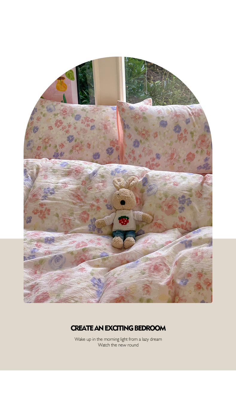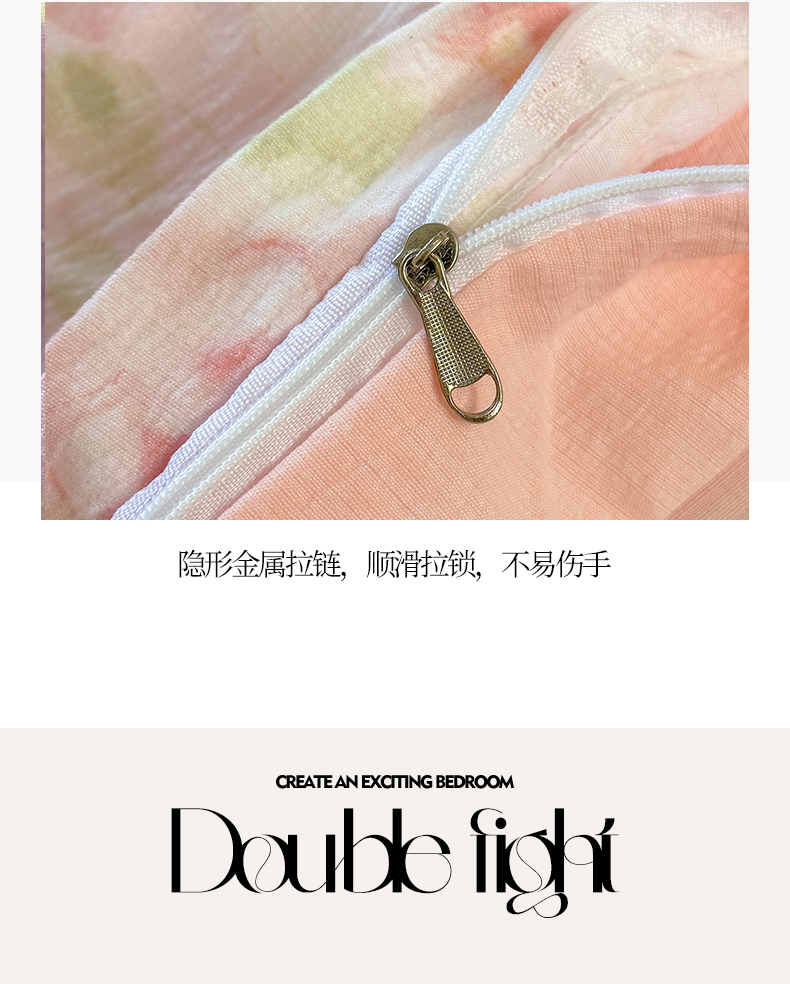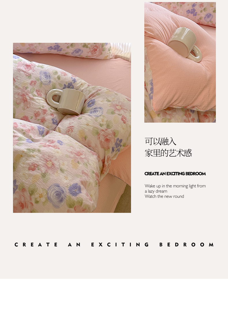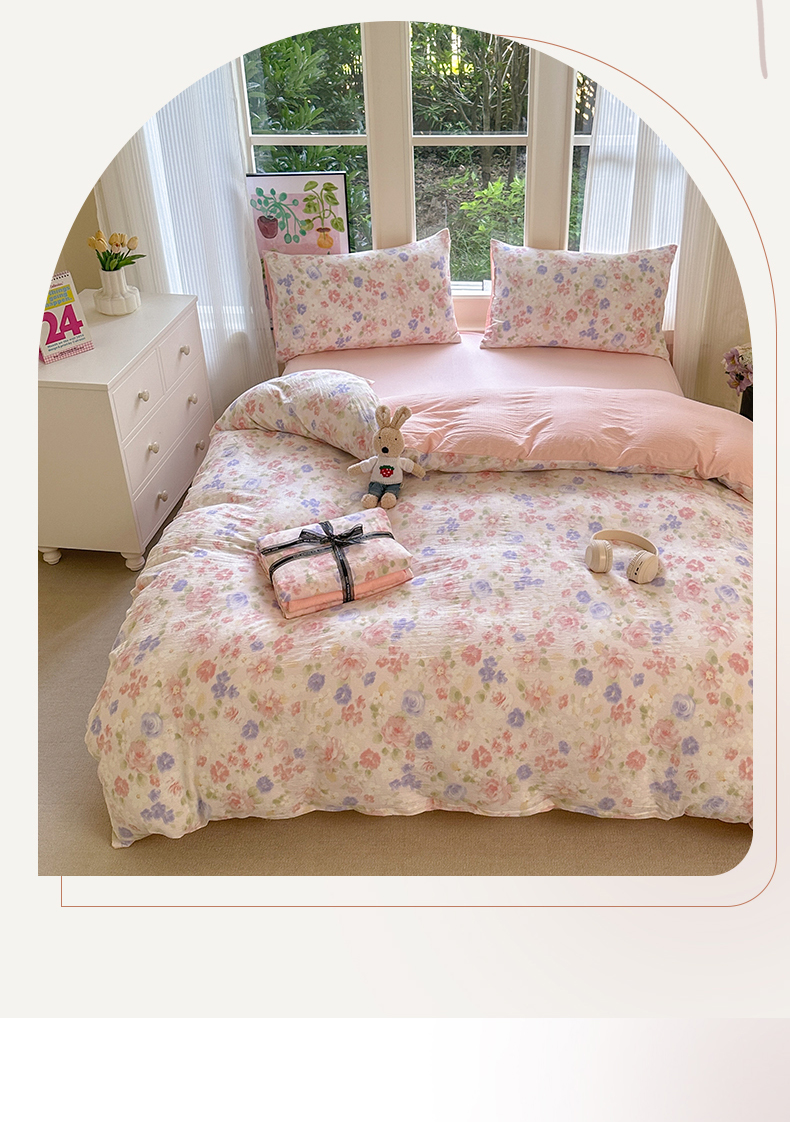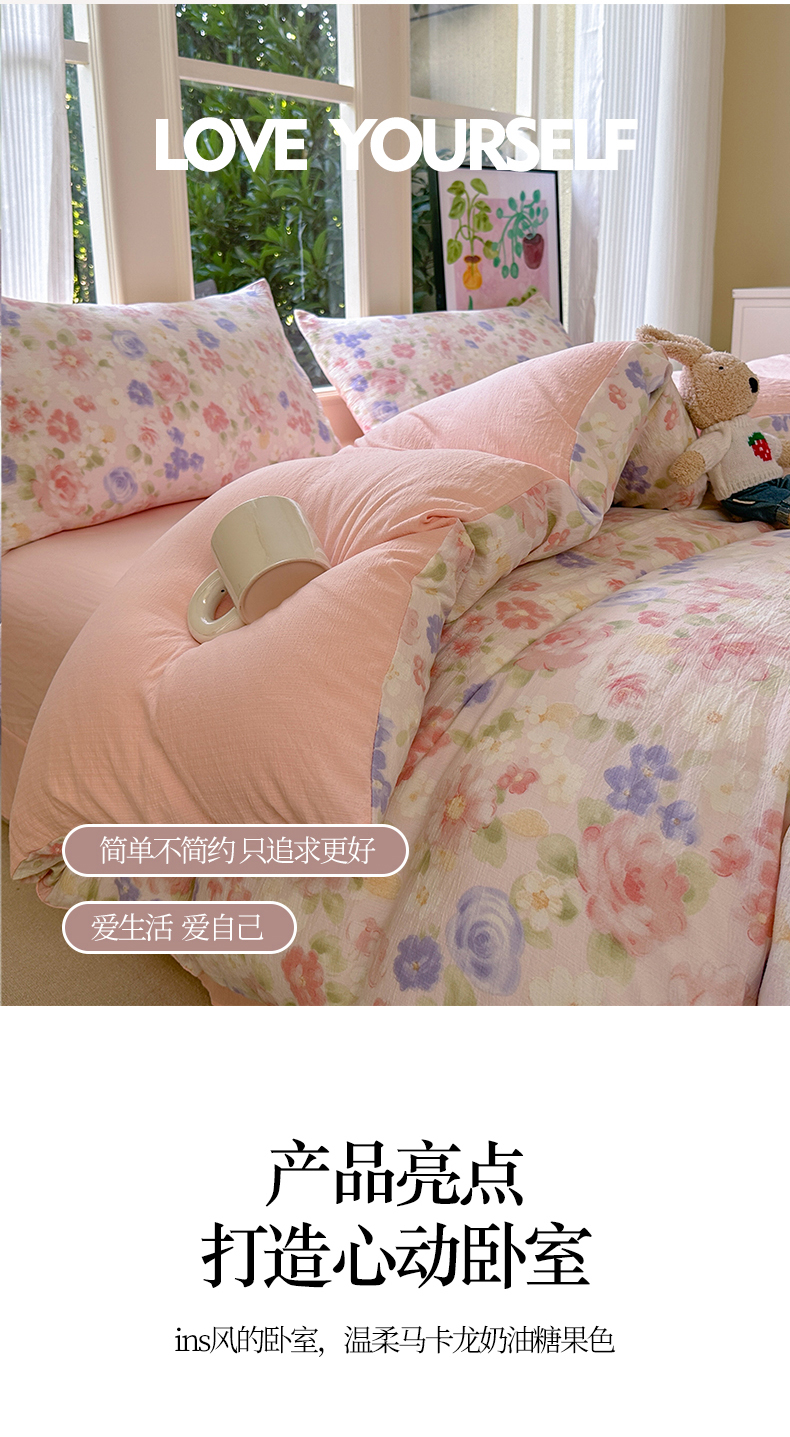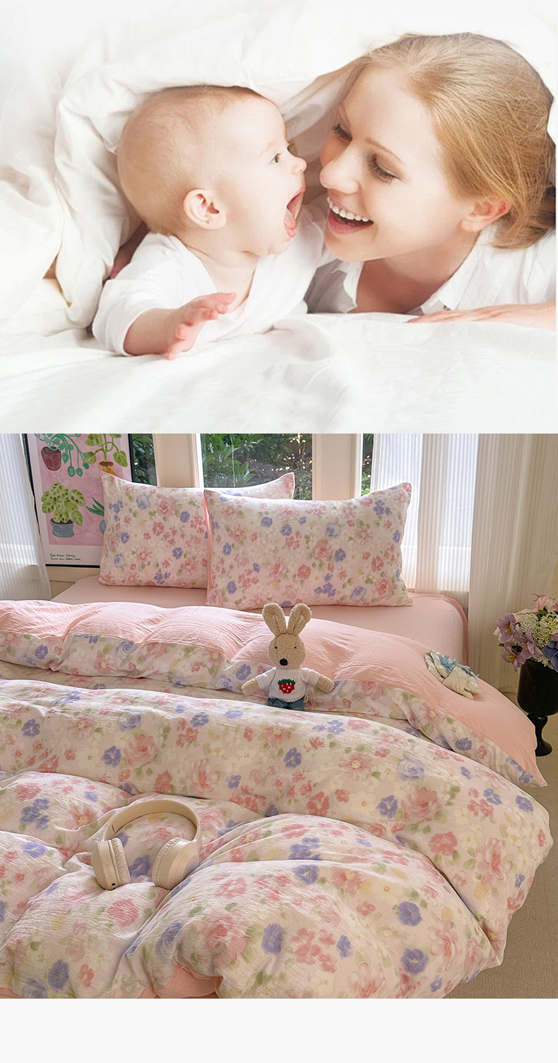 商品名称:(总)桔禾家纺 2025新款小清新水洗棉有氧双层纱印花云感木棉皱皱纱四件套
