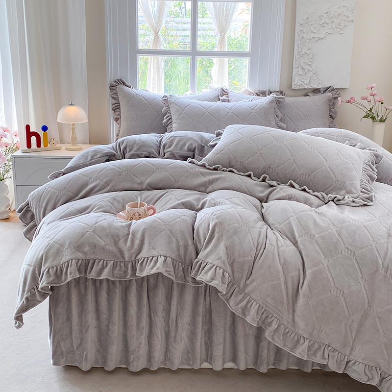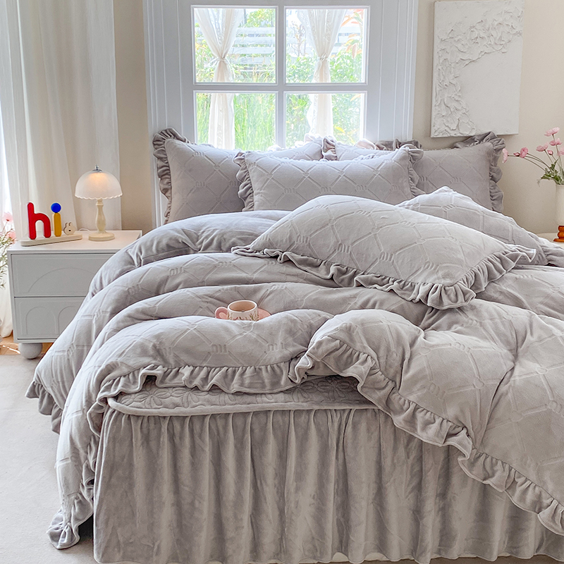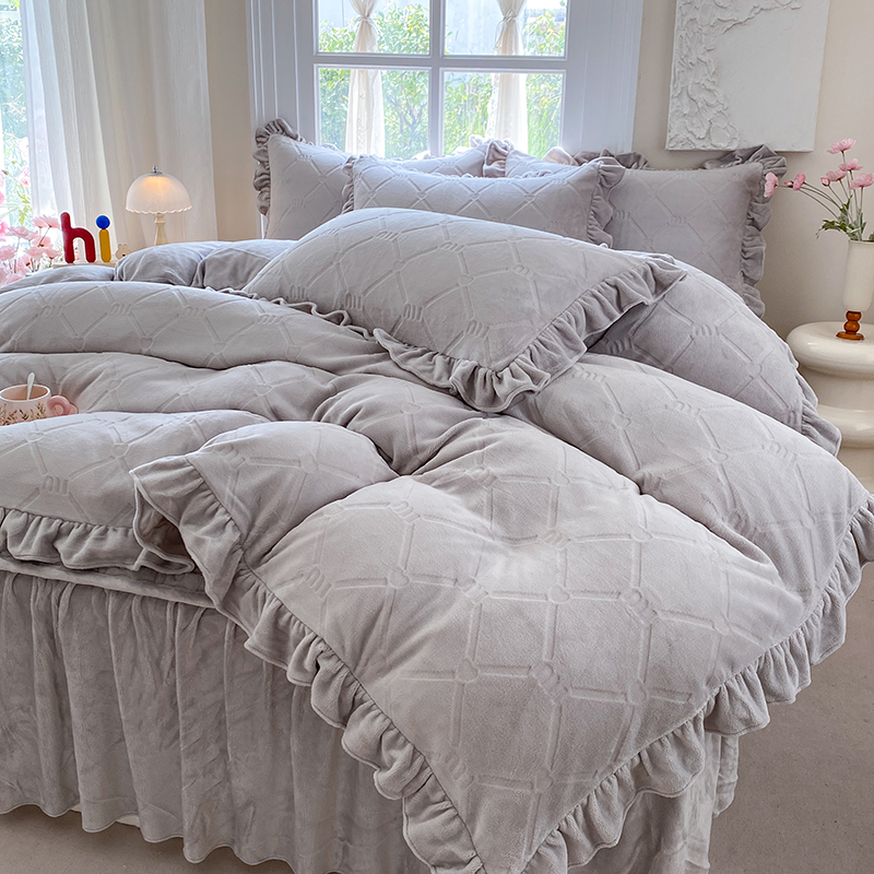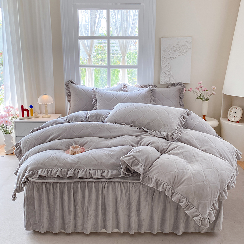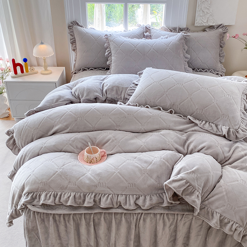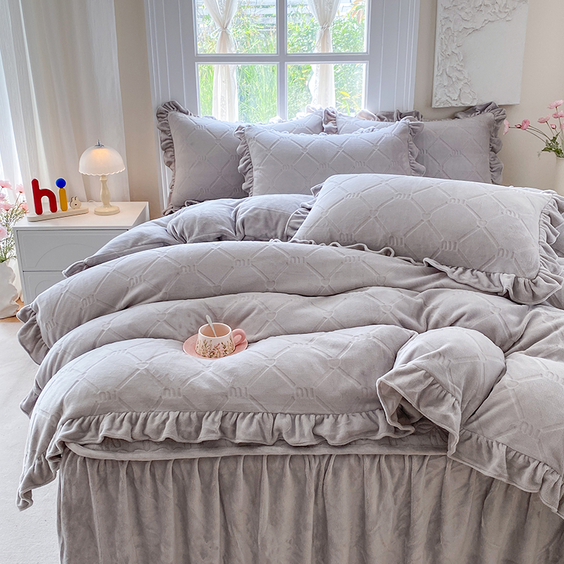商品名称:乐嘉盈 2025新款雕花牛奶绒床裙款四件套-字母菲菲 字母菲菲-灰色