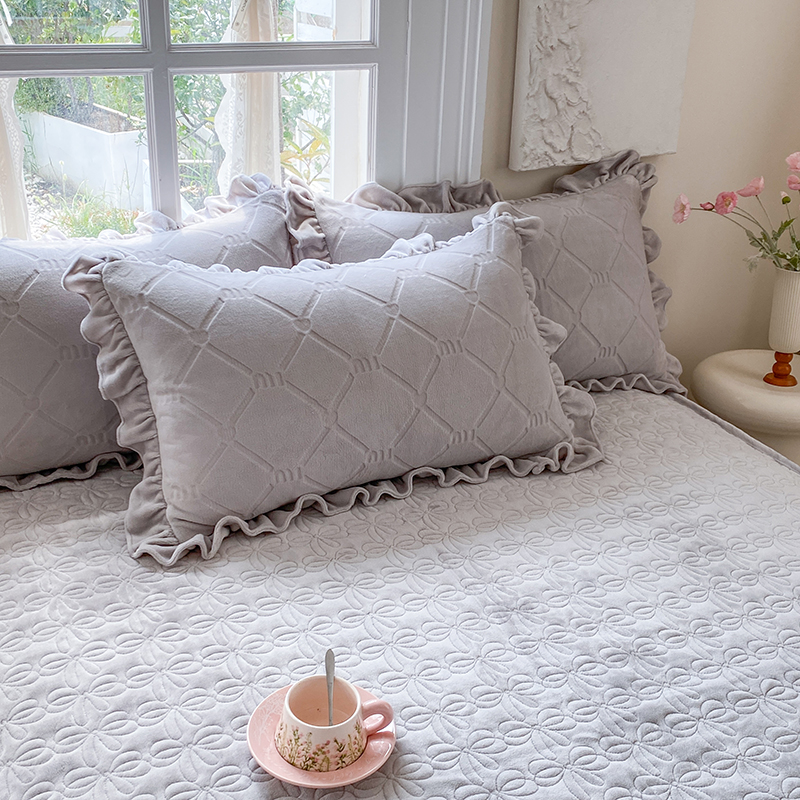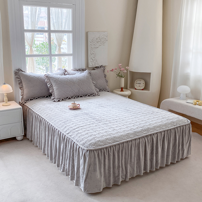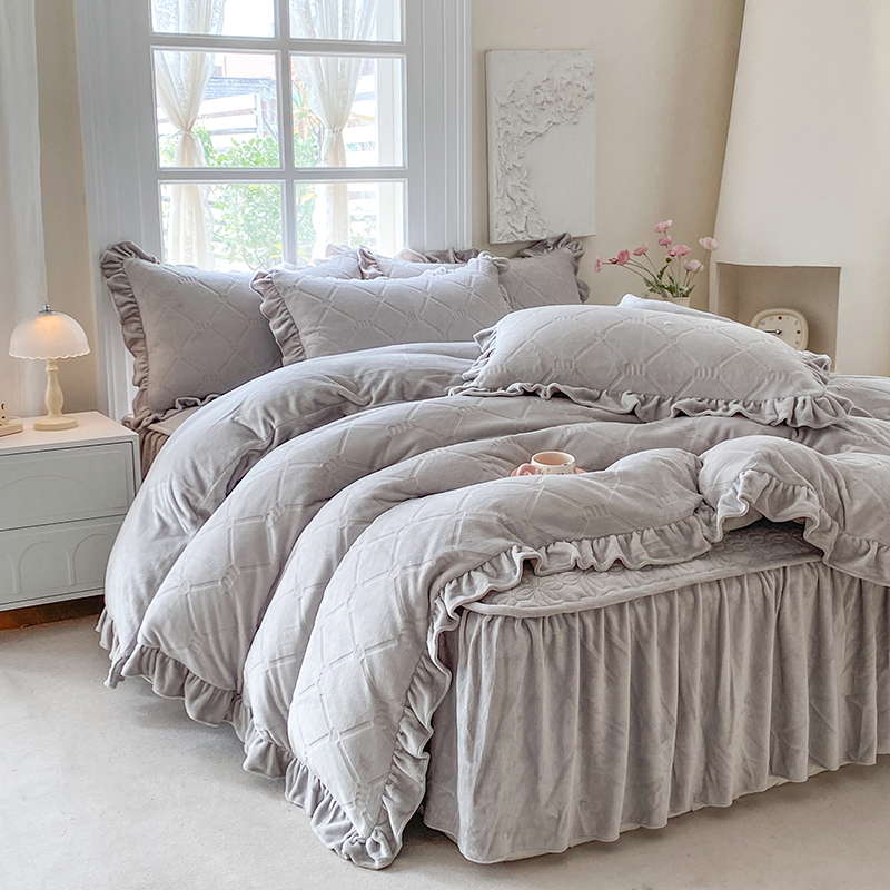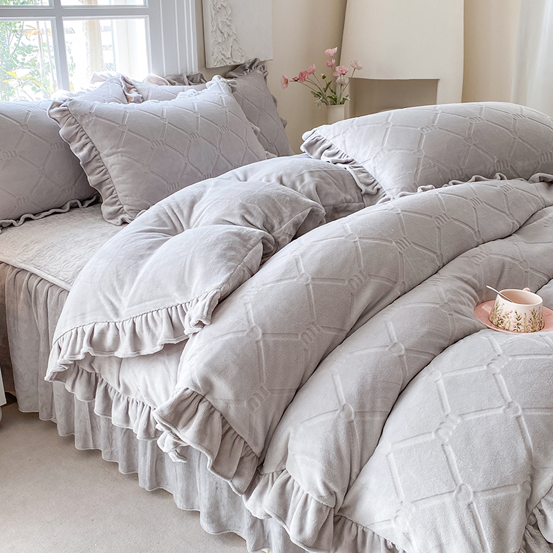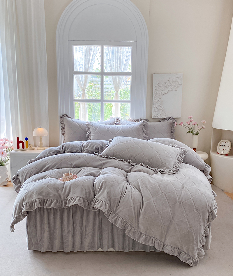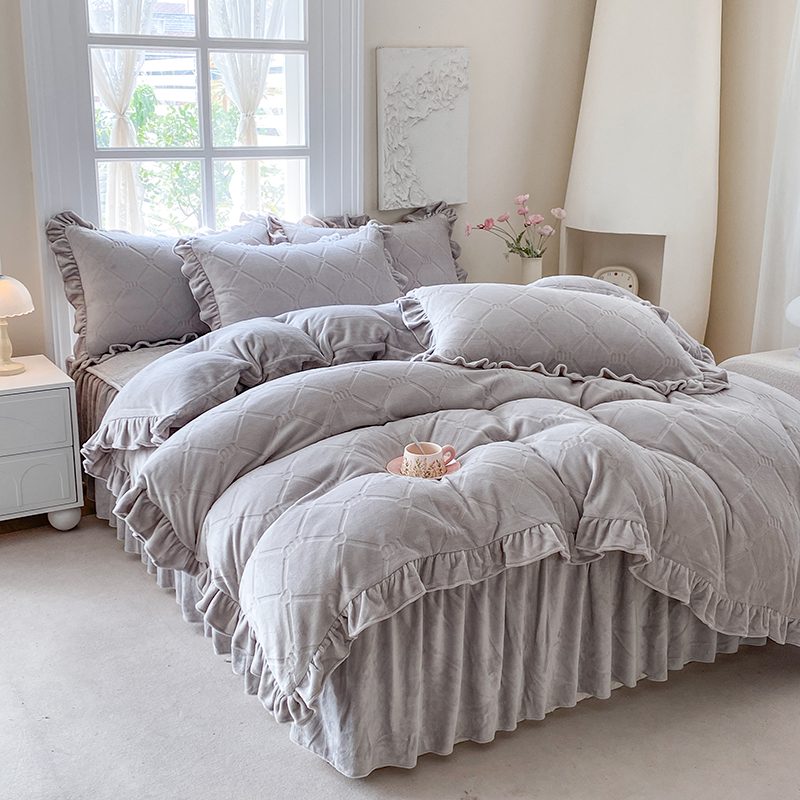 商品名称:乐嘉盈 2025新款雕花牛奶绒床裙款四件套-字母菲菲 字母菲菲-灰色
