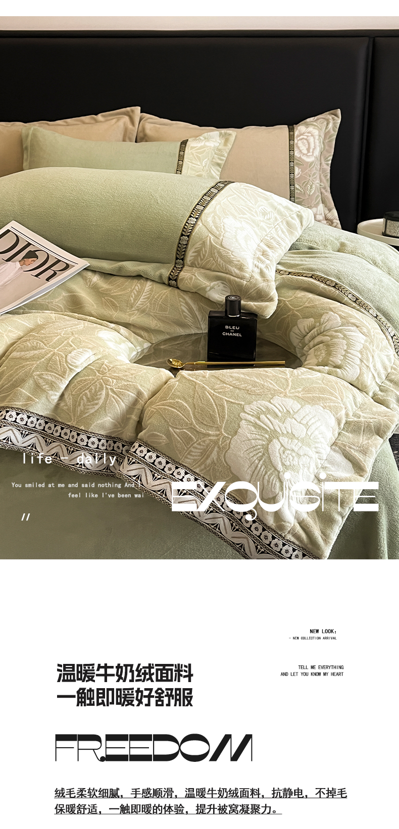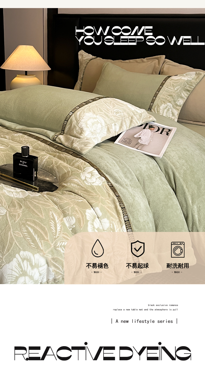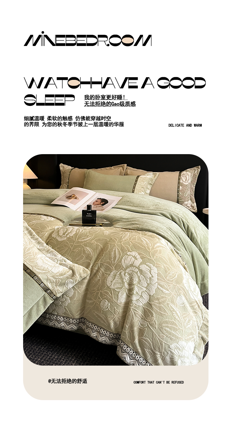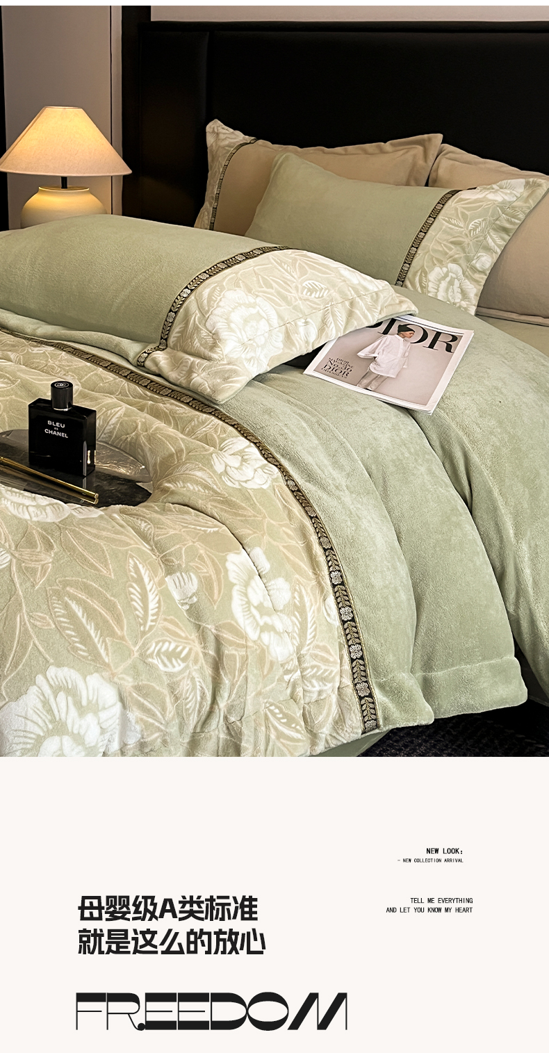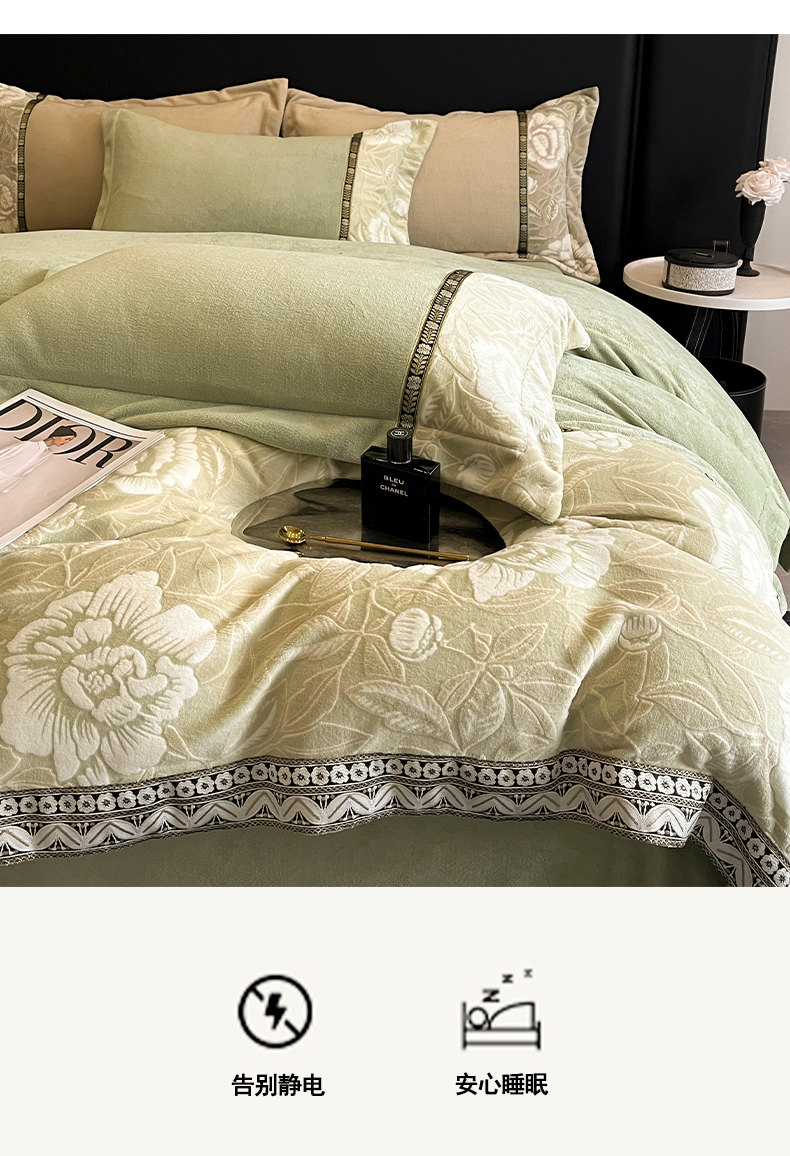 当前位置: 91家纺网 > 商品网购 > 床品套件 > 四件套 > 牛奶绒四件套 > 帝王家纺 2025新款刺绣雕花加厚保暖牛奶绒四件套冬季珊瑚绒 控价: 淘宝标准¥208,小号¥178.拼多多标准¥168,小号¥138. (谢谢配合) 花绒月貌-绿