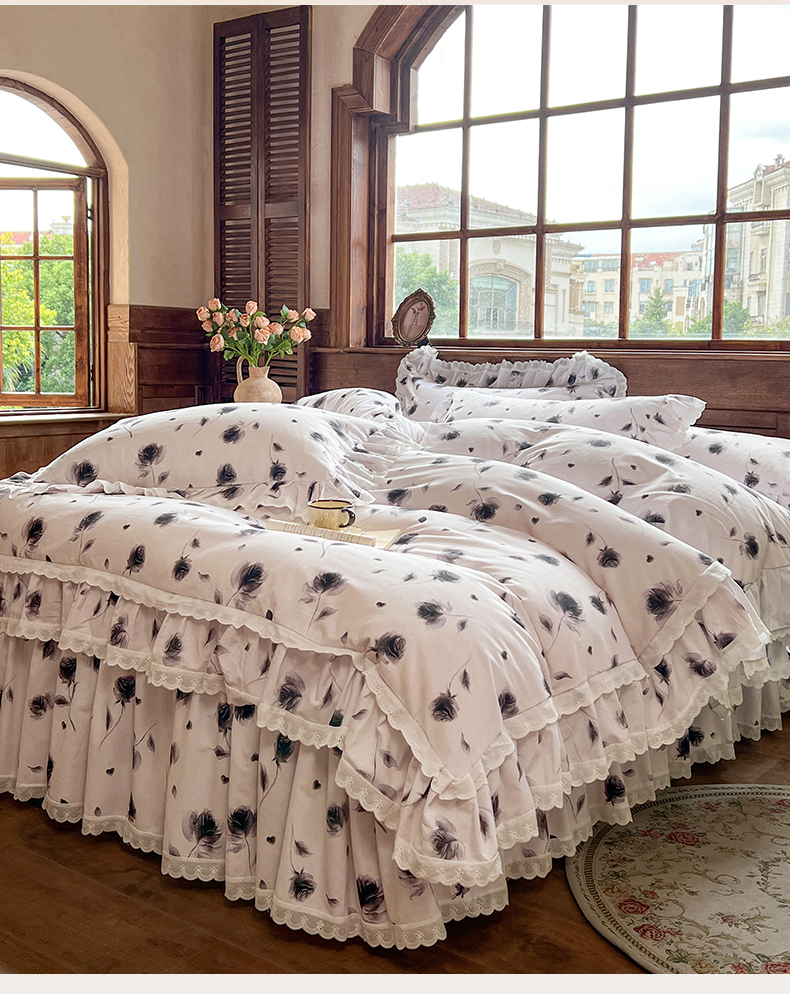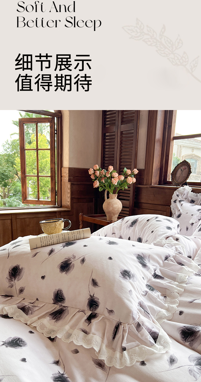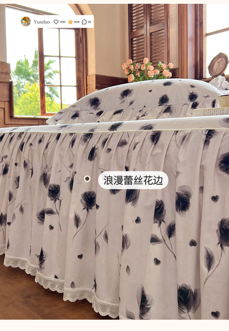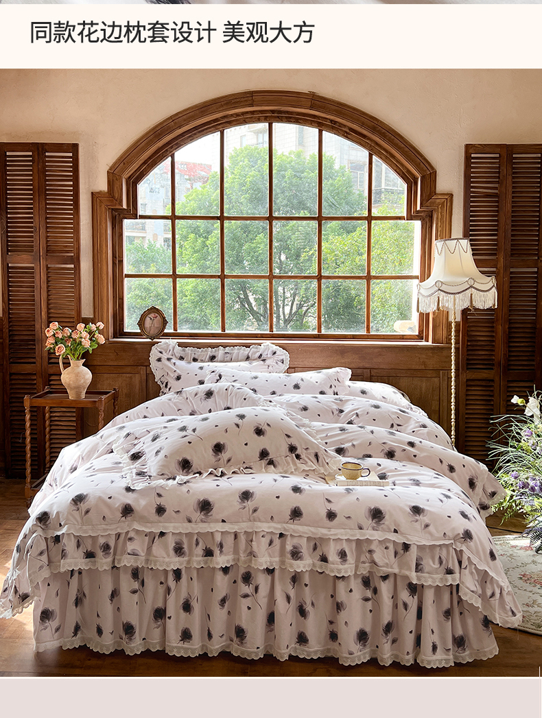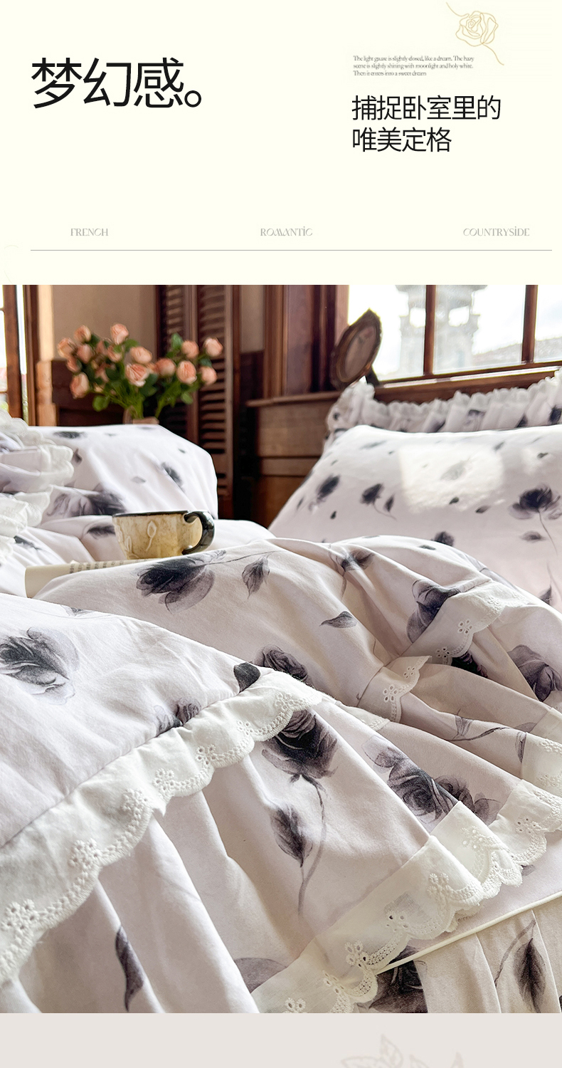 当前位置: 91家纺网 > 商品网购 > 床品套件 > 四件套 > 全棉普通四件套 > 网红馆(ck家纺) 2025新款全棉磨毛印花床裙款复古法式优雅四件套 玫瑰趣事-灰