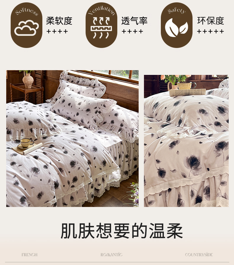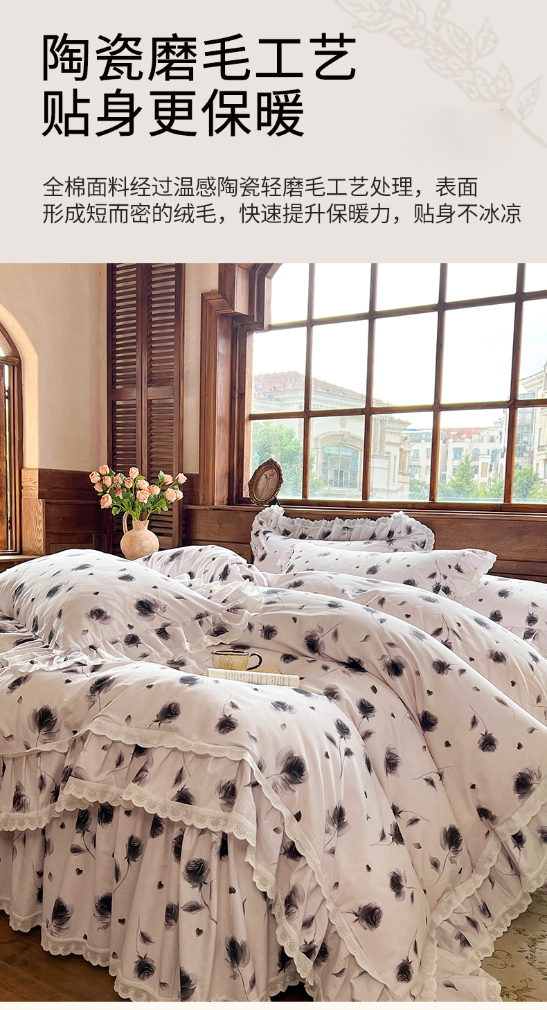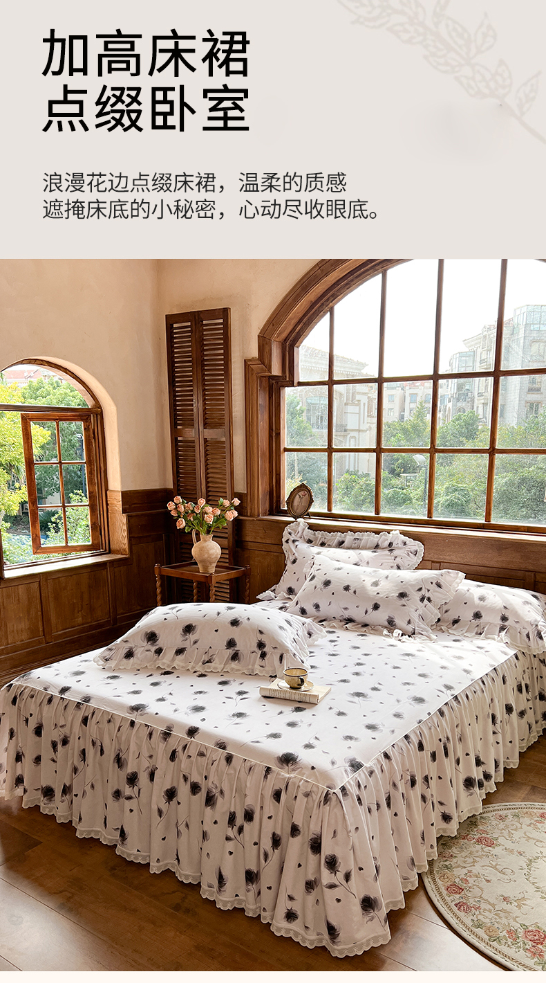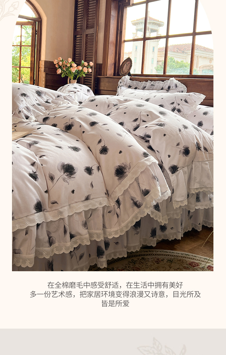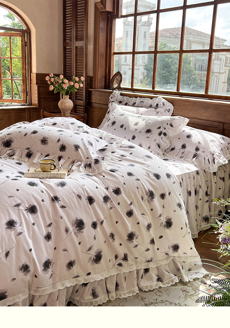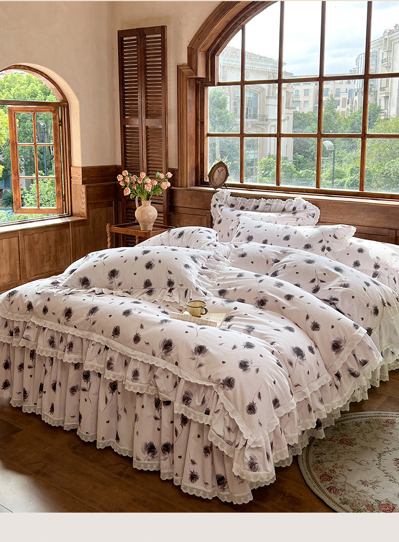 当前位置: 91家纺网 > 商品网购 > 床品套件 > 四件套 > 全棉普通四件套 > 网红馆(ck家纺) 2025新款全棉磨毛印花床裙款复古法式优雅四件套 玫瑰趣事-灰