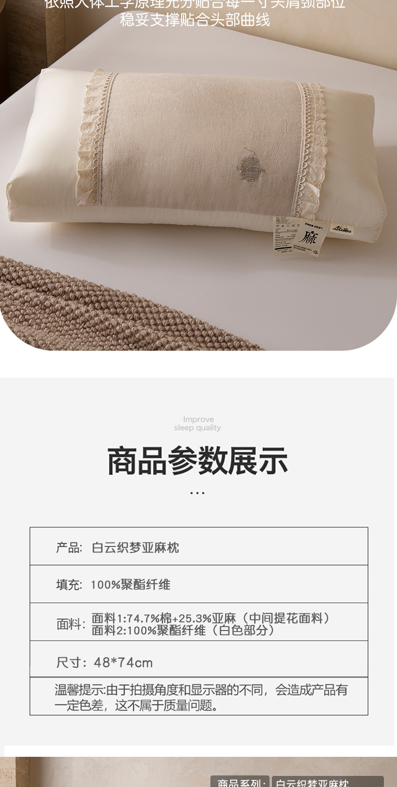 商品名称:昕科 2025新款白云织梦亚麻枕-实拍版-棉麻高低枕芯花边亚麻刺绣枕头 白云织梦亚麻枕-高枕